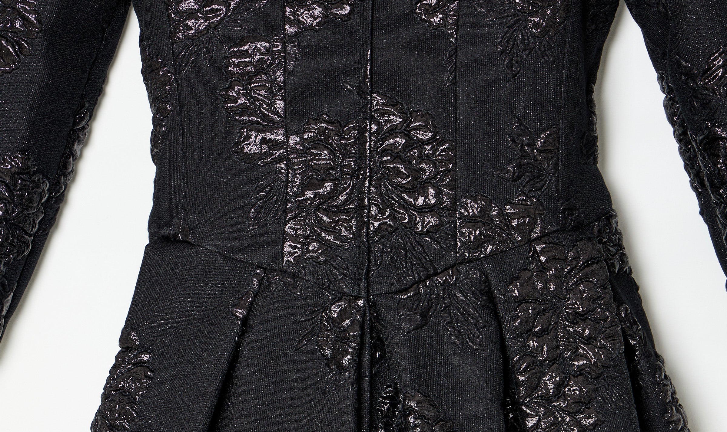 longuette dress, black, big shiny roses details, round neckline, long sleeve, zipper on the back, side pockets
