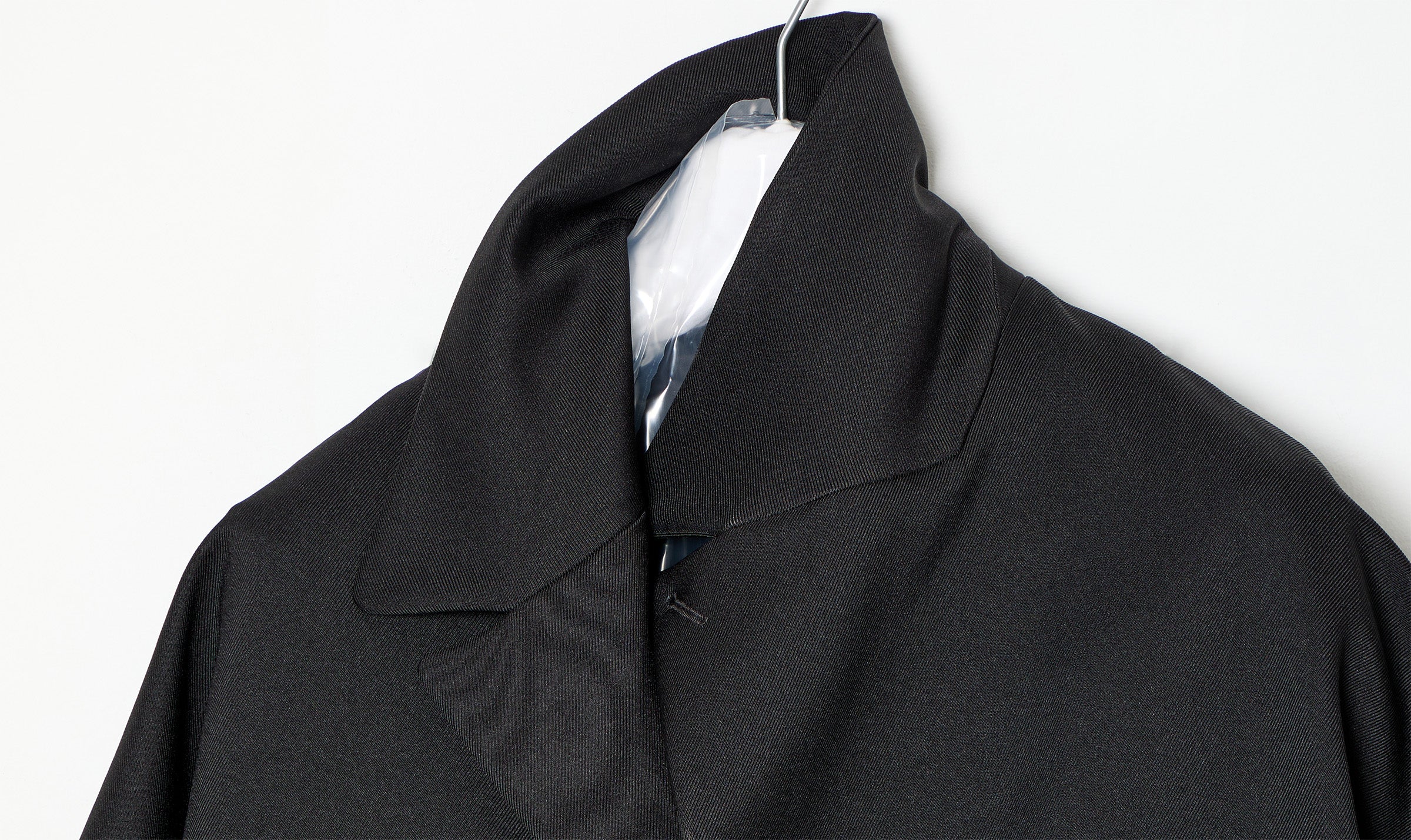 cappotto nero, forma rotonda, maniche lunghe con spalle scese, revers, chiusura con bottoni, tasche laterali con patta