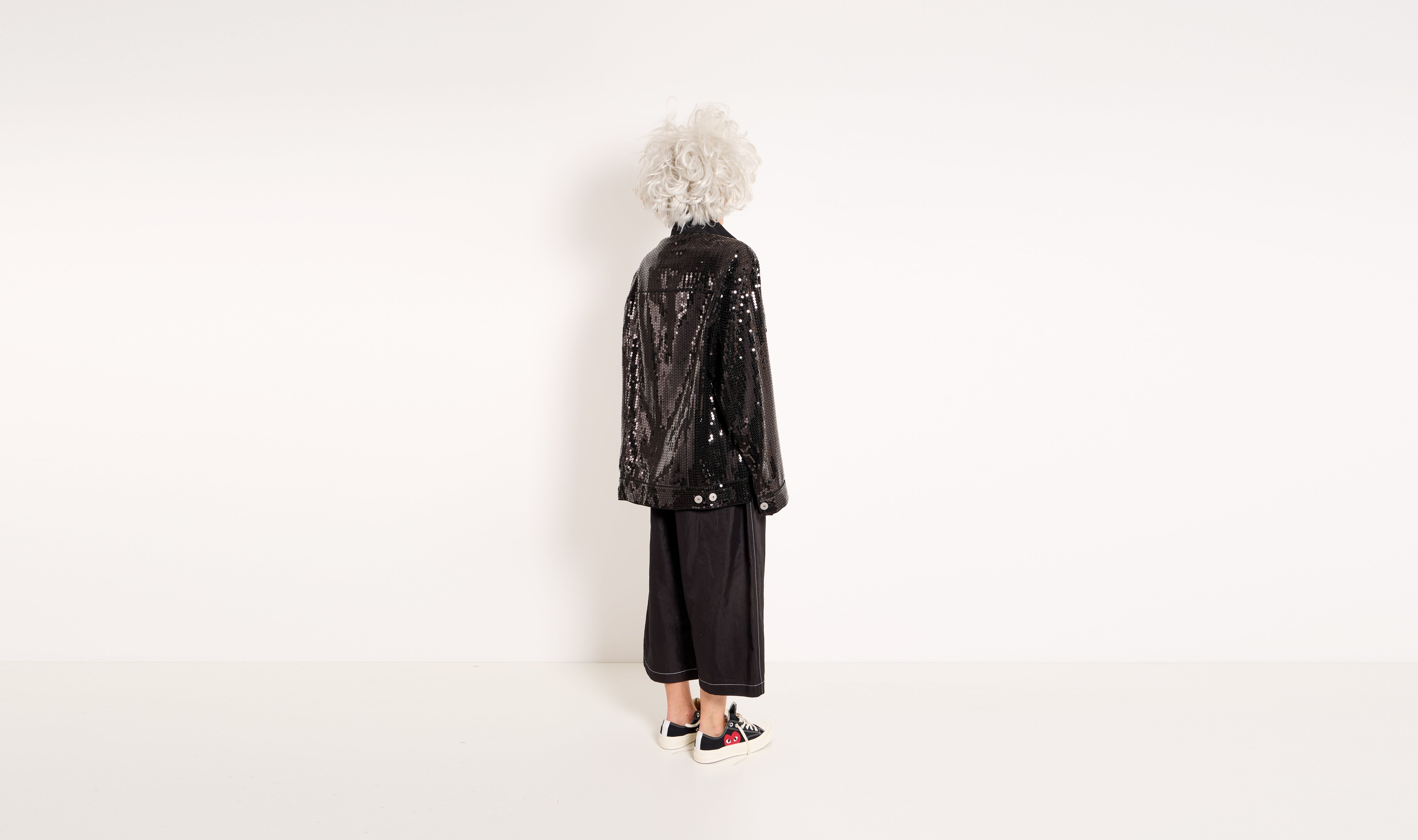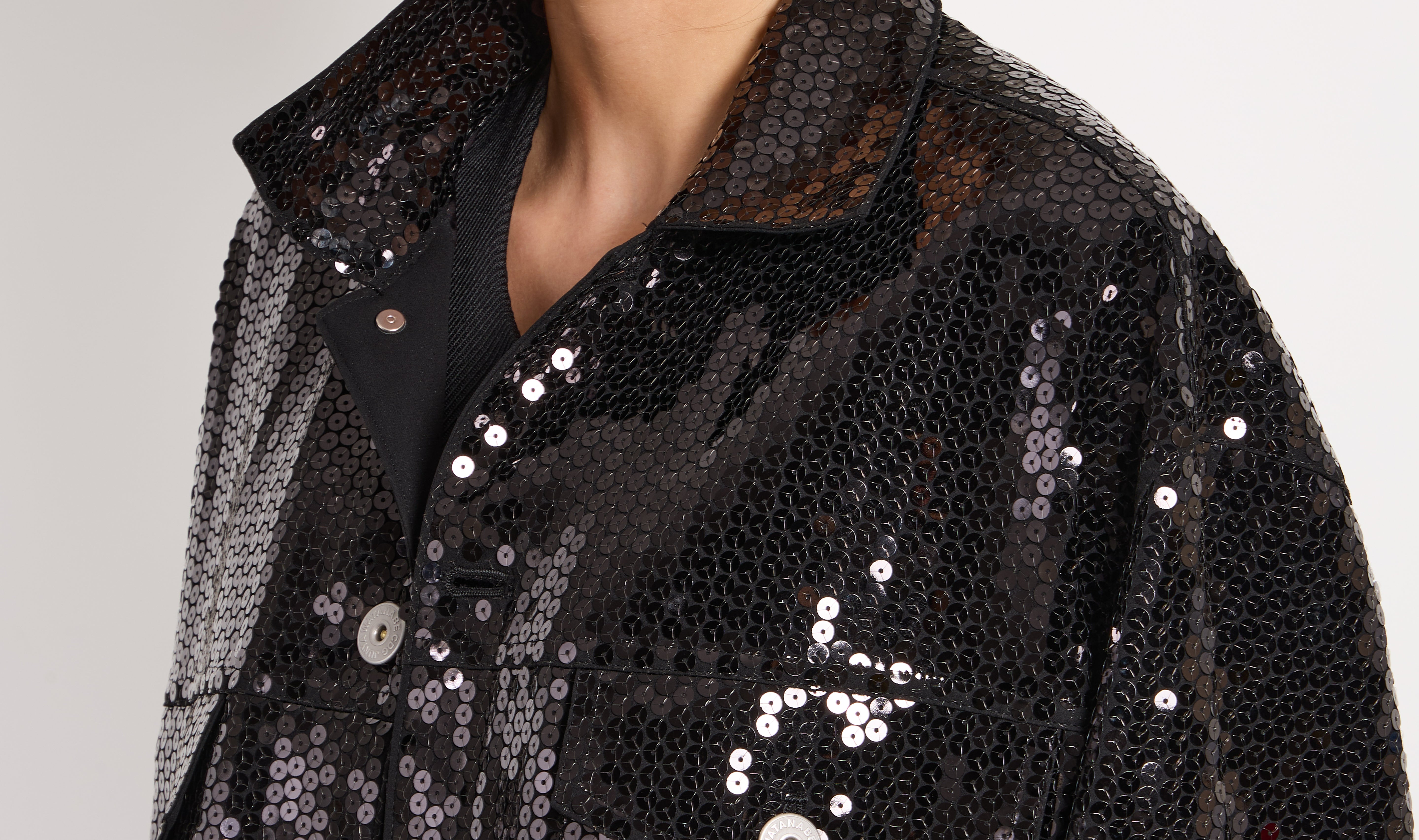 giacca nera, paillettes all over, collo regolare, chiusura con bottoni automatici, spalla scesa, tasche applicate con patta, vestibilità over