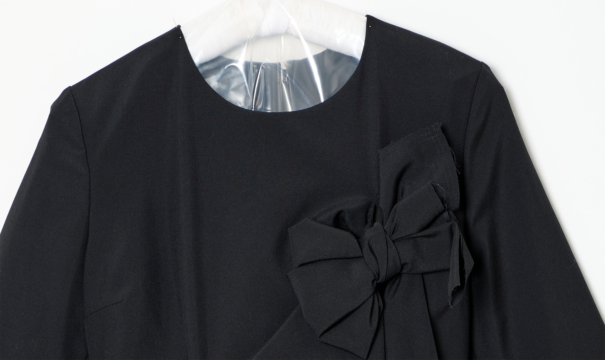 vestito longuette nero, gabardine di lana, tessuto stropicciato, svasato, 3 fiocchi cuciti sul davanti, tagliato in vita, pinces al busto, pinces in vita, tasche ai fianchi, scollo tondo, maniche 3/4, fodera in raso di poliestere sul corpino, chiusura nascosta con cerniera e gancetto sul retro, due piccoli spacchi al fondo sul davanti