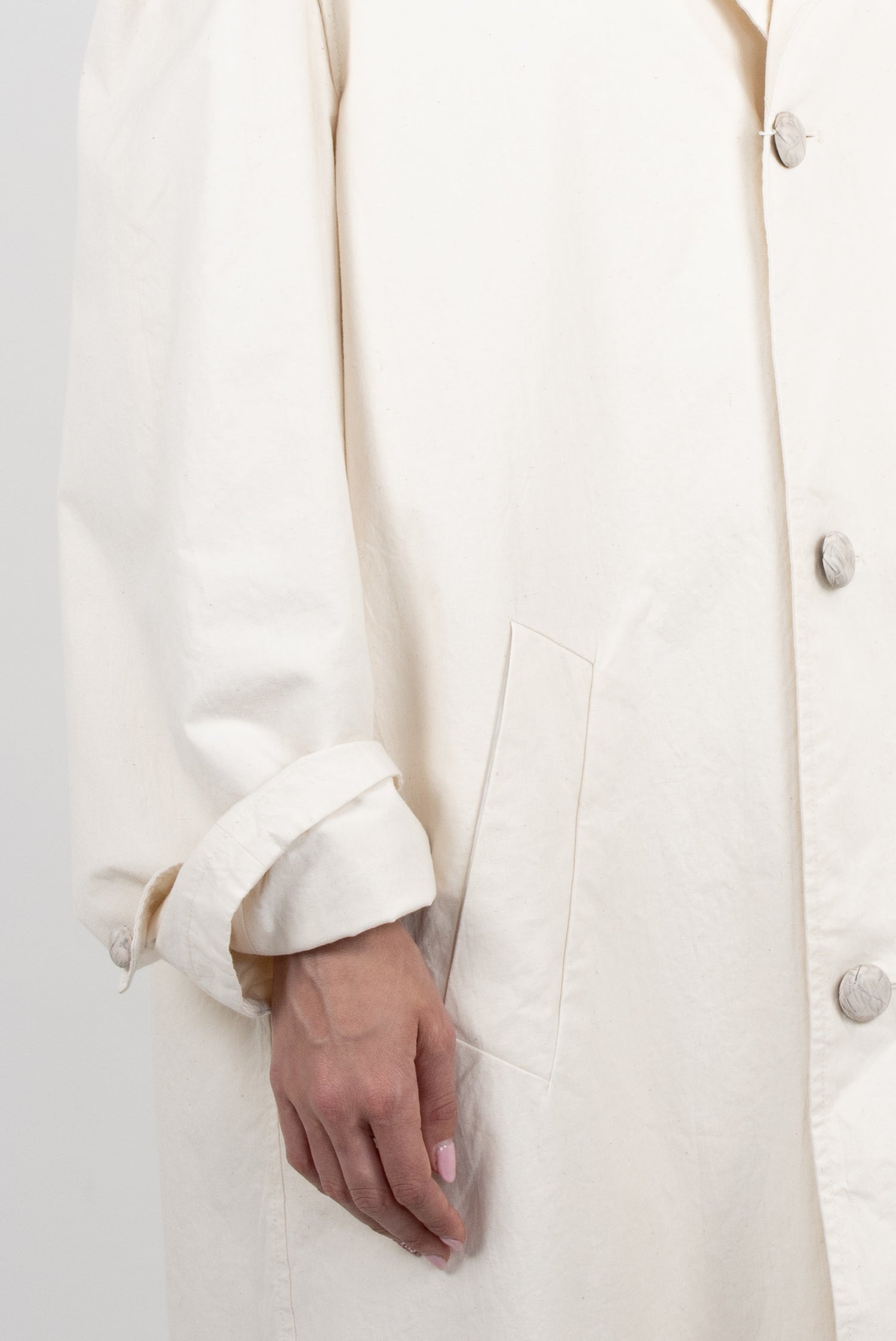 soprabito panna, tela di cotone double, rever classico, maniche lunghe, maniche scese, chiusura con bottoni, tasca interna, tasche laterali, aperto sotto le ascelle
