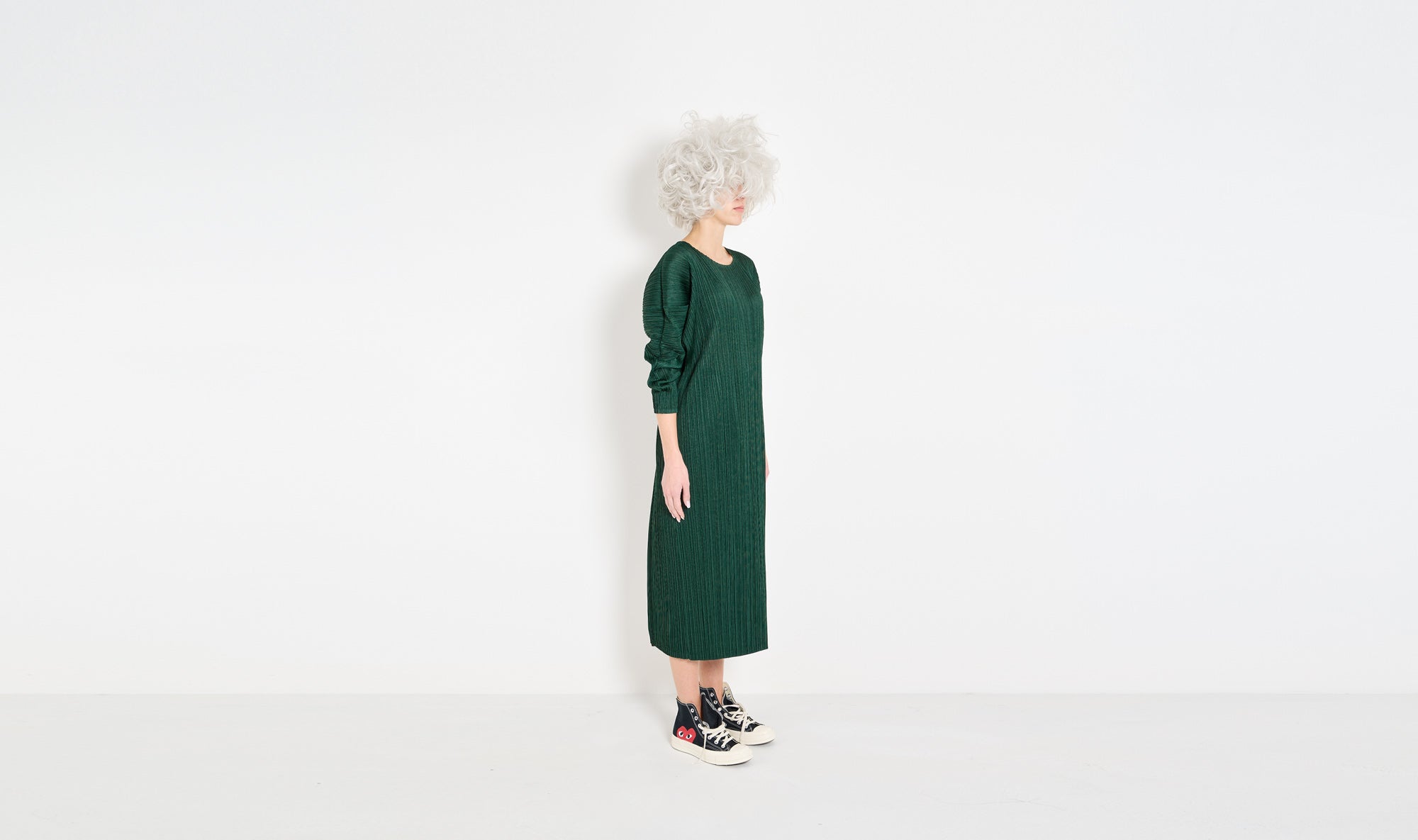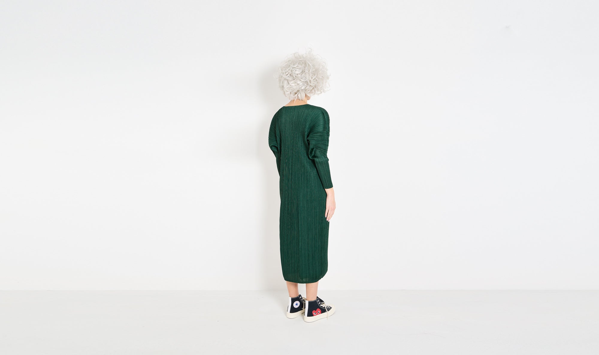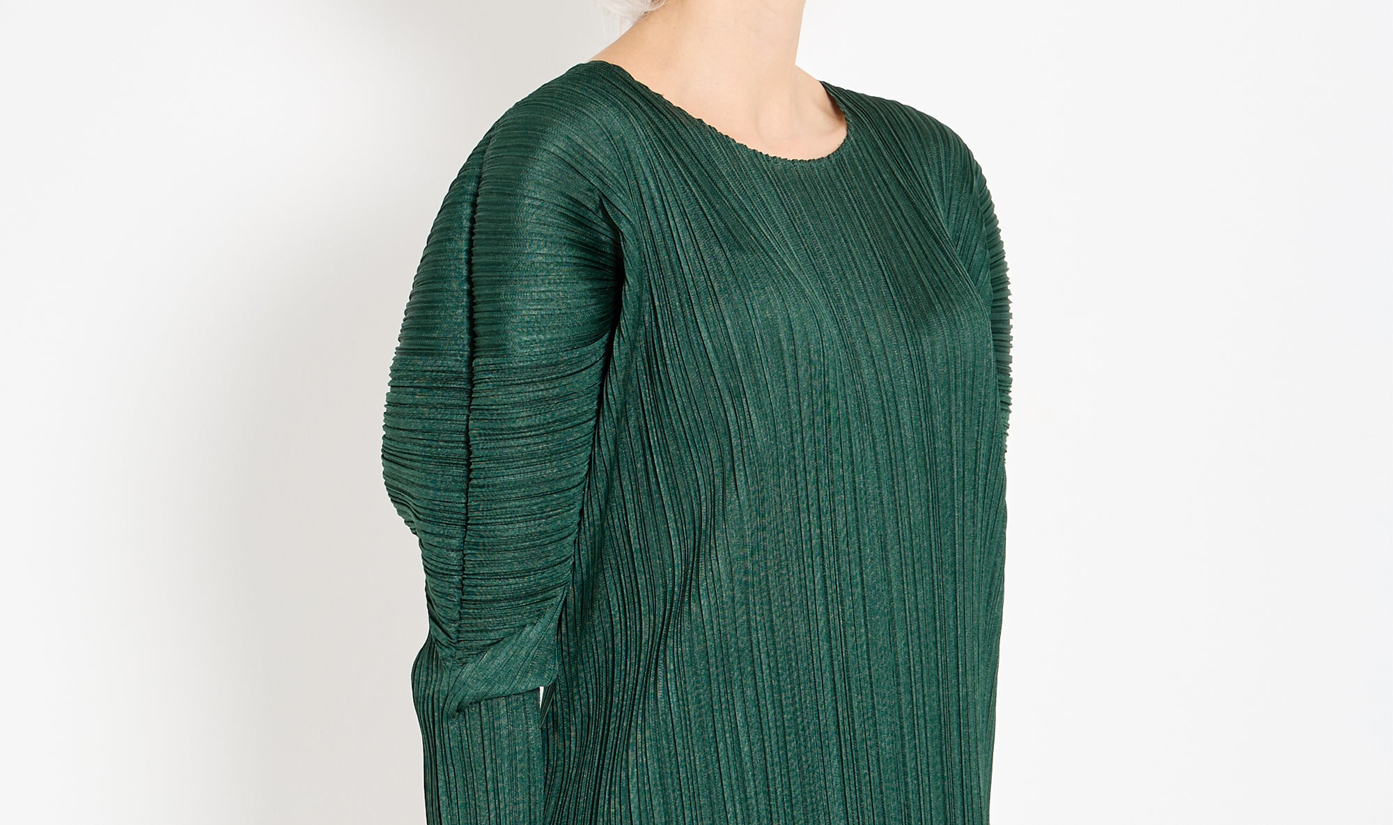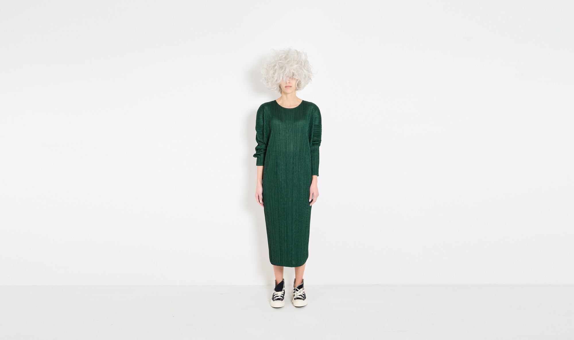 abito longuette, verde, plissé verticale in poliestere, scollo tondo, maniche a palloncino