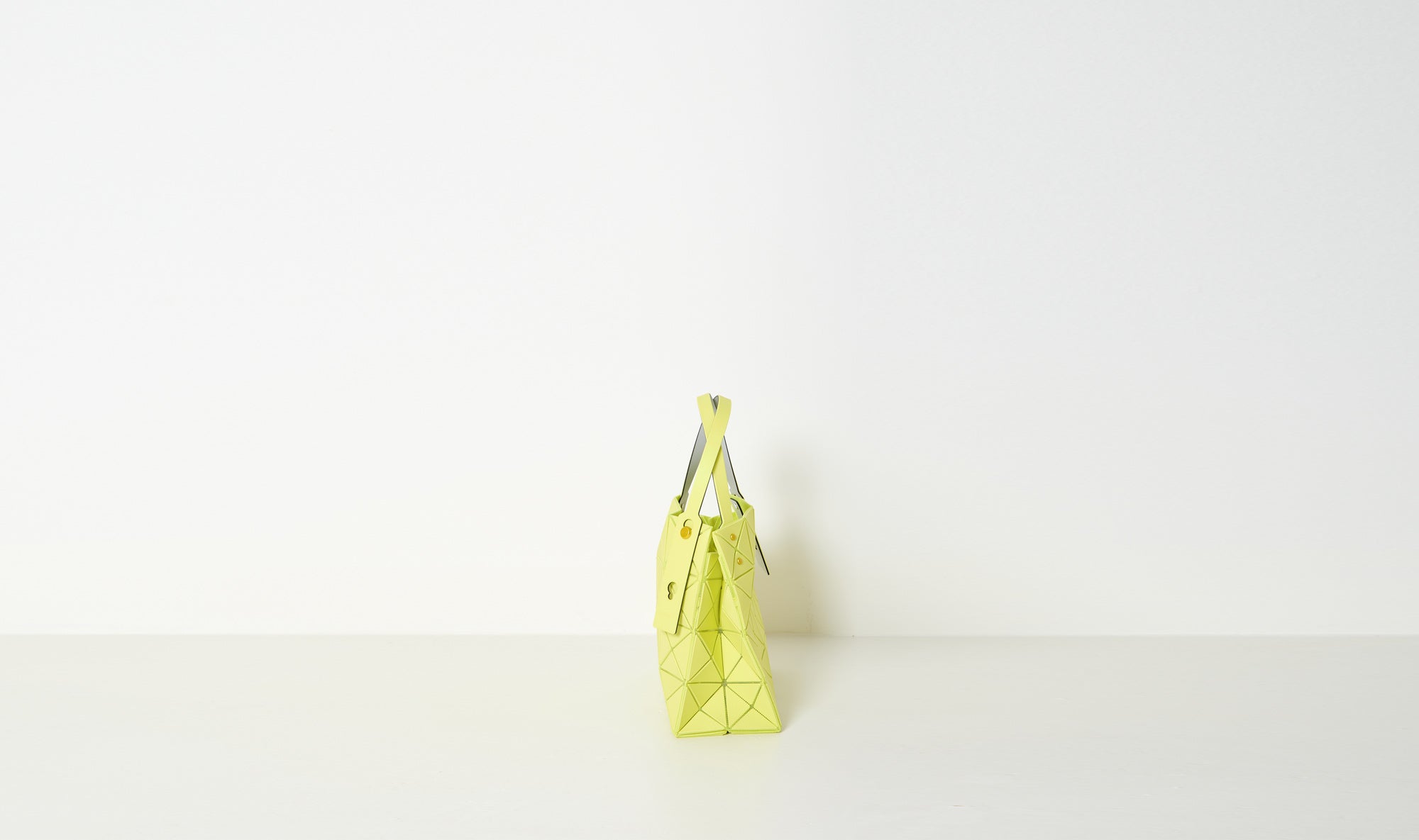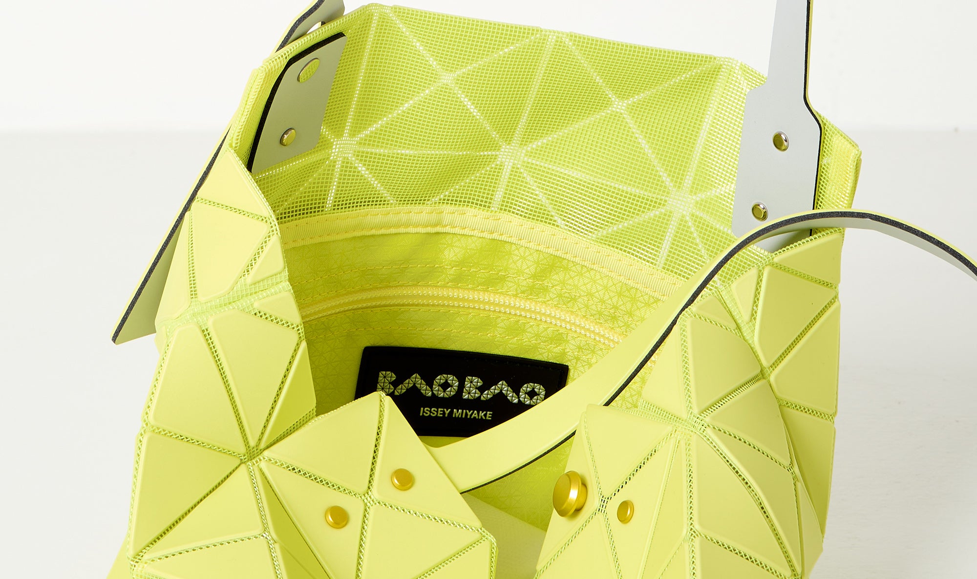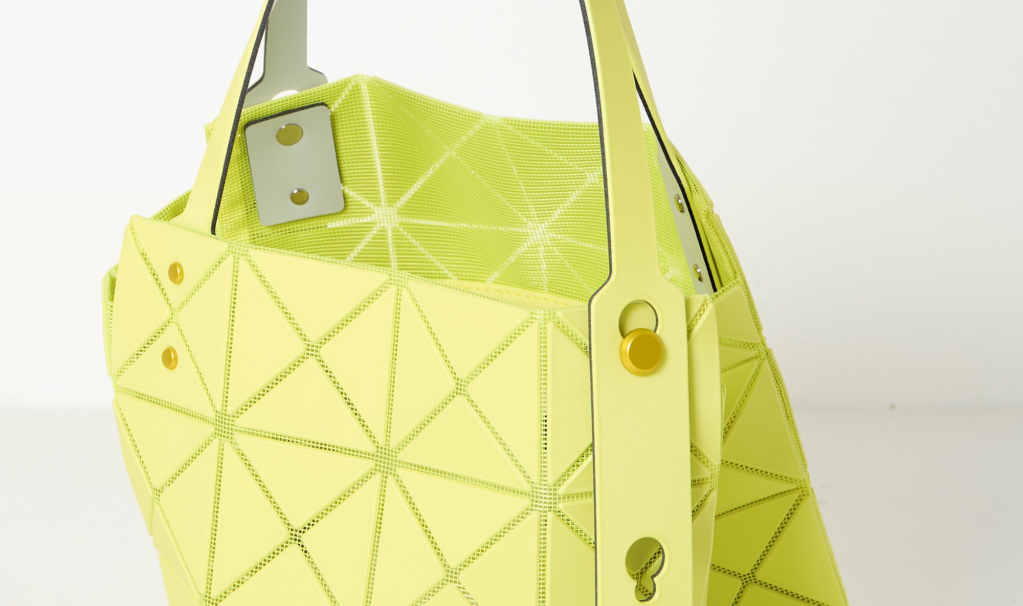 borsa lime, pannelli triangolari opachi su rete nera, aperta, logo interno, manici regolabili, piccola tasca interna
