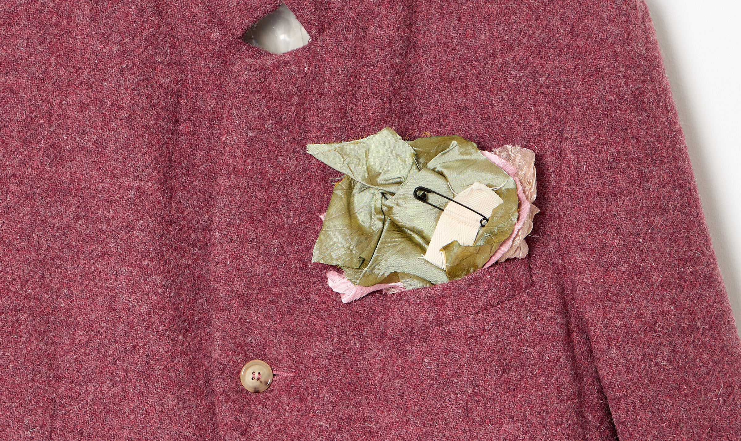 giacca color bordeaux, lana, fodera in cotone, collo alto, tasche con patta, tasca a filetto, chiusura leggermente curva con bottoni sul davanti, doppiopetto, orlo e polsini tagliati a vivo, spacchi laterali posteriori, spilla a rosa