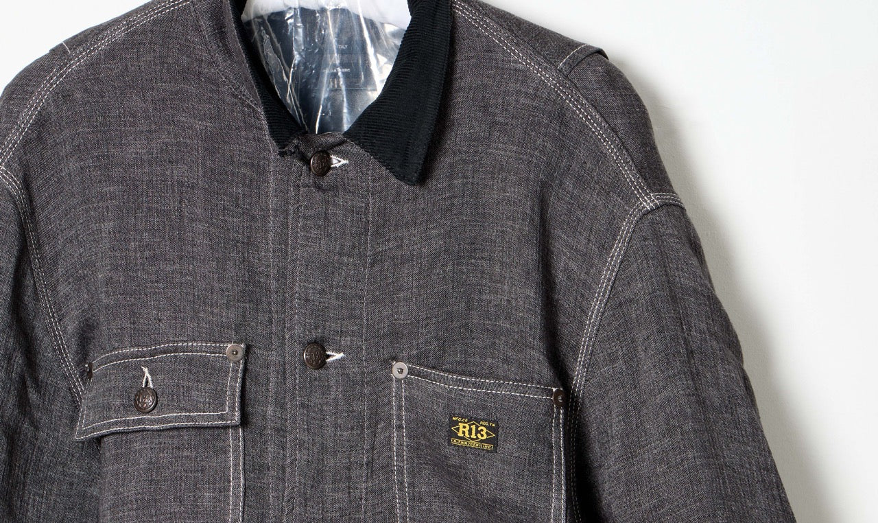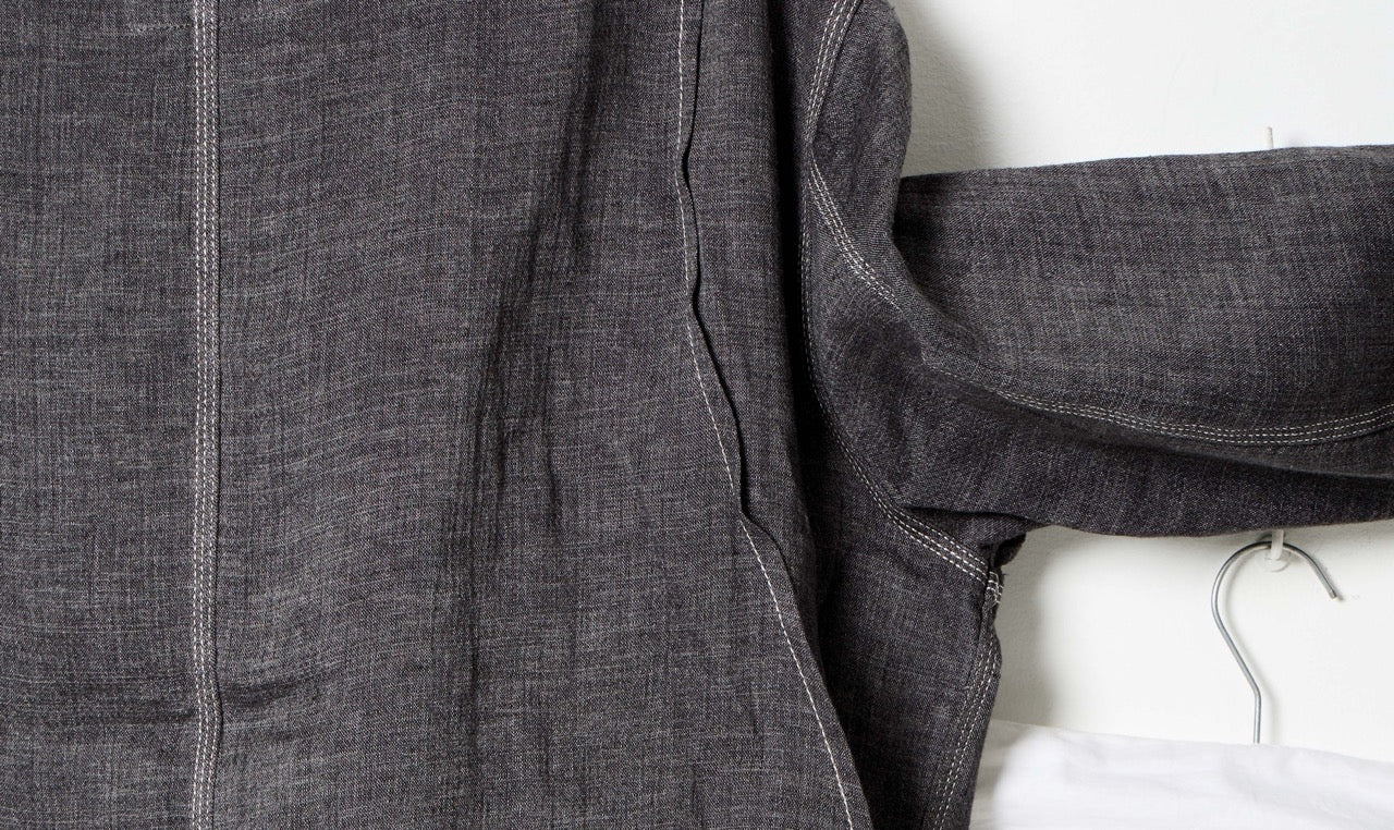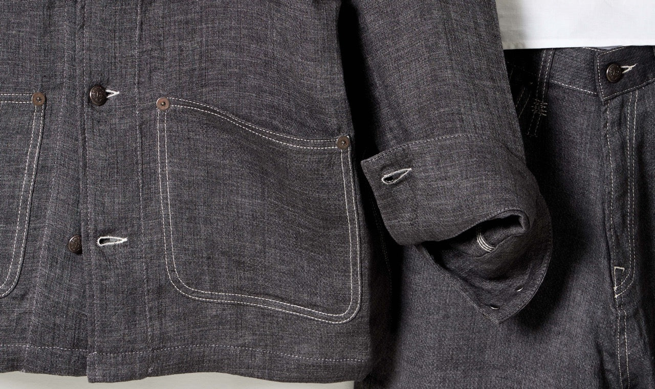 relaxed chore charcoal grey linen trousers and jacket look