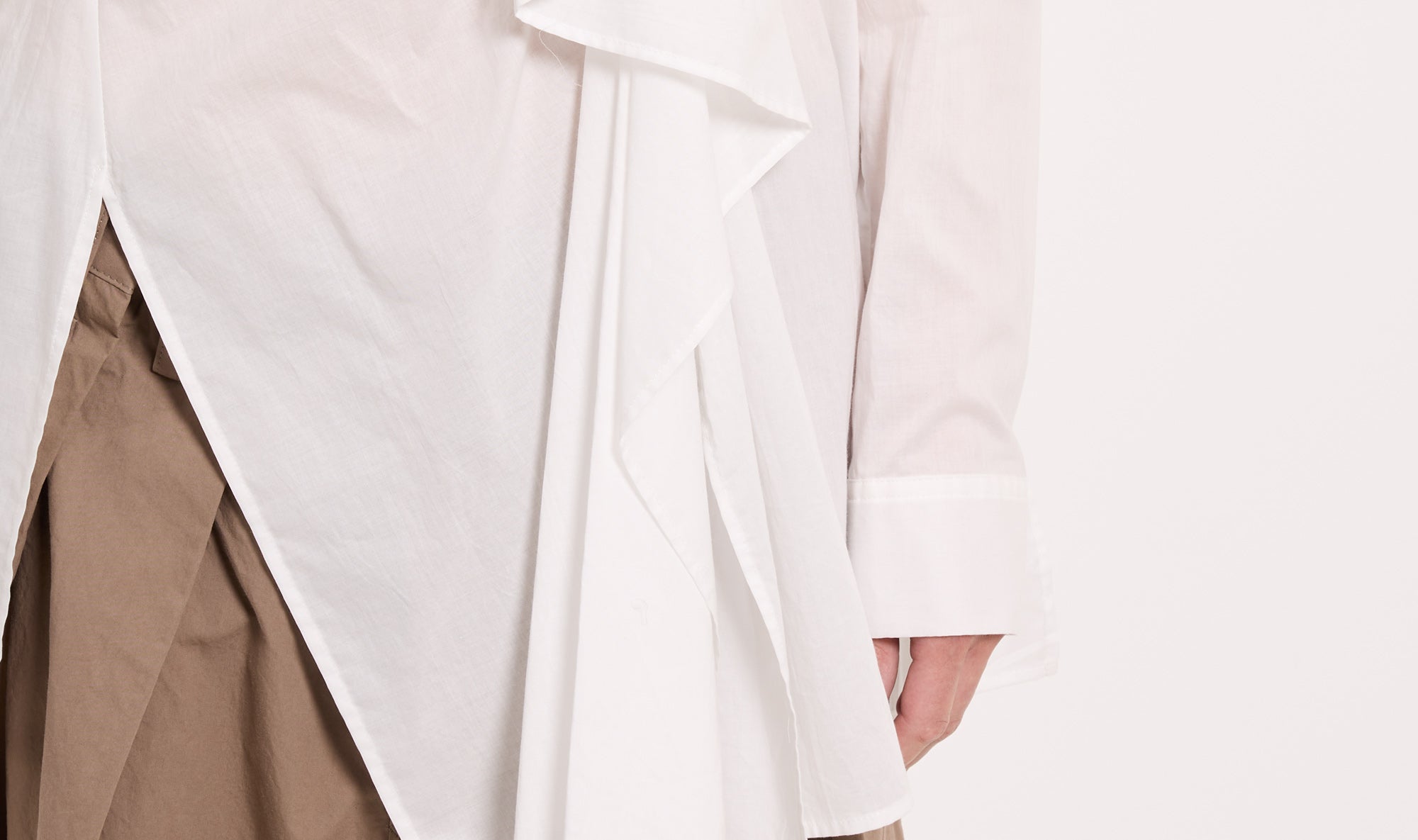 camicia bianca, cotone leggero, chiusura con bottoni automatici nascosti, pannello asimmetrico arricciato sul davanti, collo regolare a camicia, maniche lunghe con polsino, spacchetti laterali al fondo
