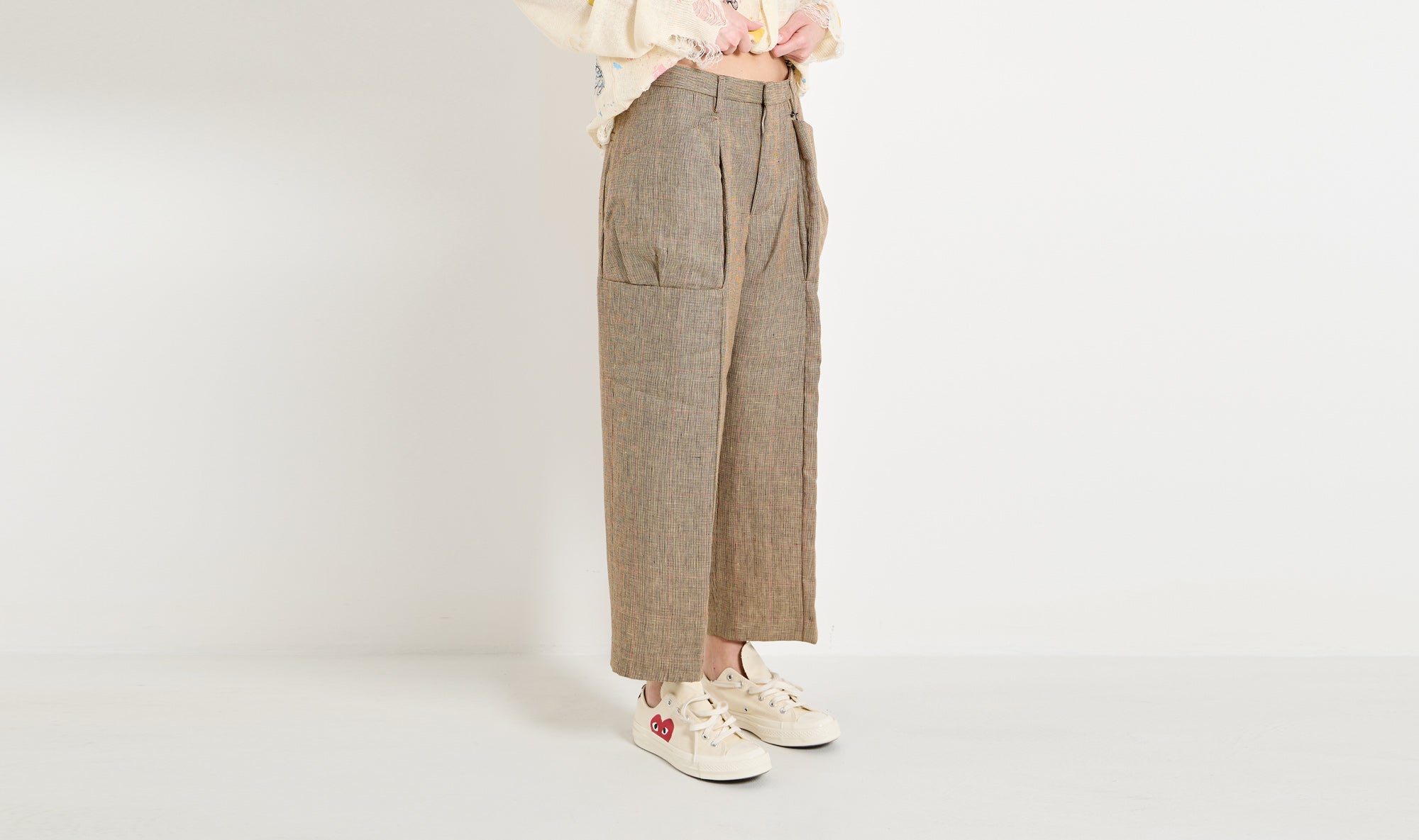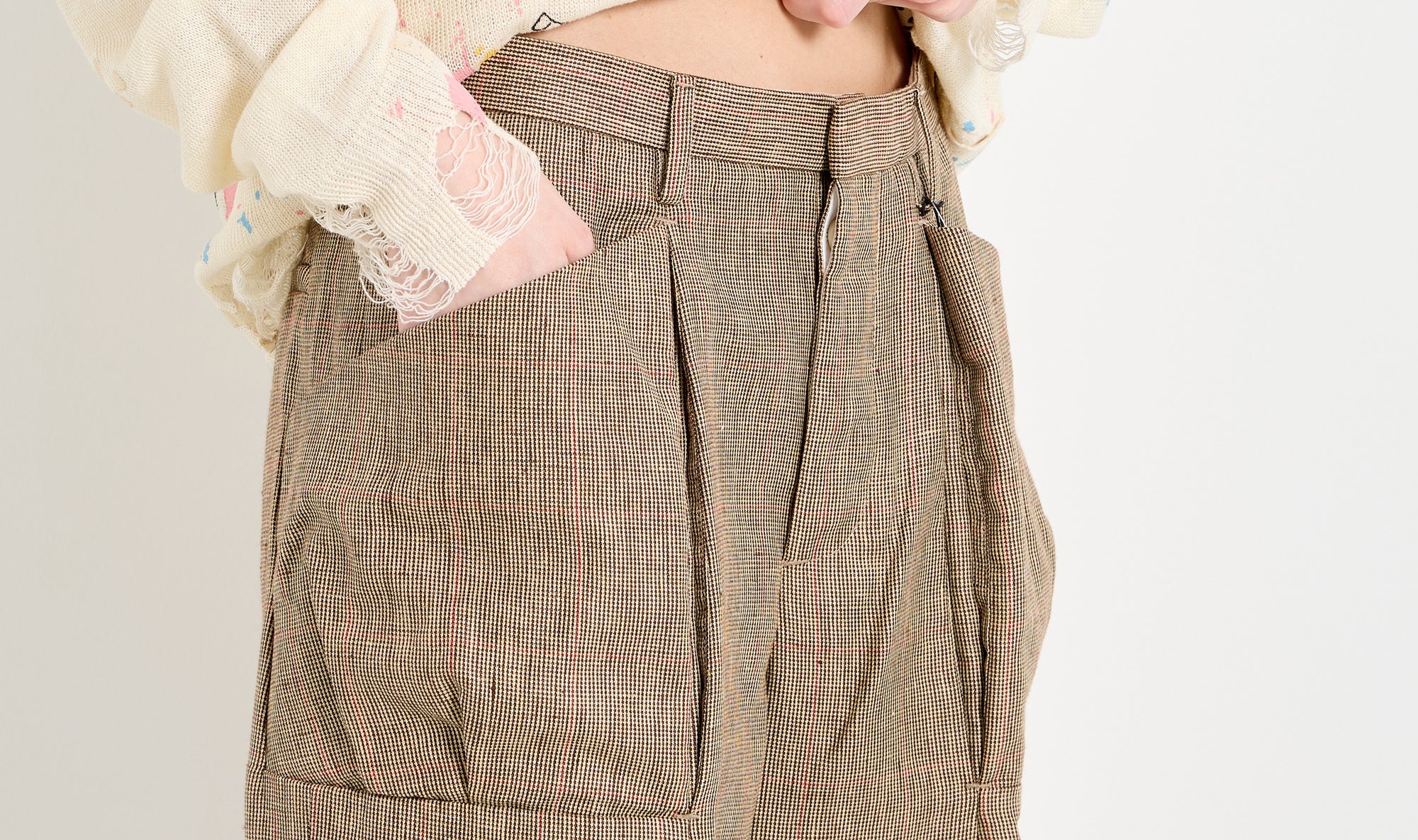 beige trousers, red big check pattern, small pied de poule pattern, buttons and zipper fastening, patched pockets, belt loops