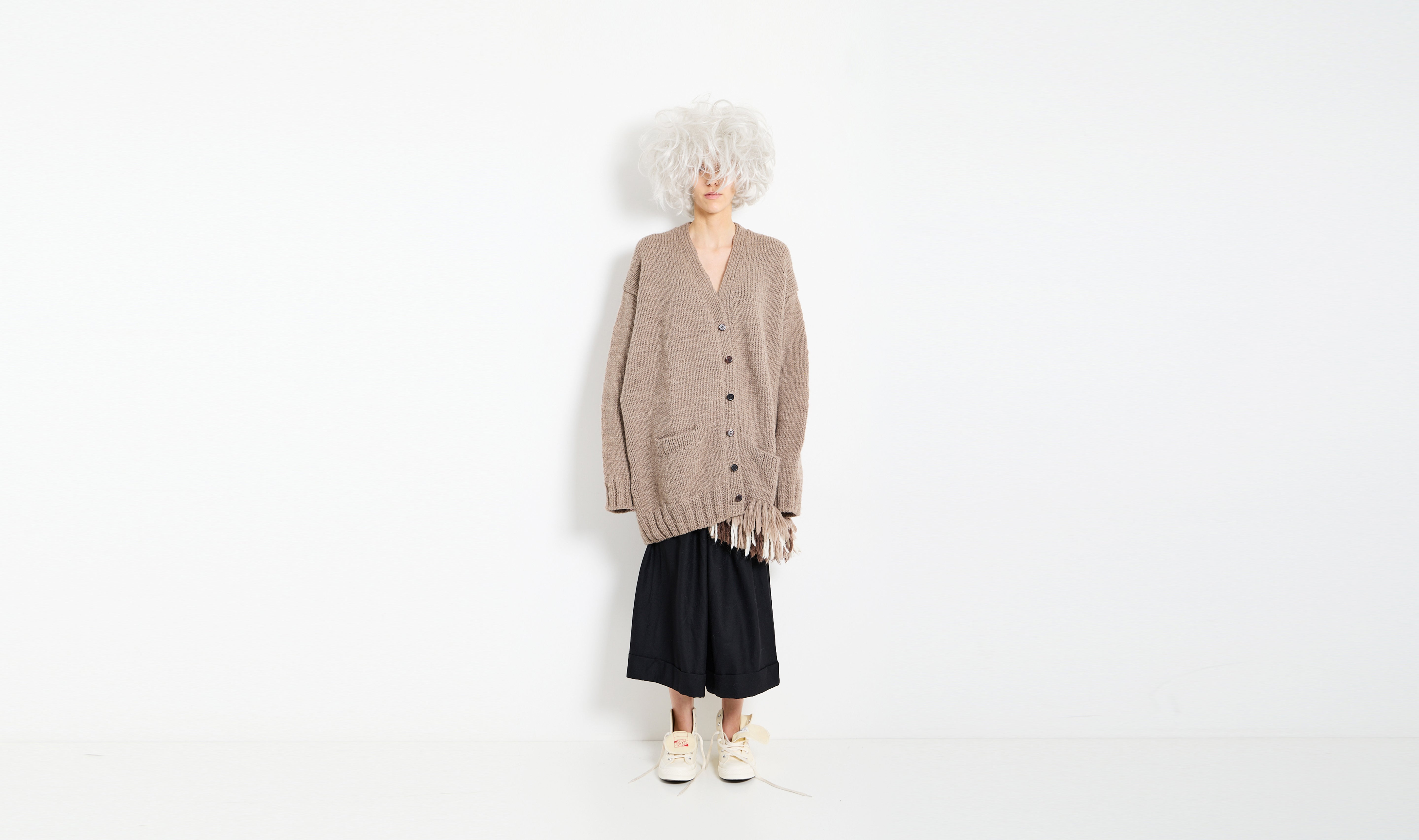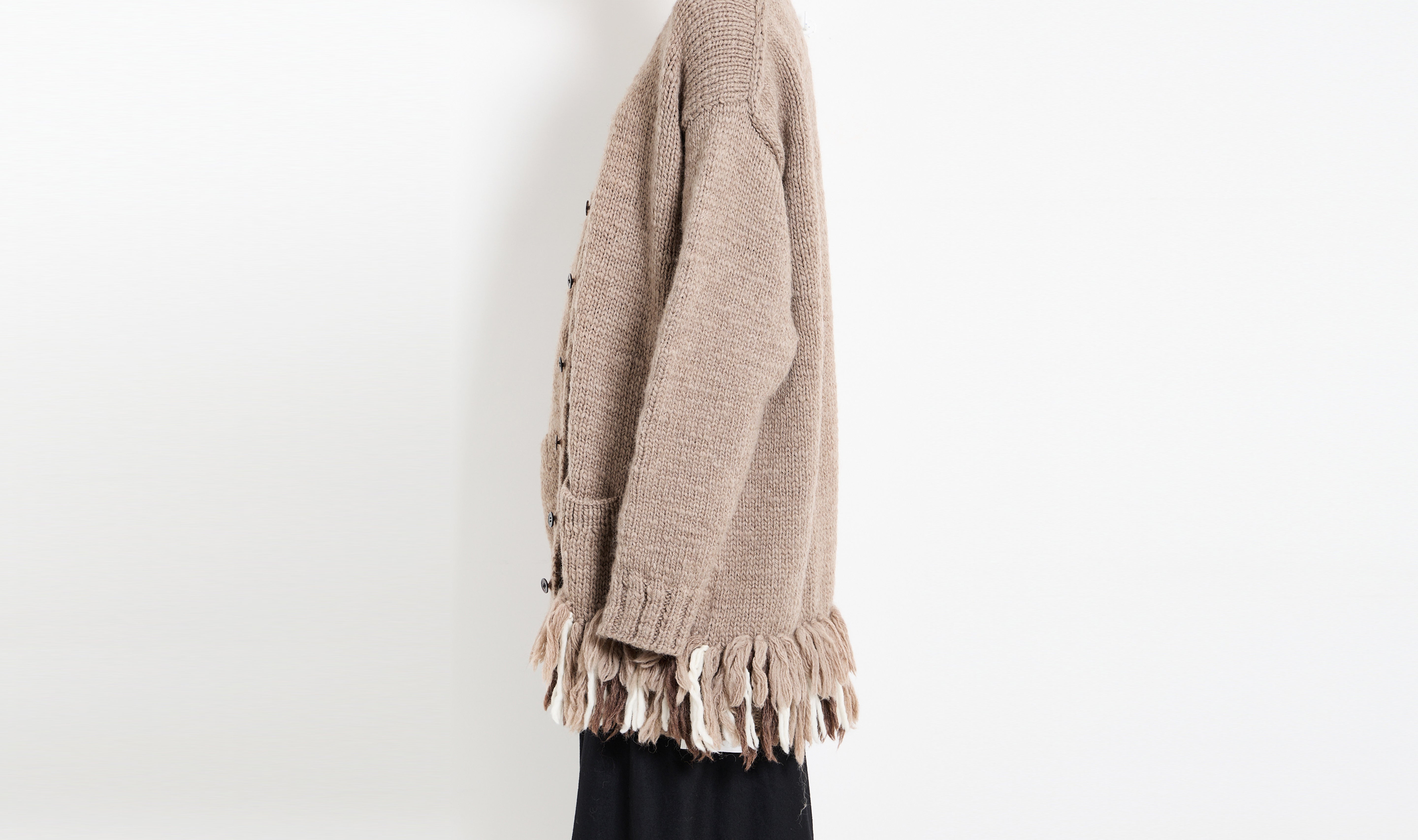 beige cardigan, wool stockinette, v shaped neckline, buttons fastening, front pockets, ribbed hem and cuffs, side fringes, oversized