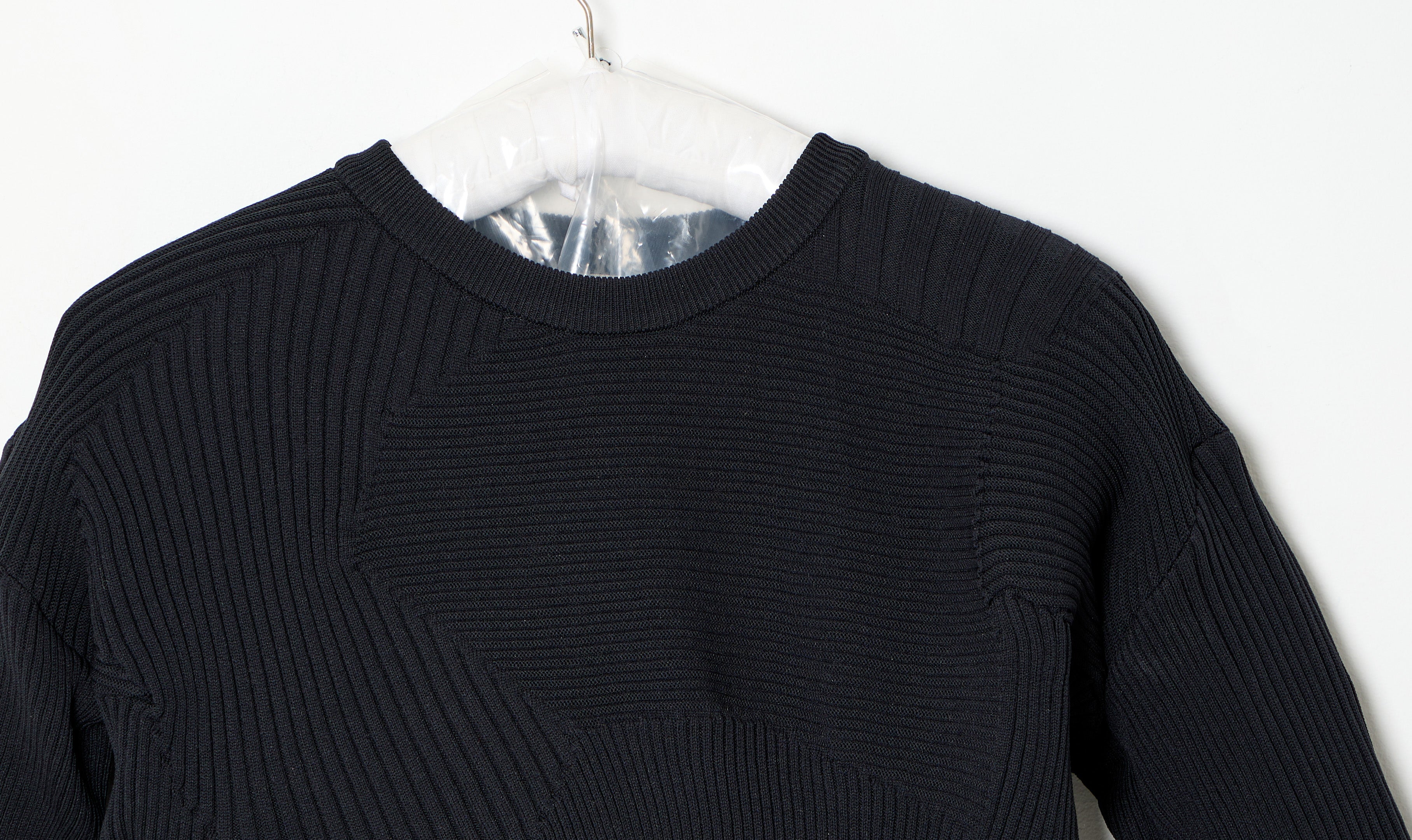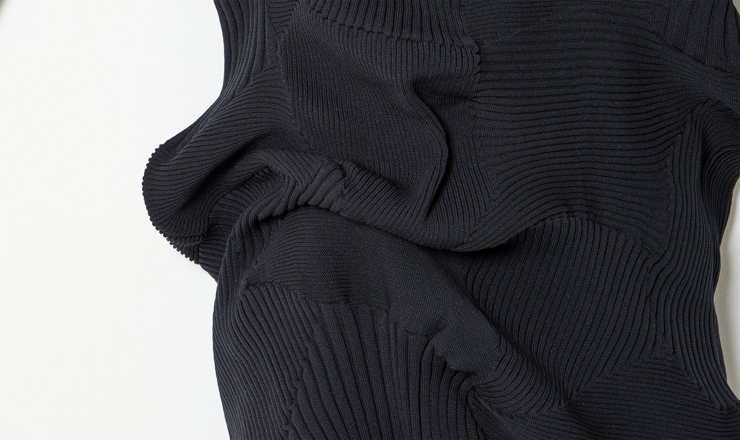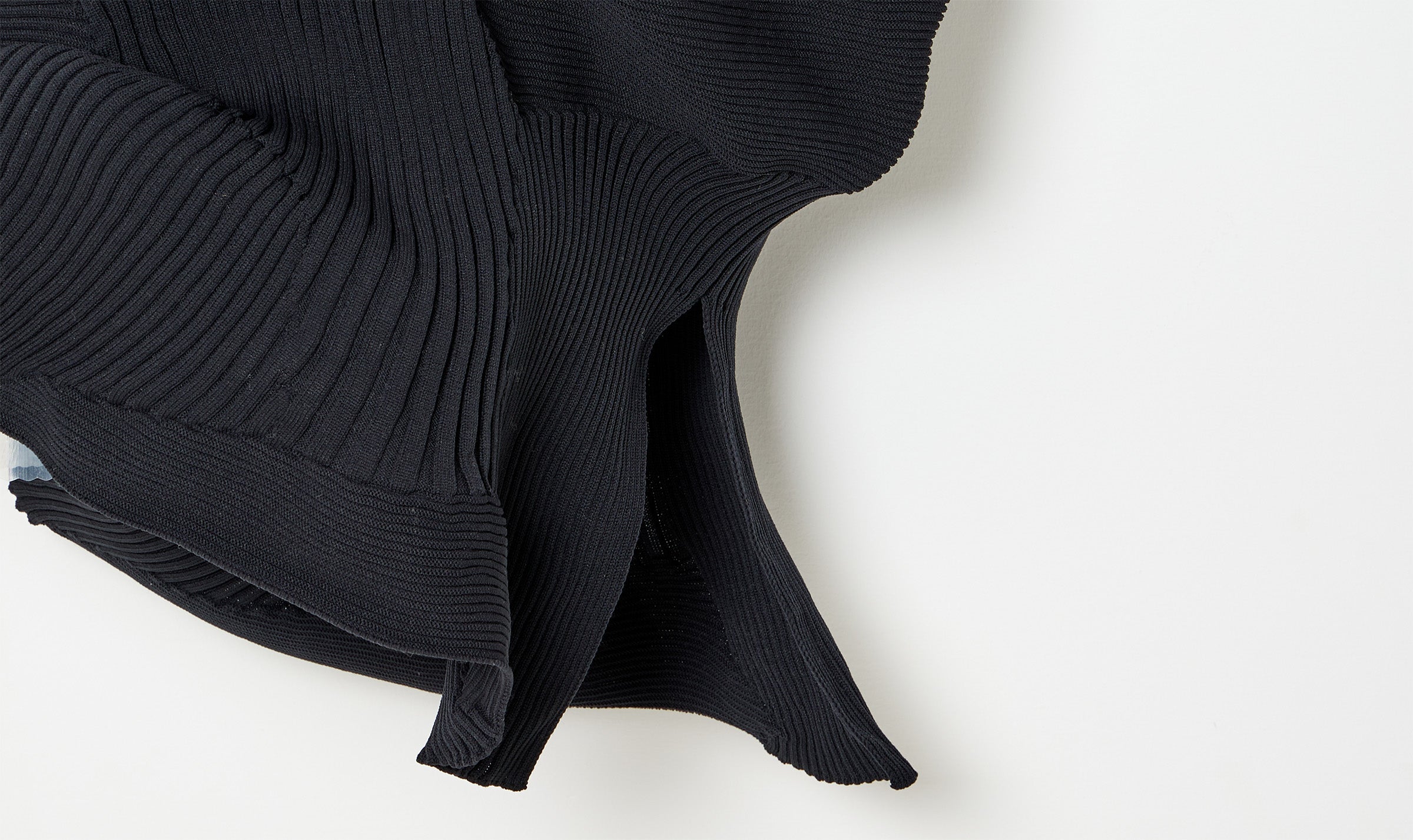 black longuete dress, ribbed fabric patchwork, asymmetrical, round neck, long sleeves, asymmetrical hem with side vent