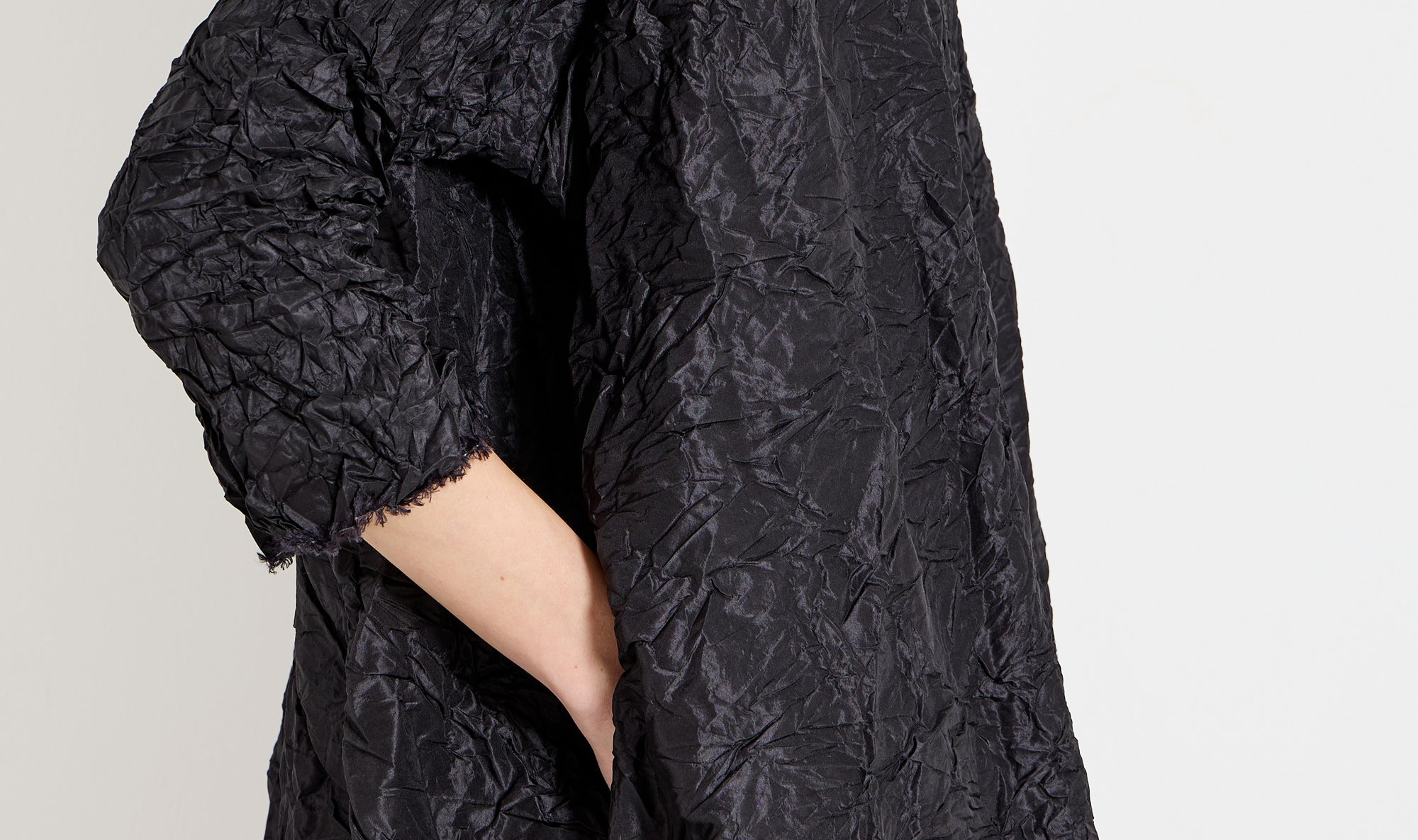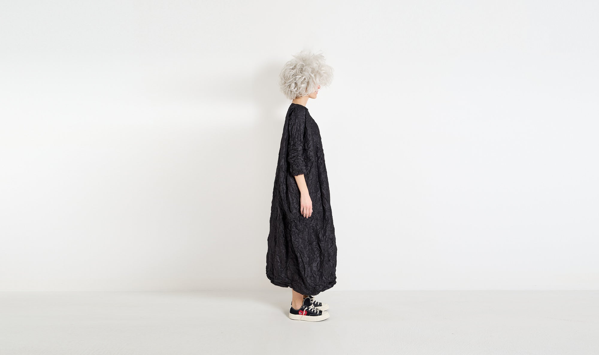 longuette dress, washed and wrinkled black taffetà, square neckline, short sleeves with selvedge bottom, side pockets, holes that can be used to shorten the dress, sash from the same fabric