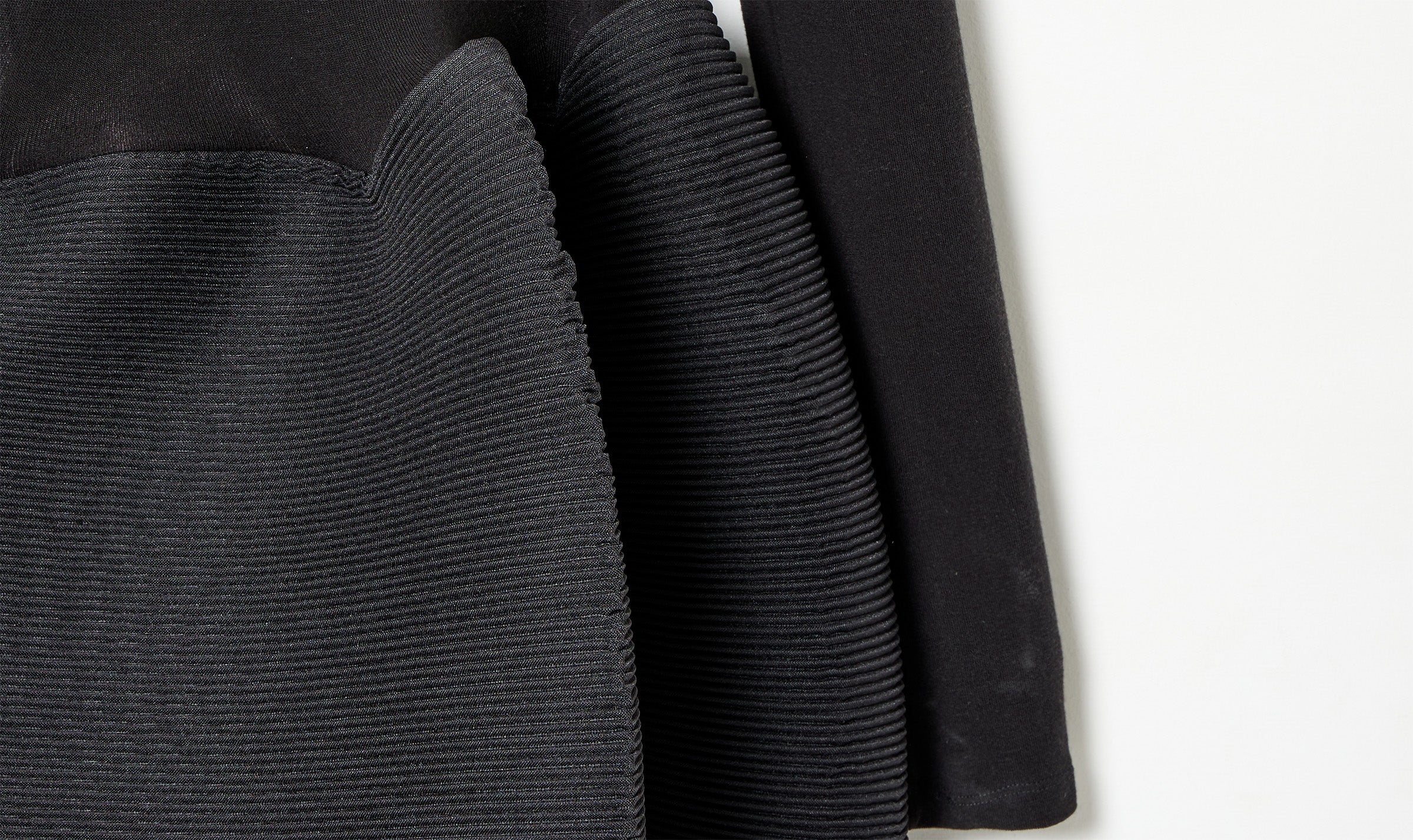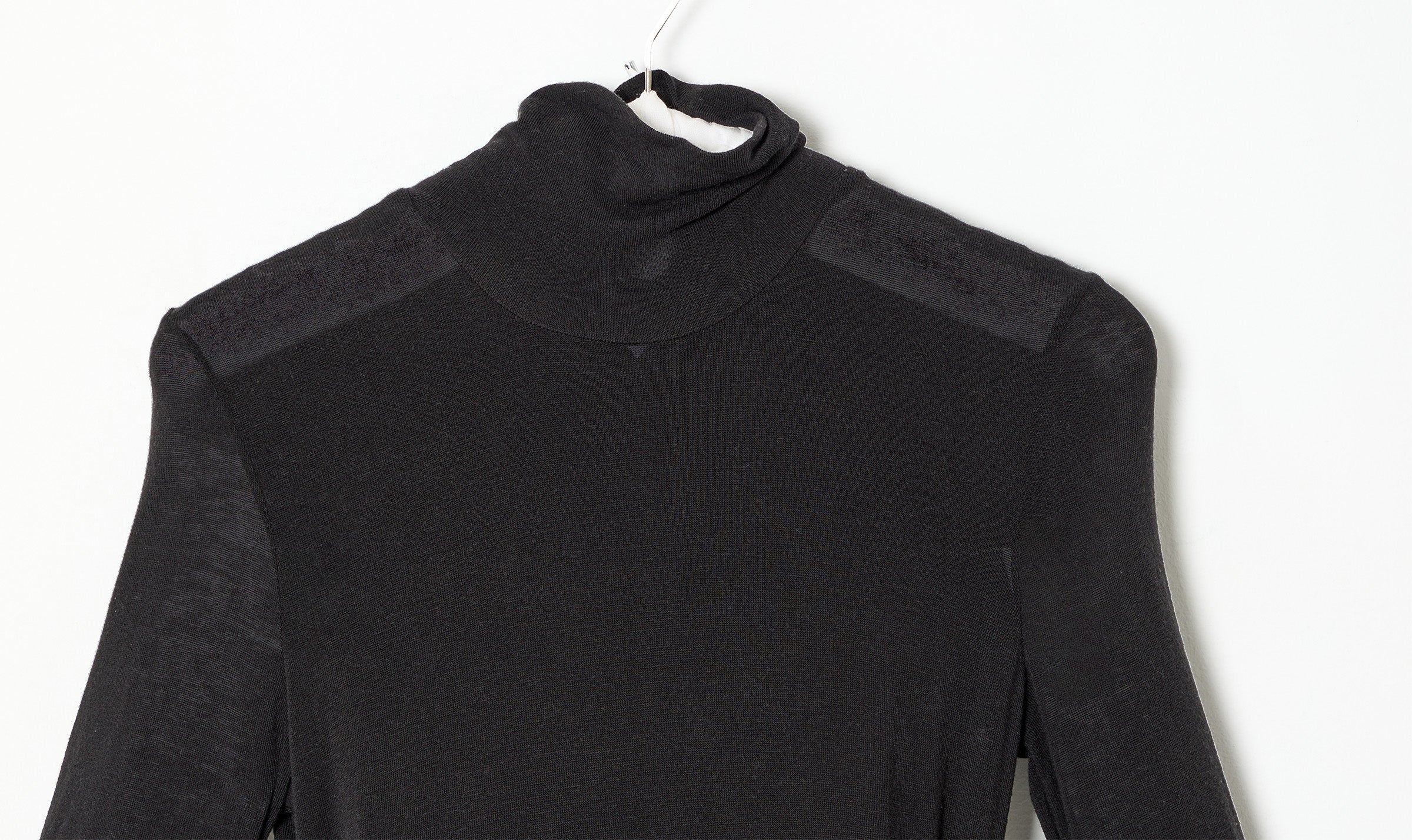 black dress, slim fitted bodice, high neck, long sleeves