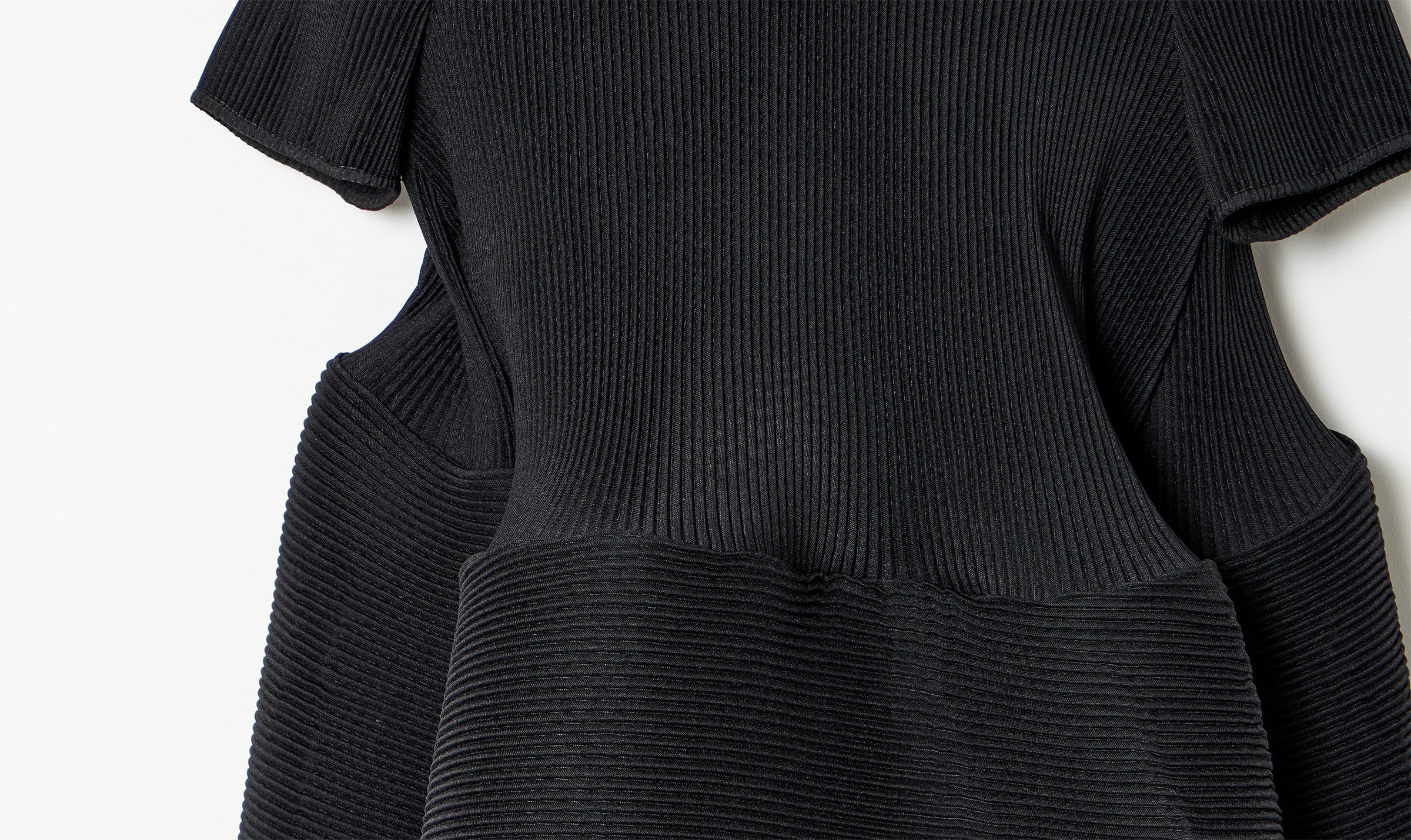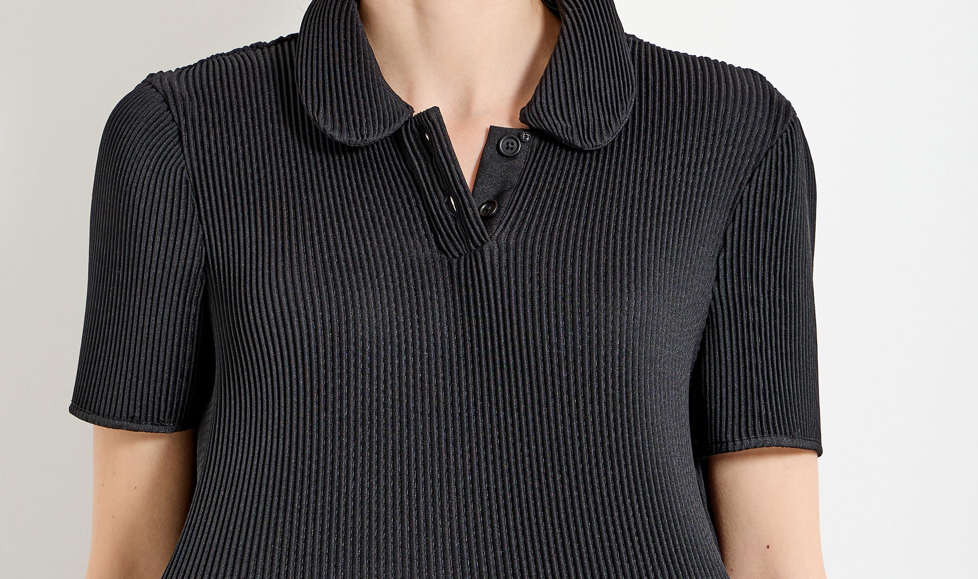 dress, black, pleated, regular small collar, short sleeves, half buttons fastening, cut at the waist