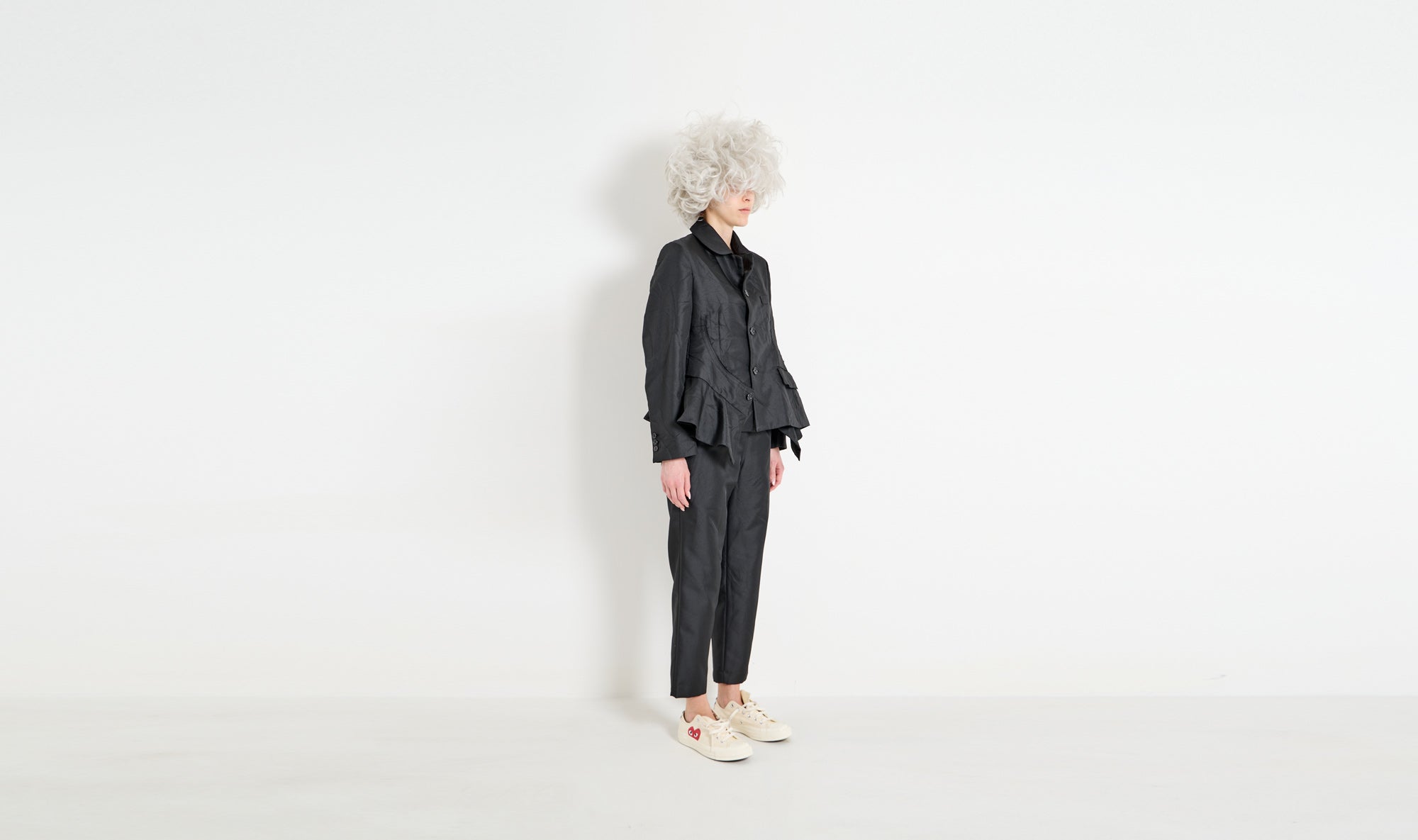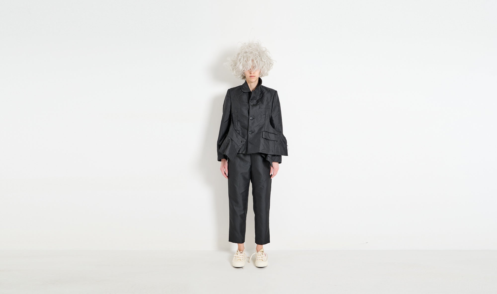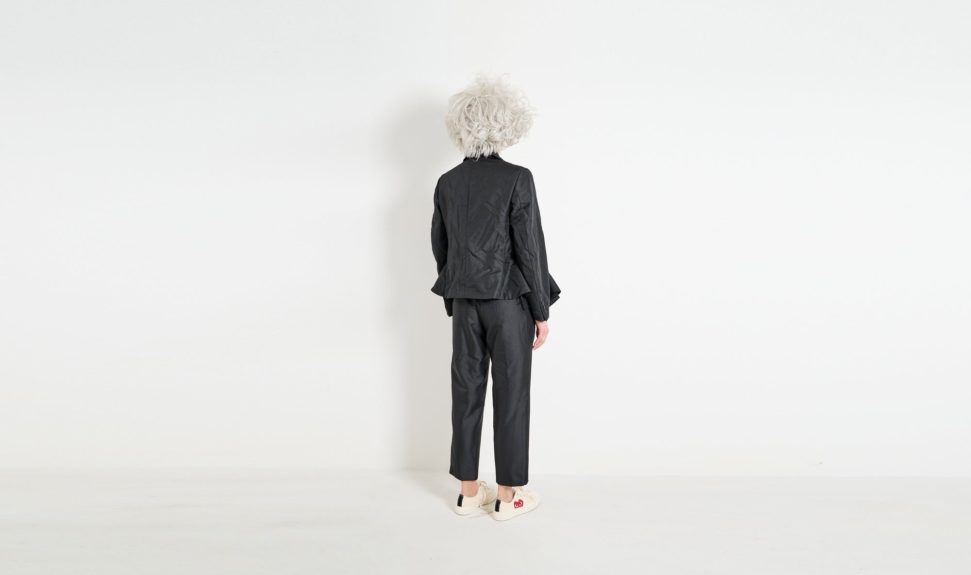 black jacket, crumpled, round collar, buttons fastening, two pockets