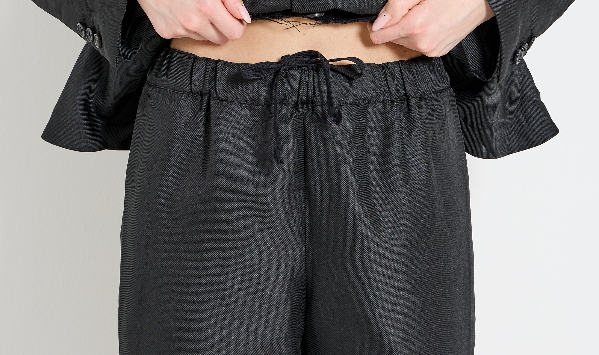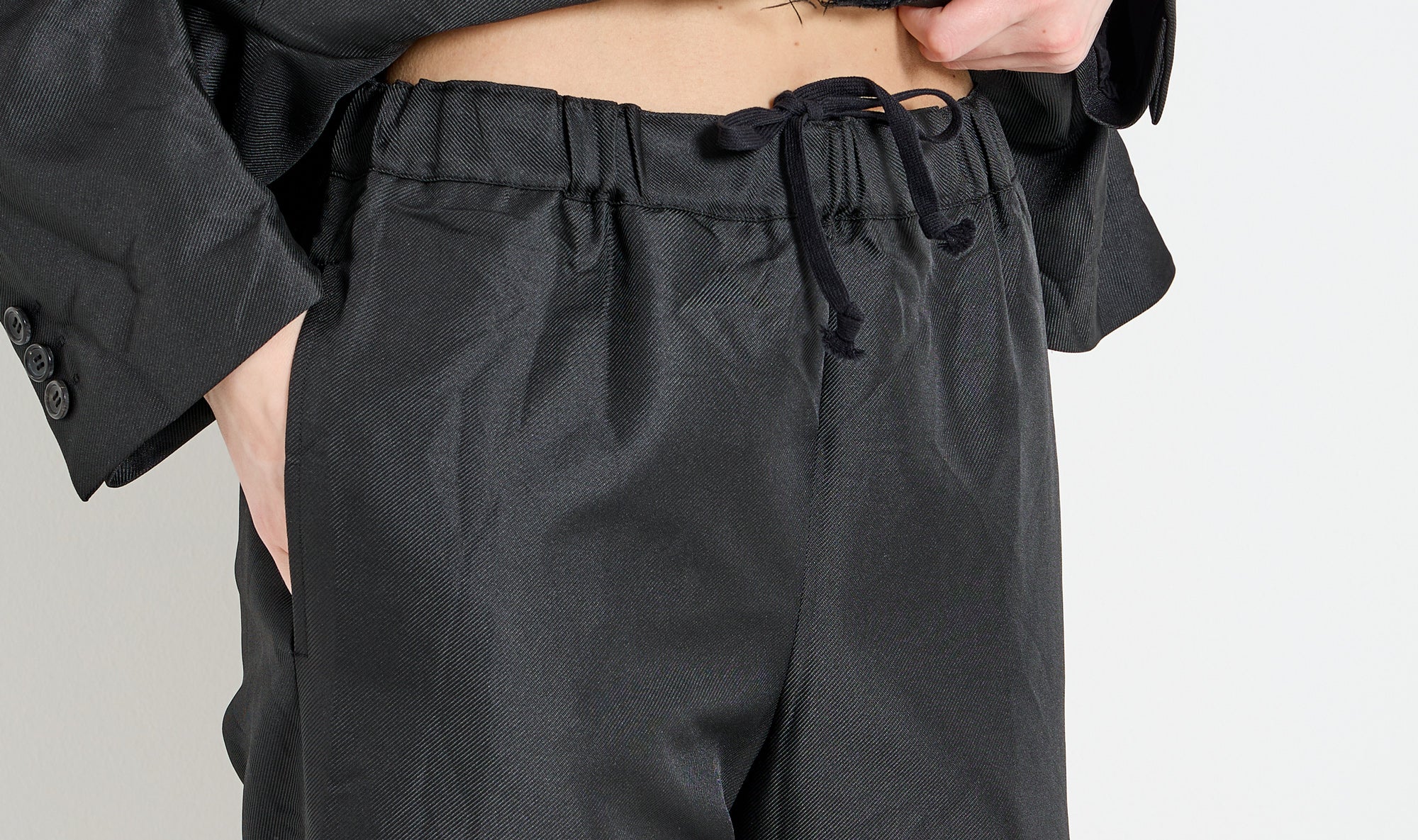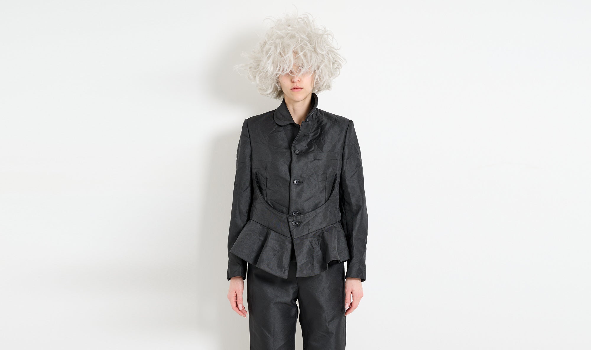black jacket, crumpled, round collar, buttons fastening, two pockets