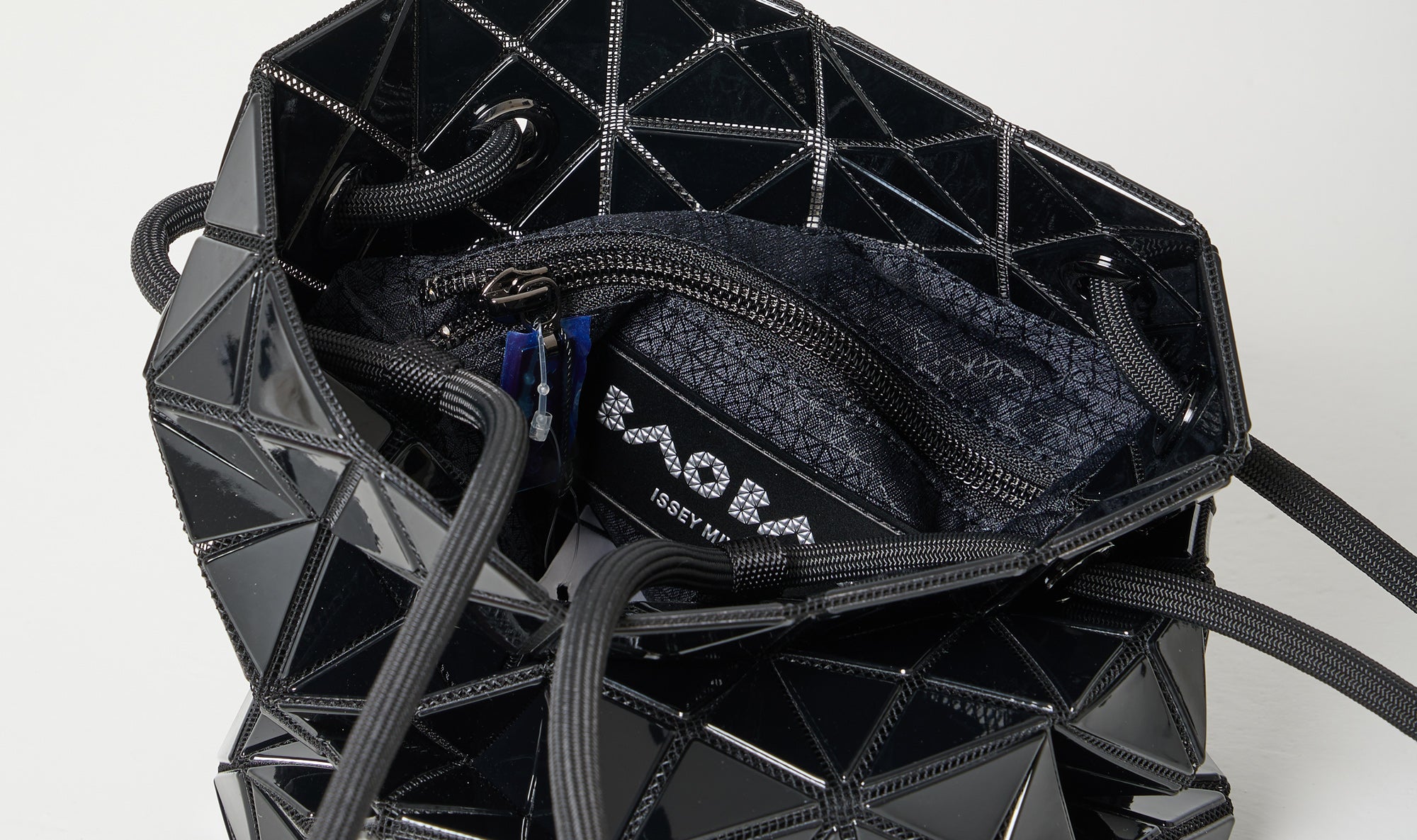 black sack bag, shiny triangular panels set on a black mesh, opened, internal logo, adjustable handles, internal pocket with zip