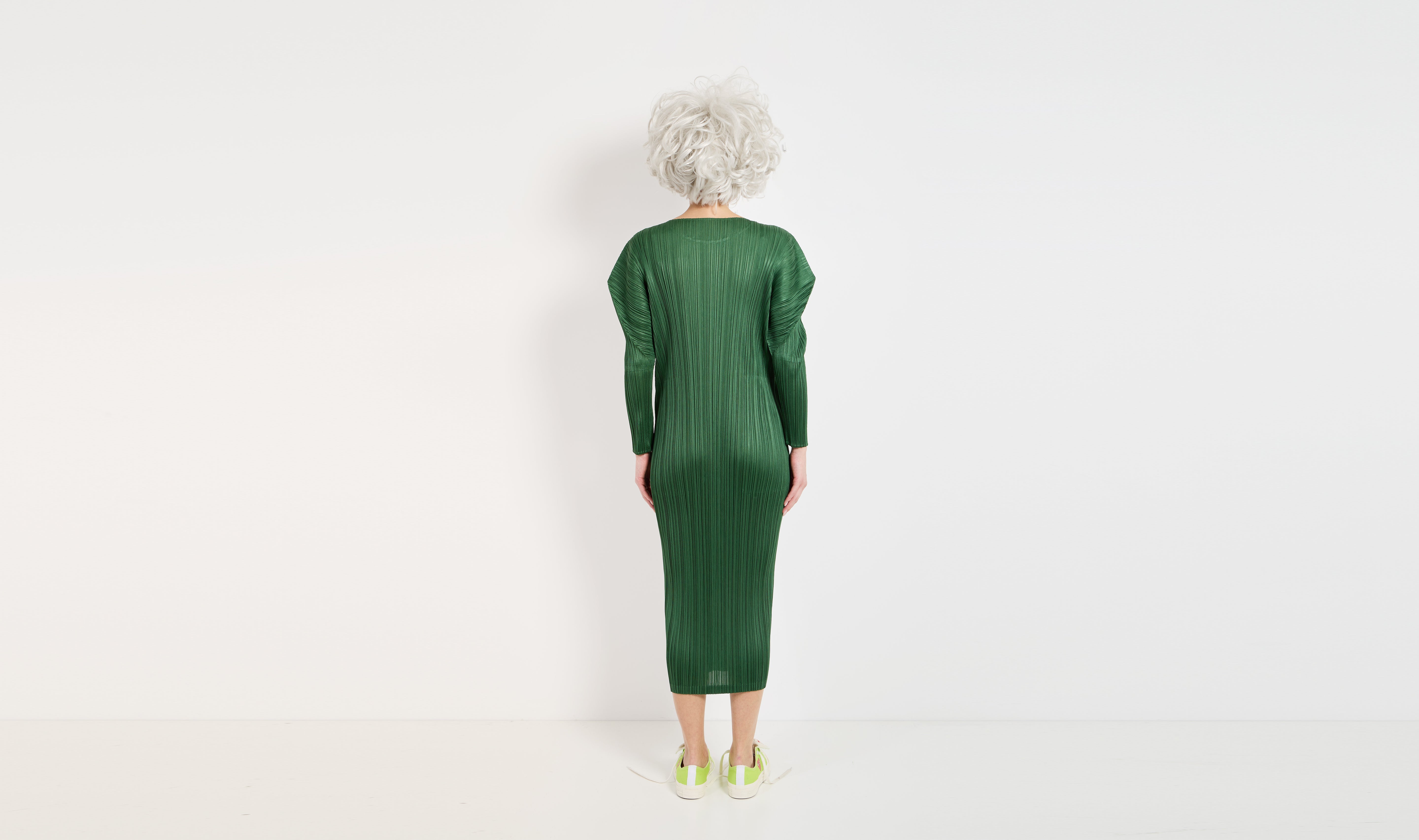 dress, dark green, vertical polyester plissé, longuette, round neckline, 3/4 sleeves, pockets