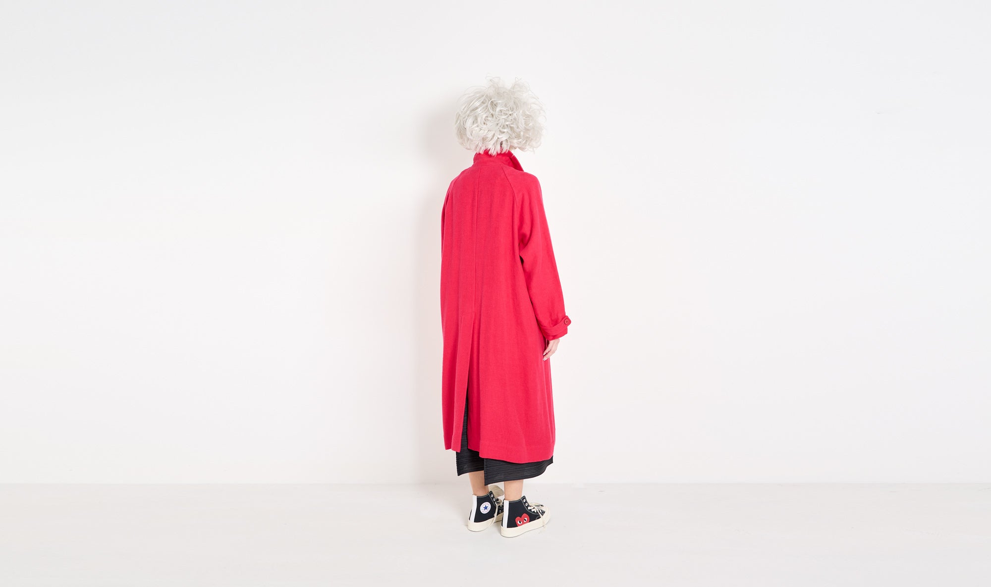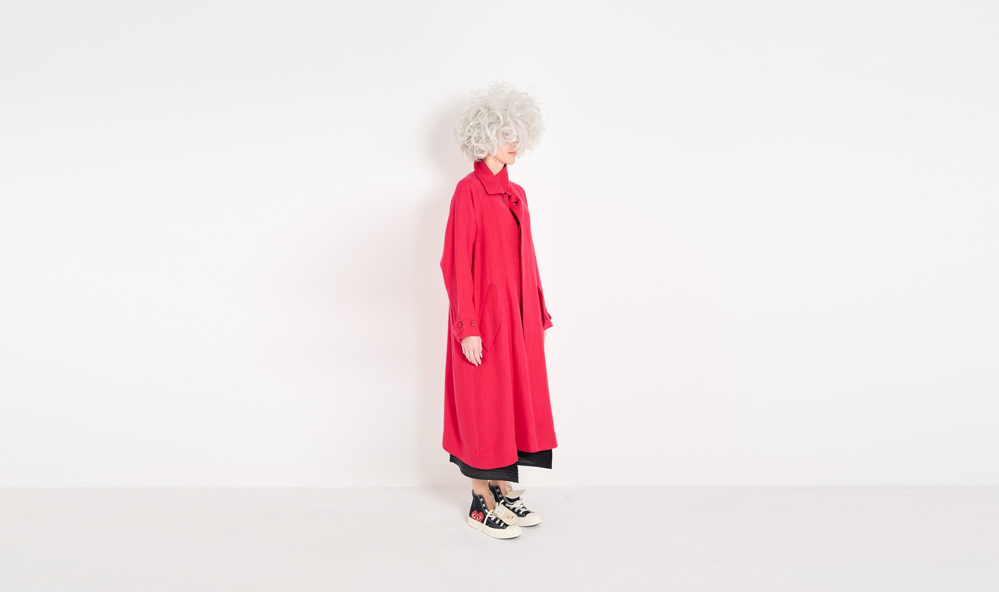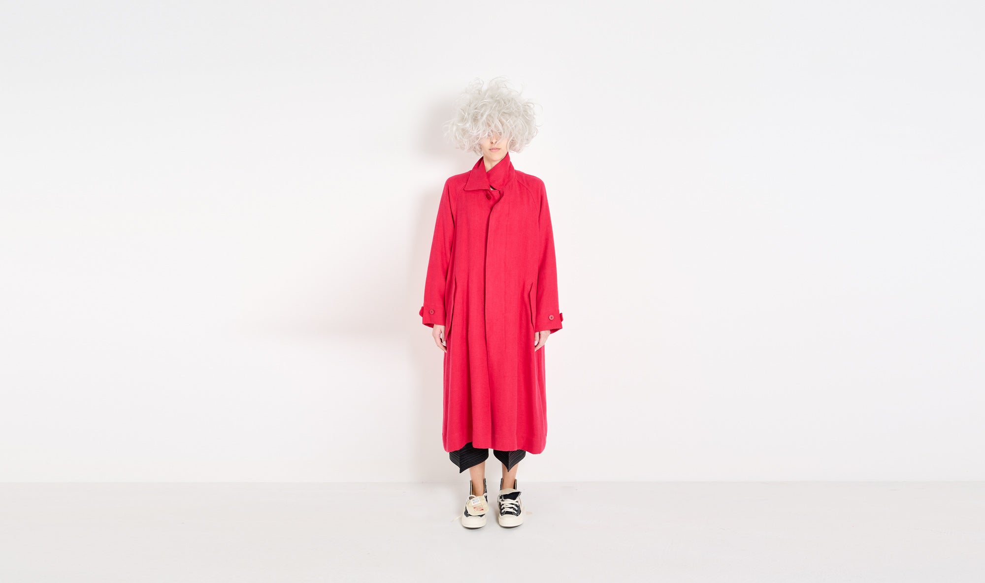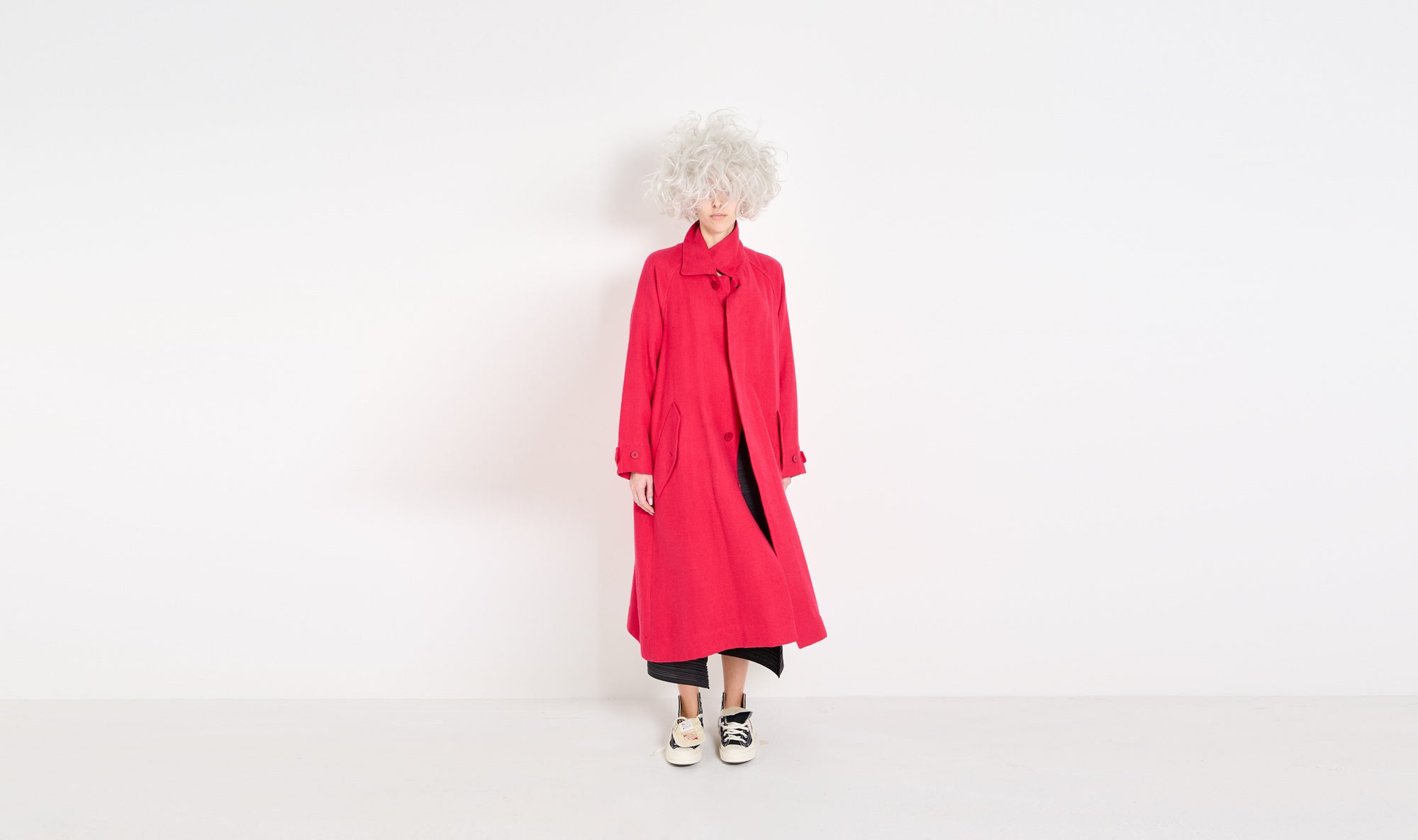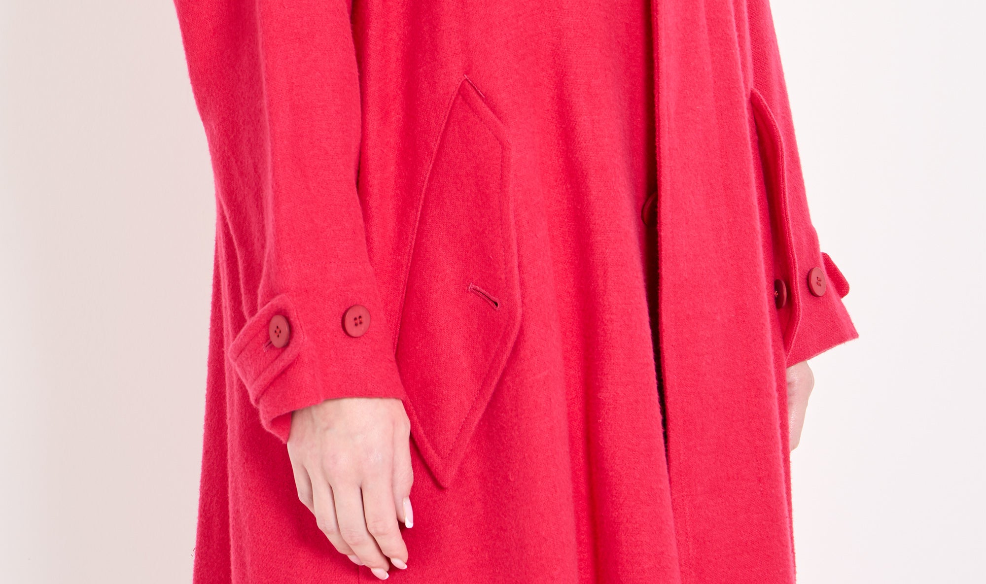 fuchsia overcoat, warm hemp, regular collar, hidden buttons fastening, long sleeves with strapped cuffs, diagonal pockets with flap and button, back vent, unlined