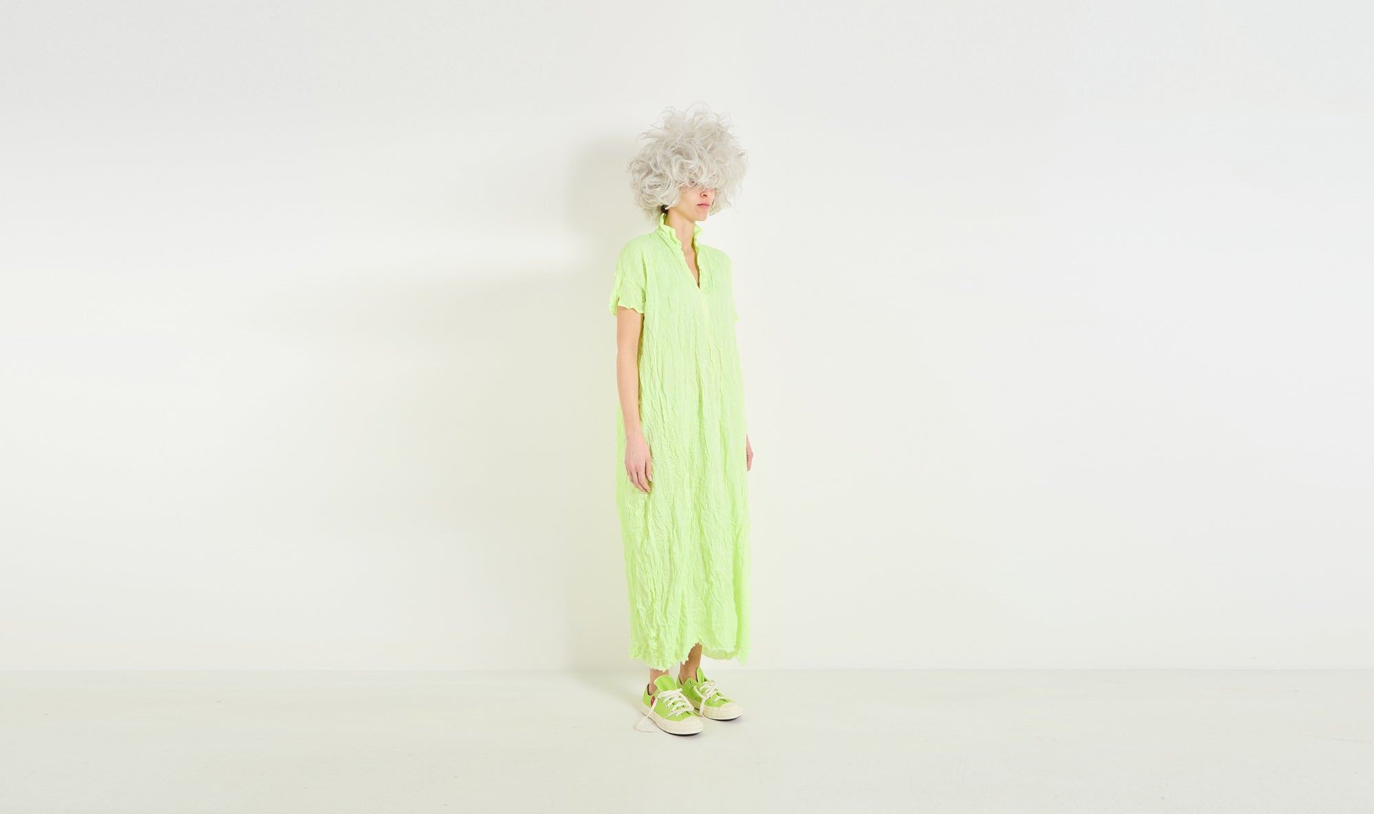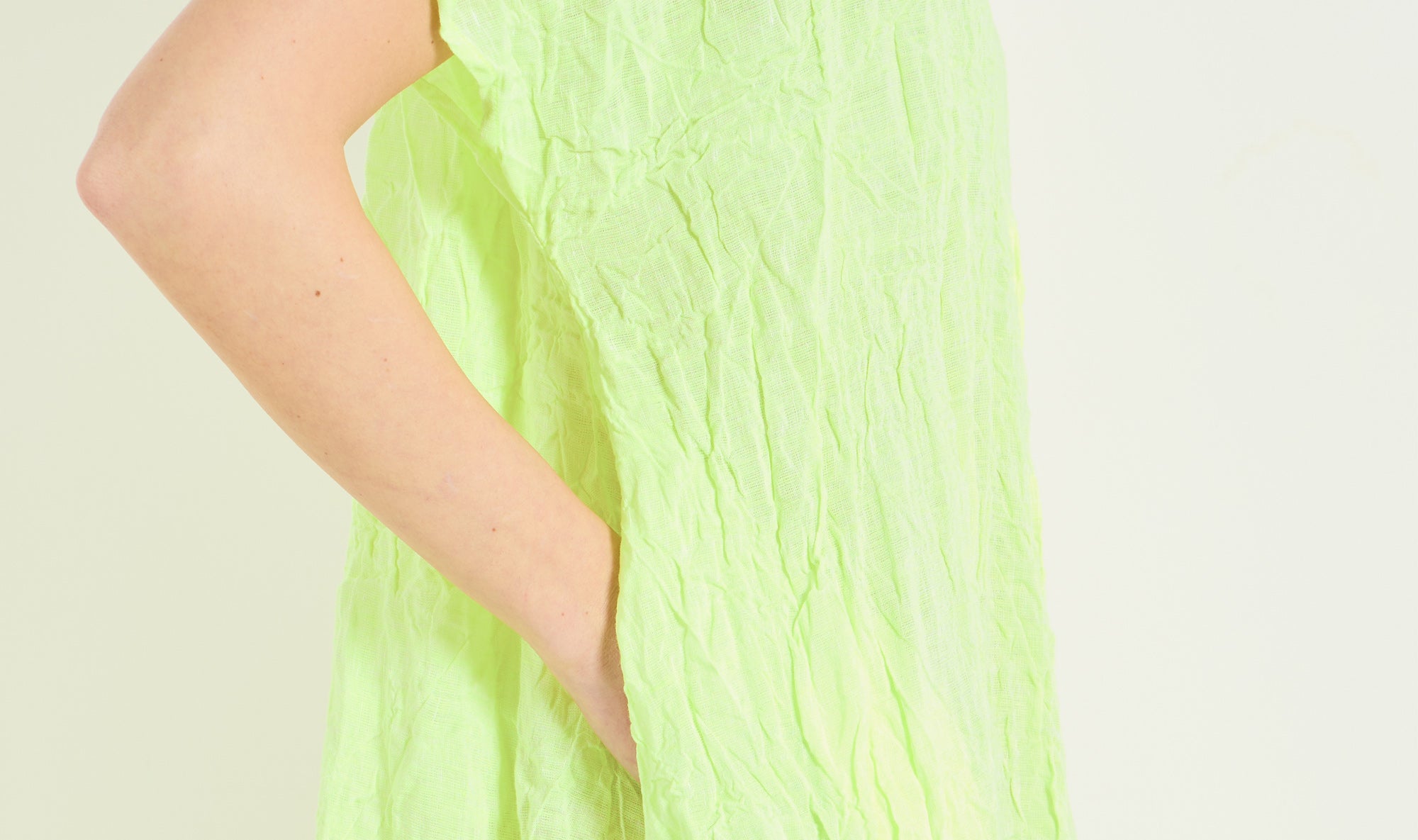 longuette dress, linen, slightly see through, green fluo color, small collar cut on the back with opened v on the front, front pleat, side pockets, cap sleeves, side holes that can be used to shorten the dress, oval shaped, sash from the same fabric, raw hem