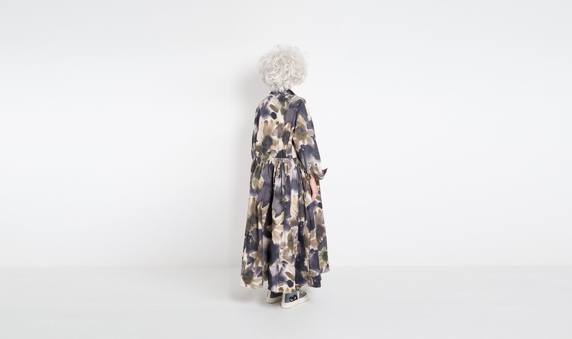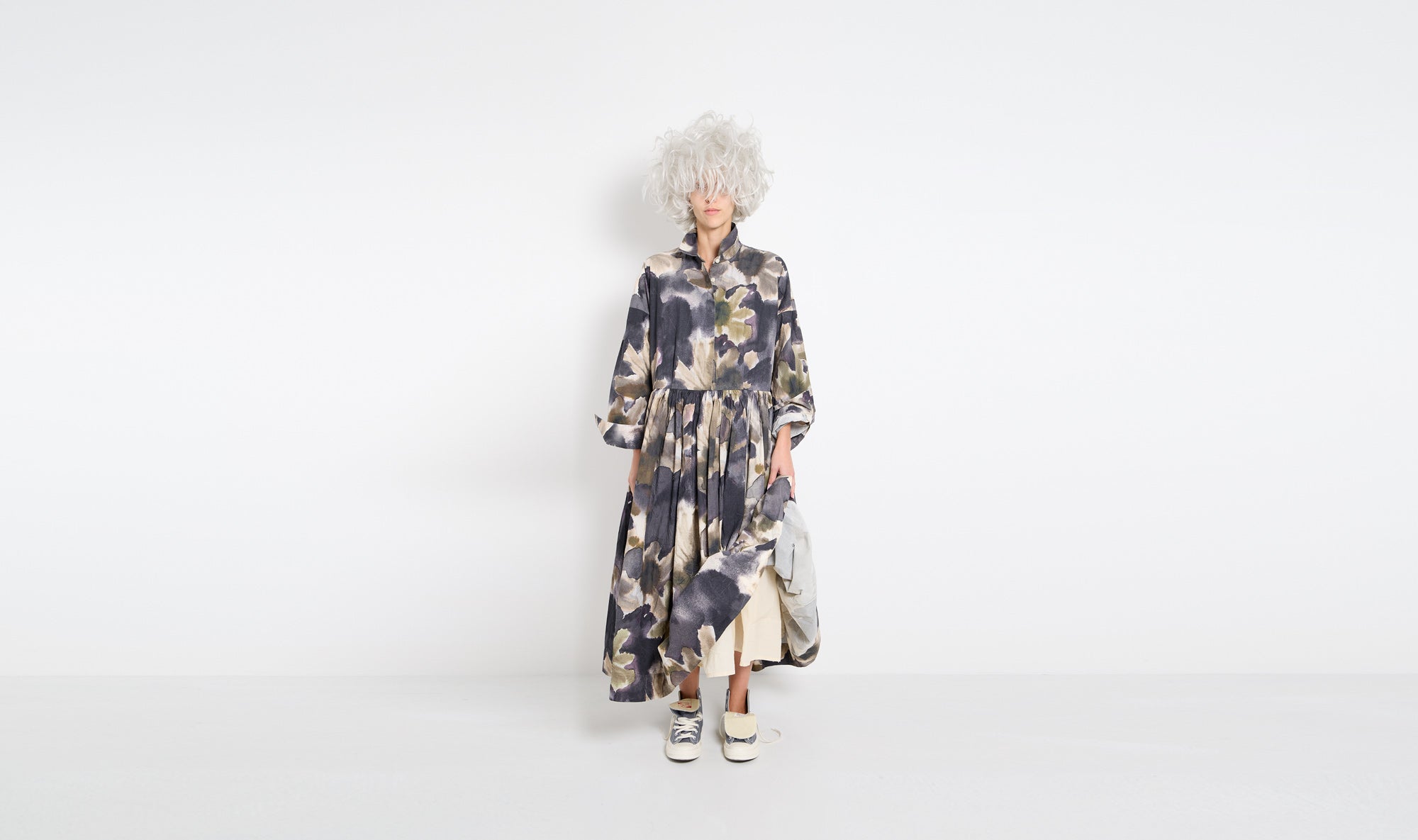 longuette dress, wrinkled heavy cotton, green grey flowers pattern, regular collar with opened v on the front and buttons, cut at the waist and pleated, side pockets, long sleeves with cuffs