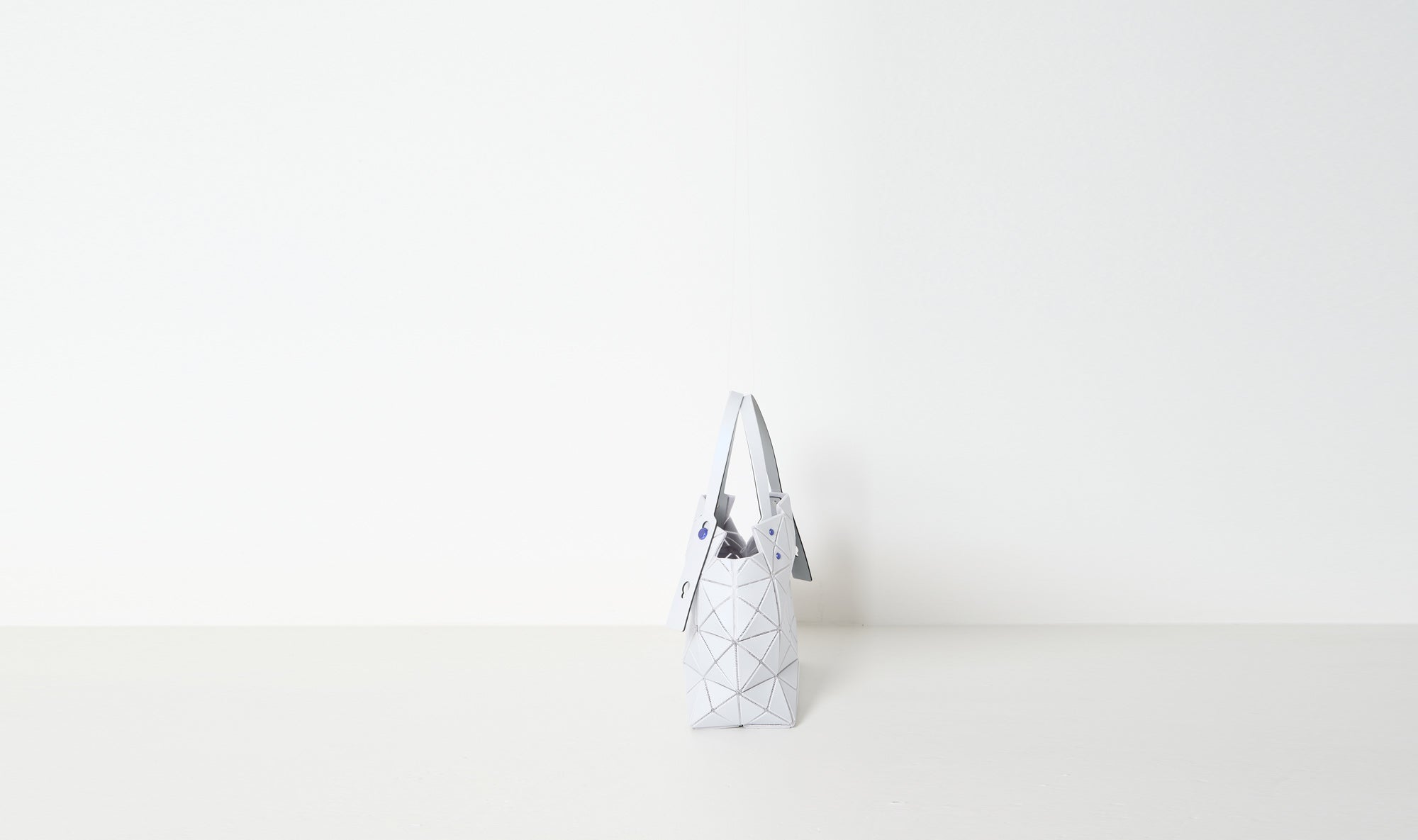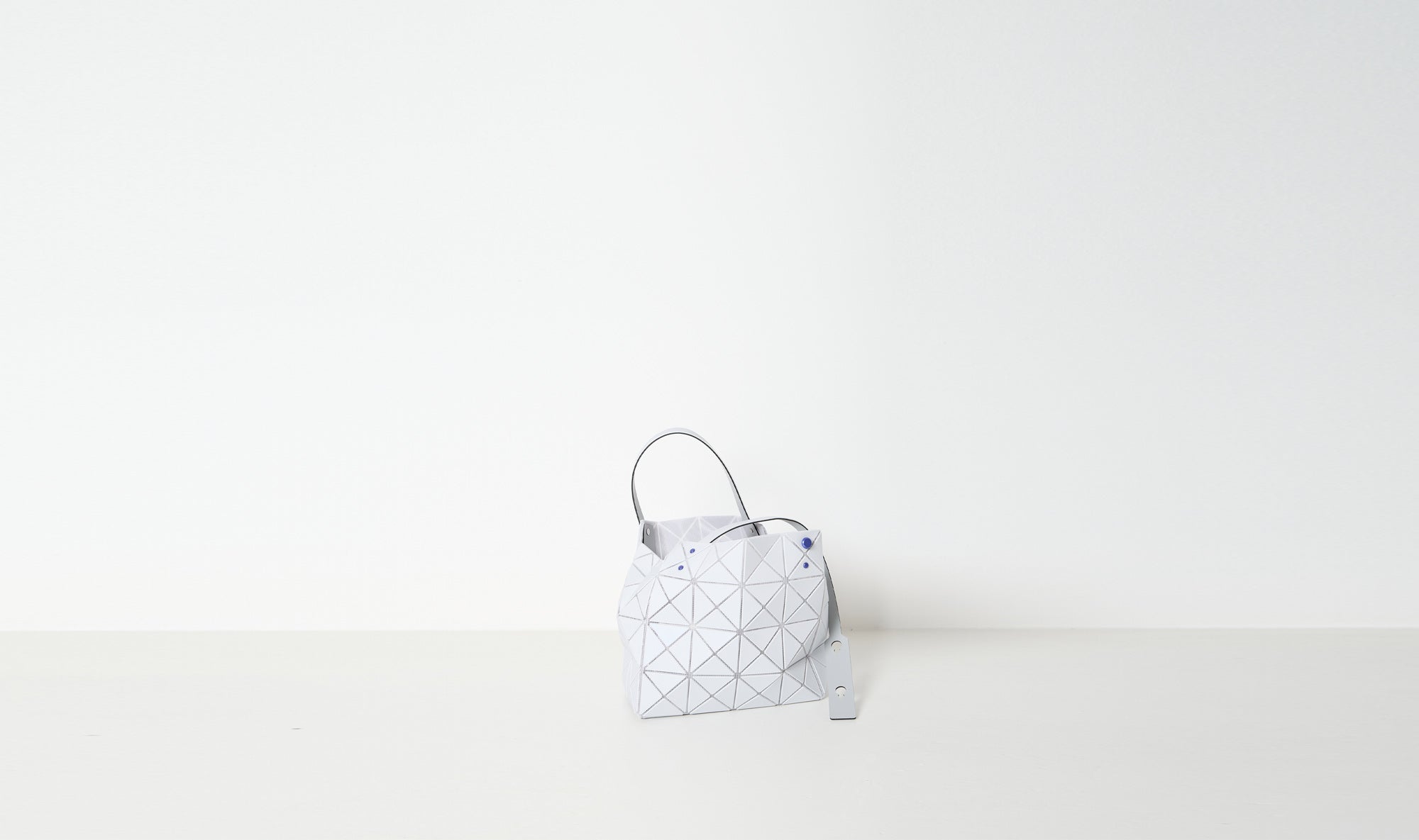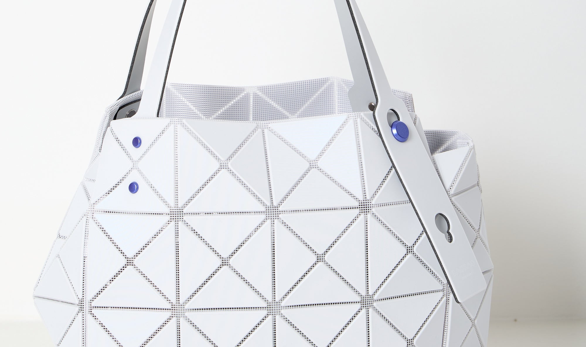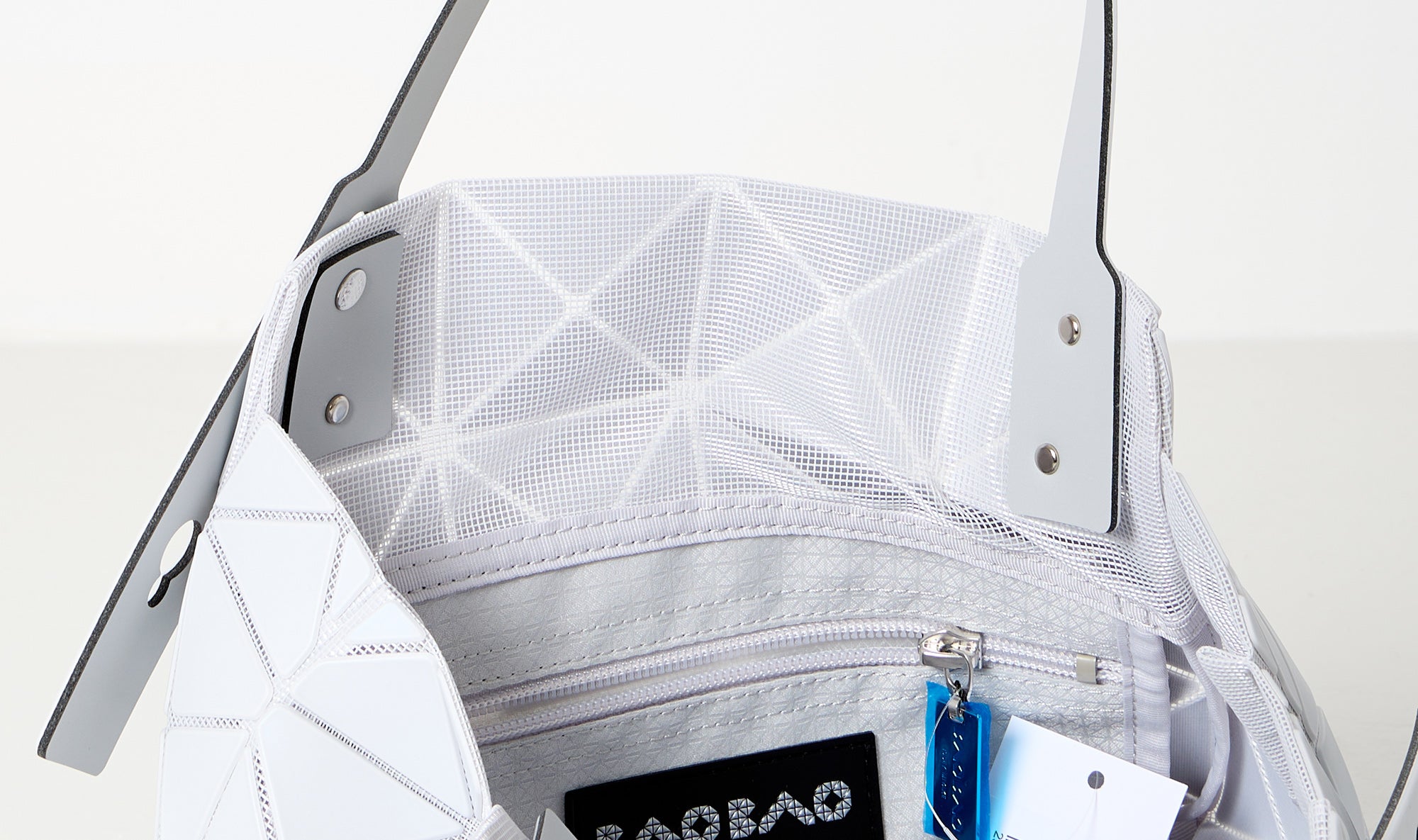 grey bag, matt triangular panels set on a black mesh, opened, internal logo, adjustable handles, internal small pocket