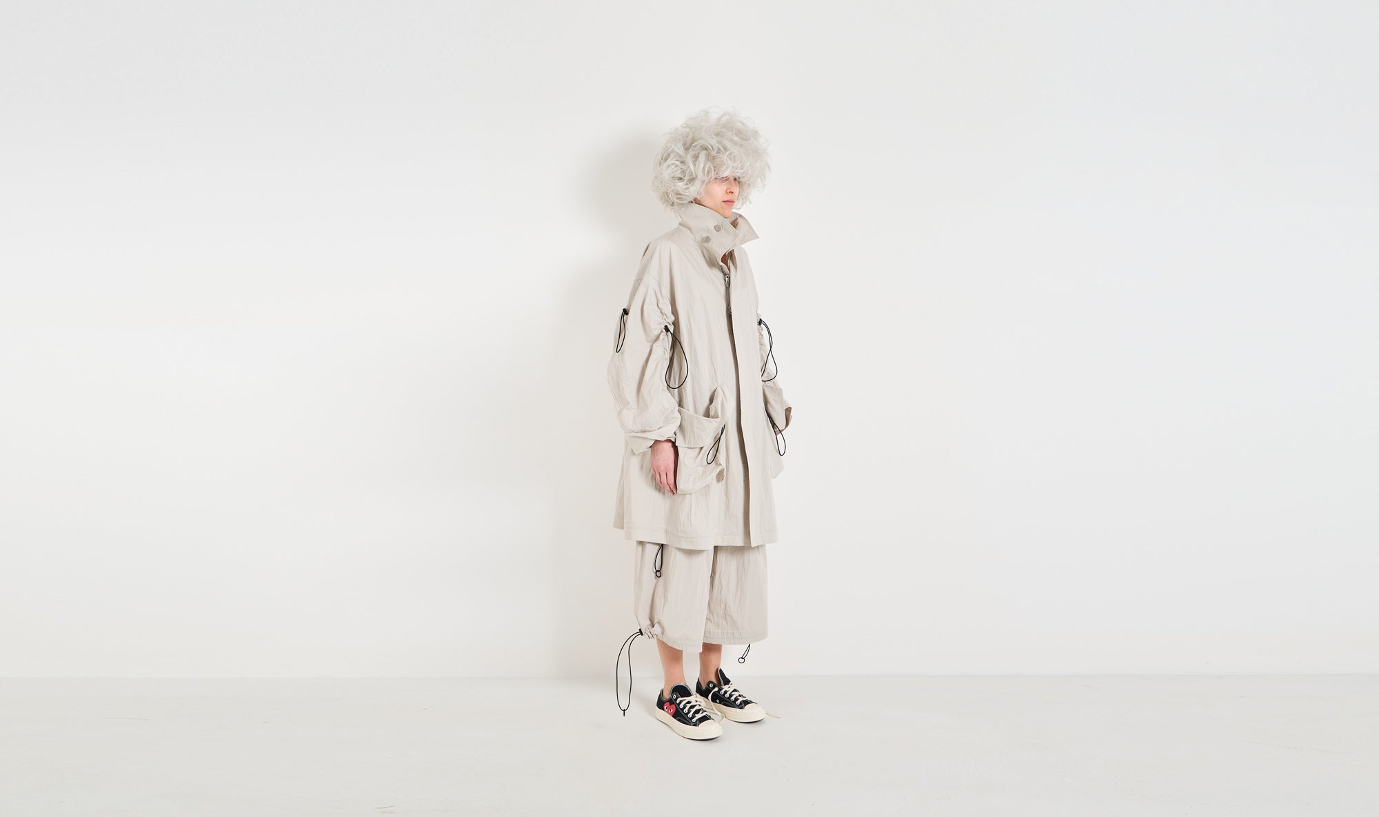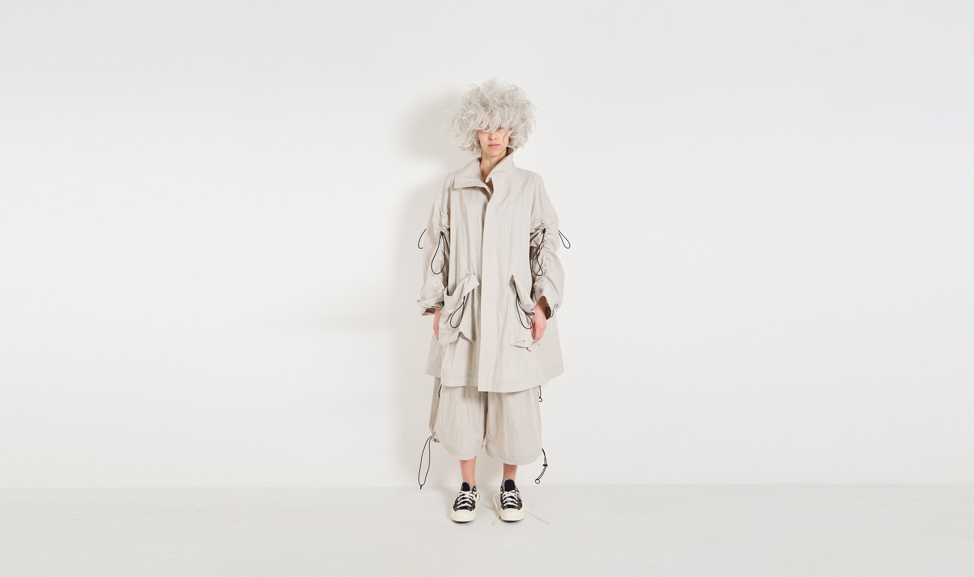overcoat, grey, nylon, high collar, double slider zipper fastening, long sleeves, side pockets, bucles on the sleeves, pockets, large