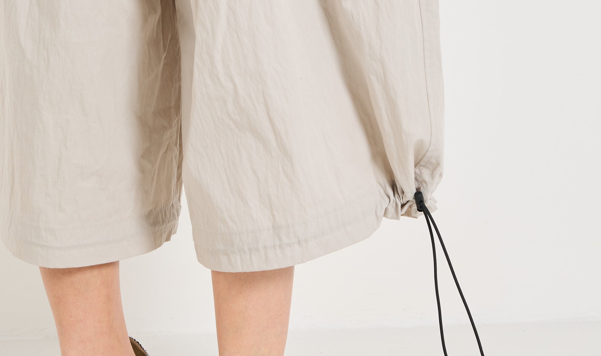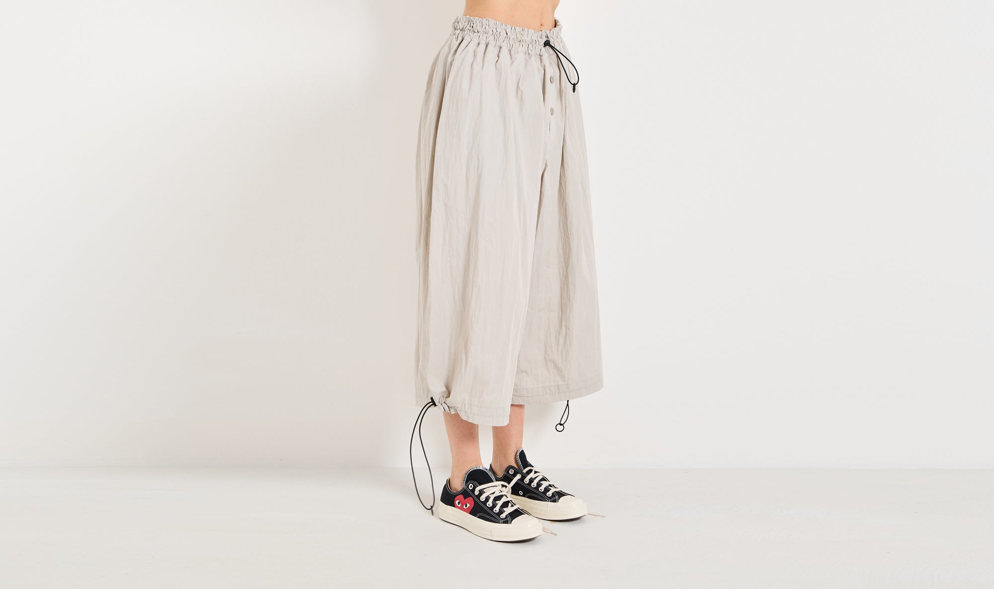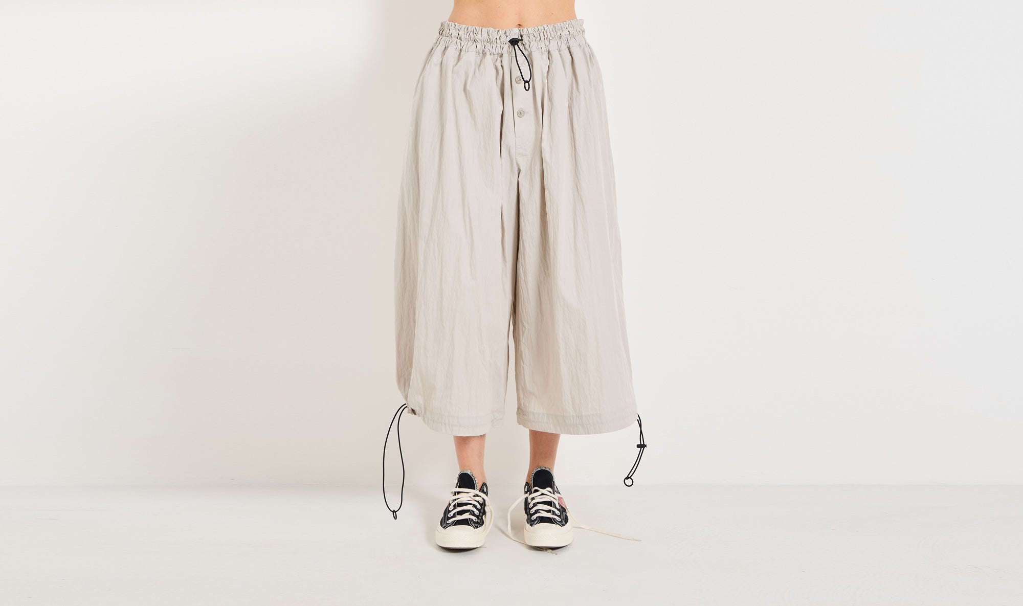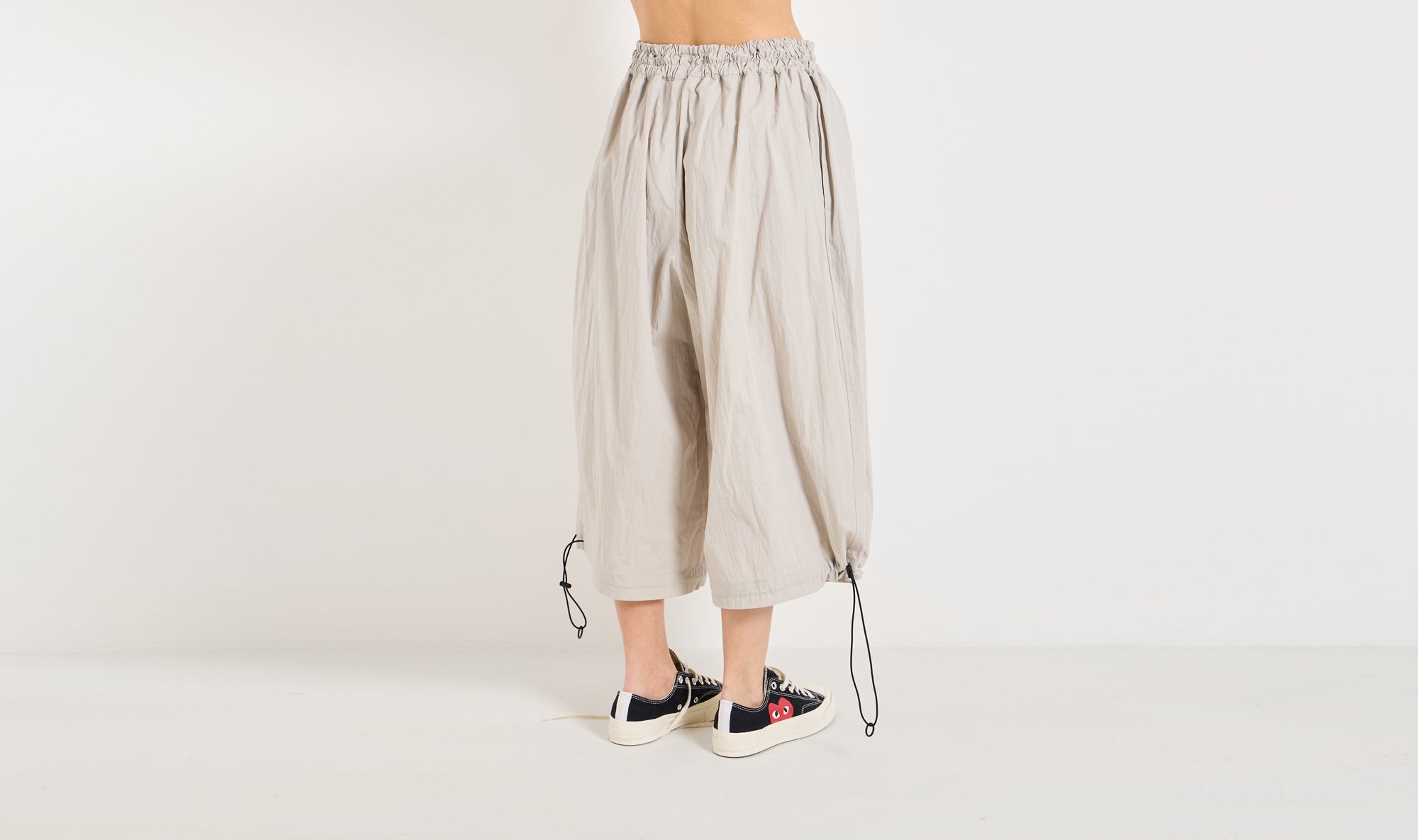 trousers, grey, nylon, buttons and drawstring, side pockets