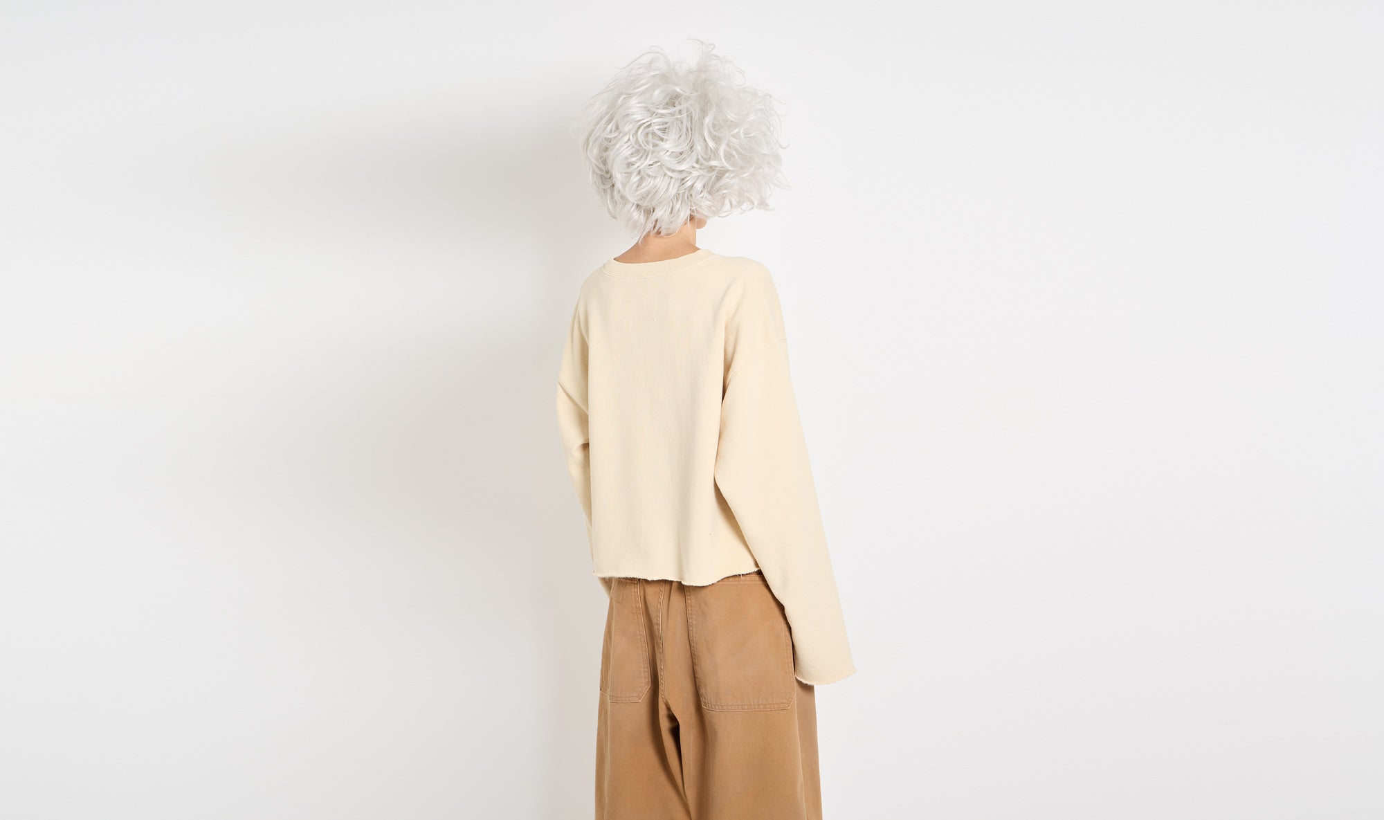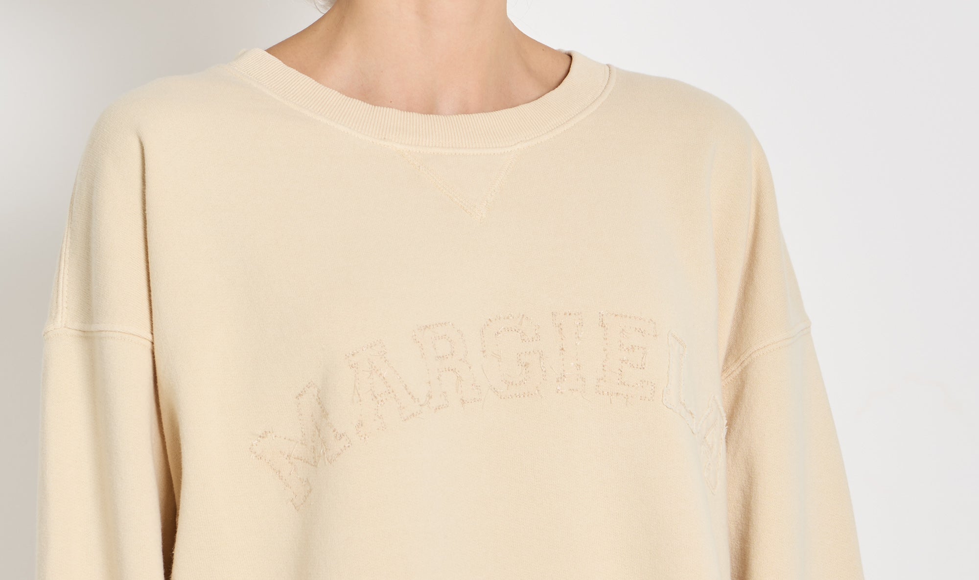 light yellow sweatshirt, cotton, rawcut hem, long sleeves, logo on the front