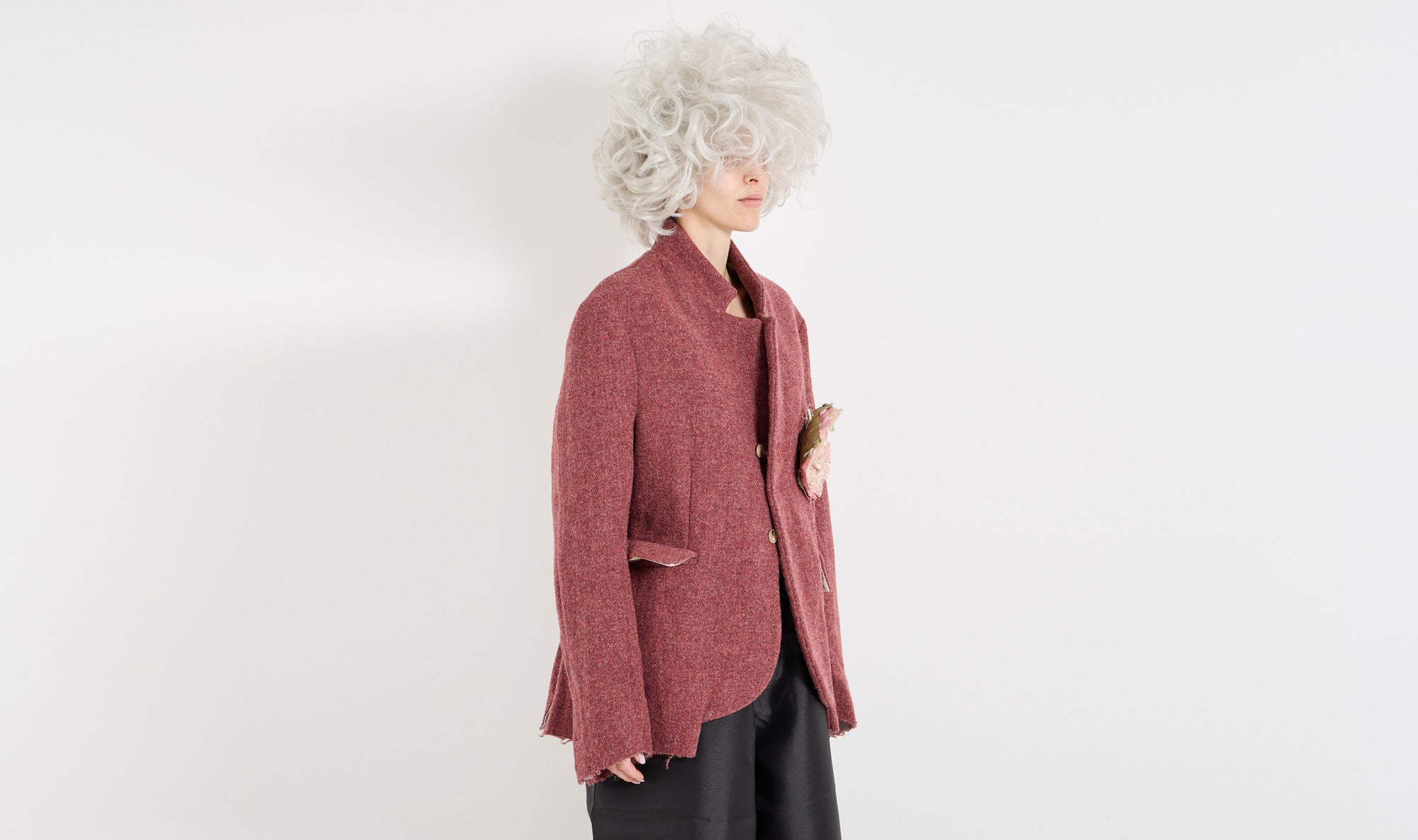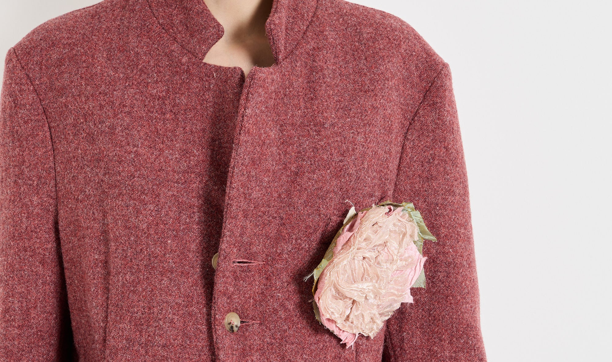 bordeaux color jacket, wool, cotton lining, high collar, flap pockets, welt pocket, slightly curved fastening with buttons on the front, double breasted, raw-cut hem and cuffs, side back vents, rose brooch