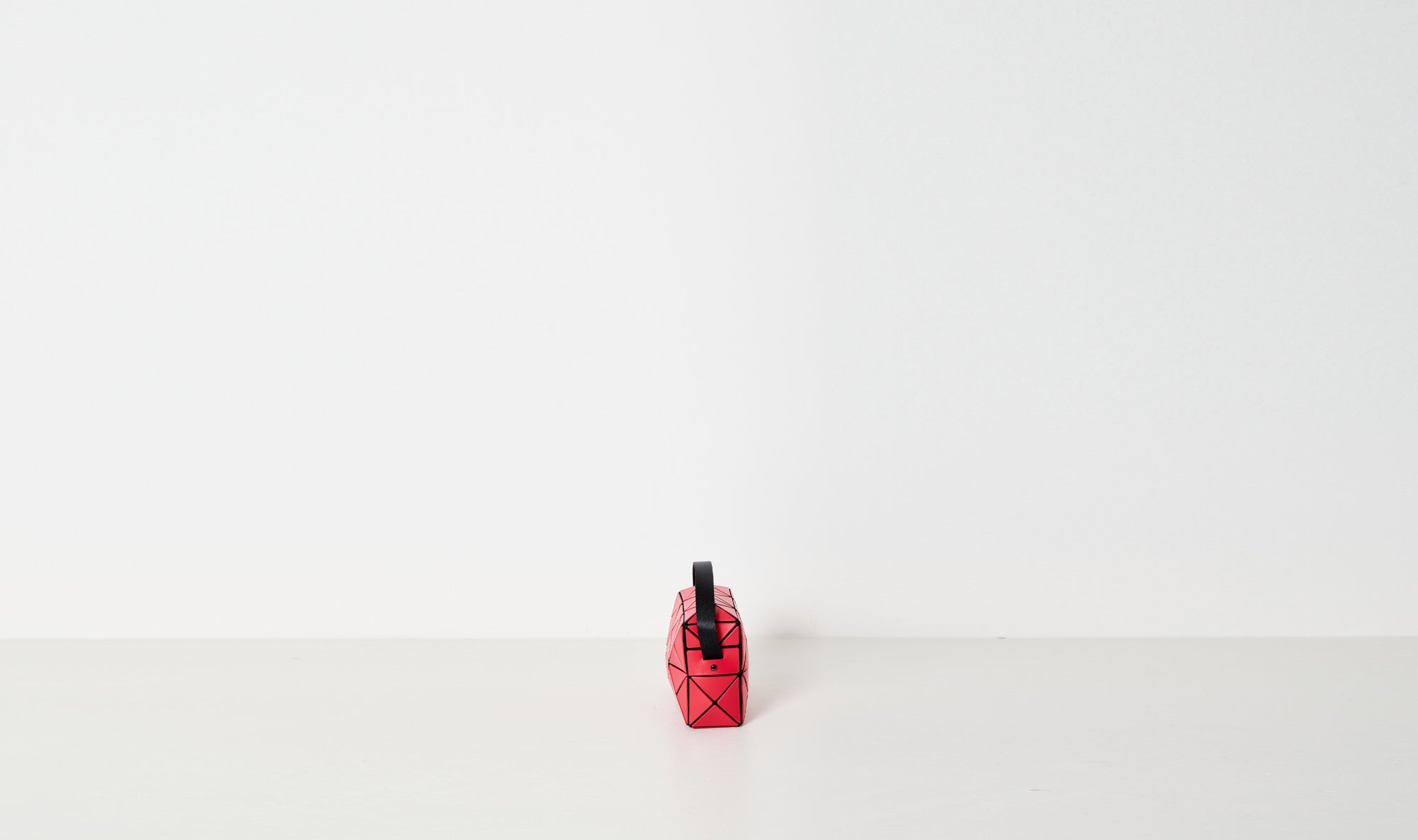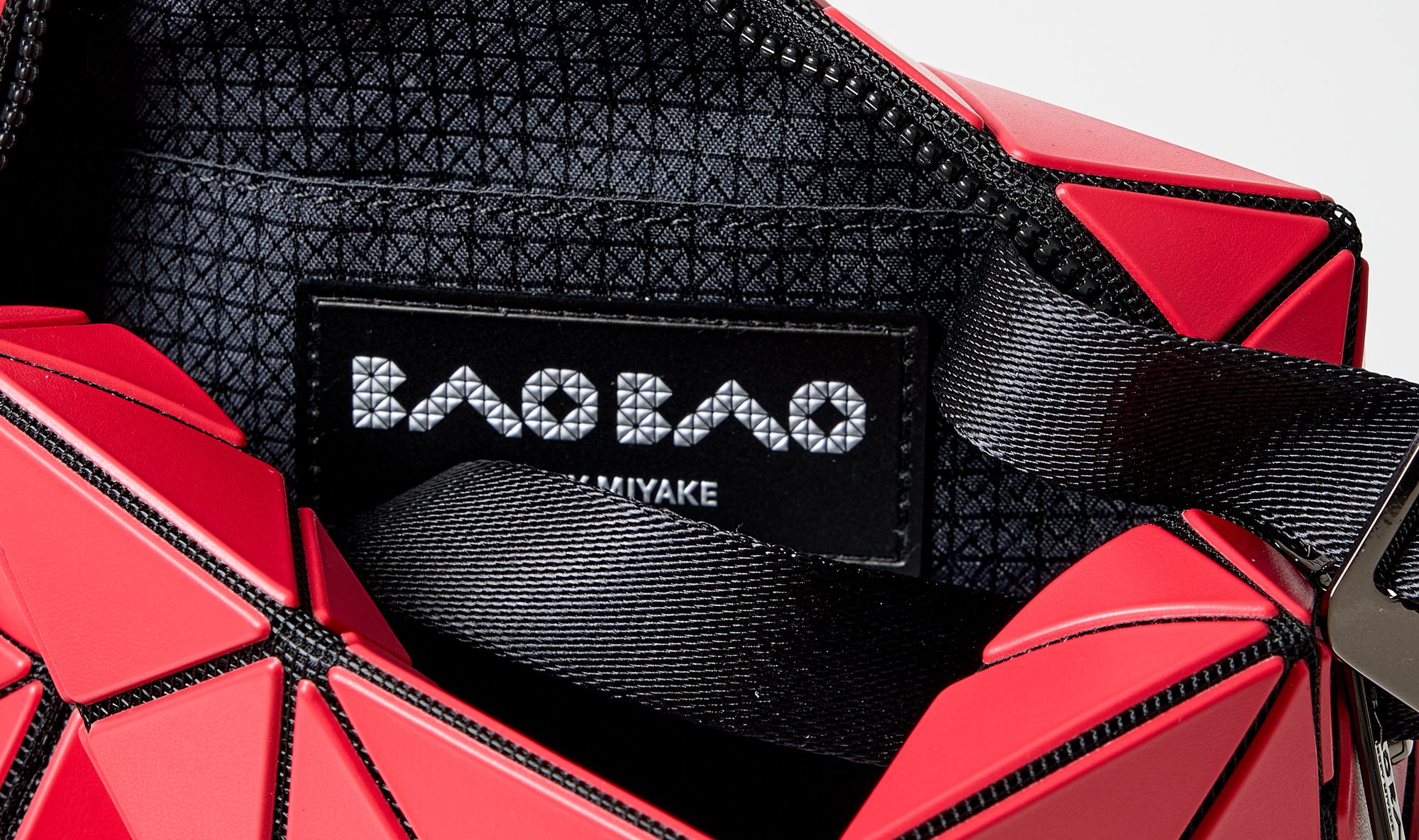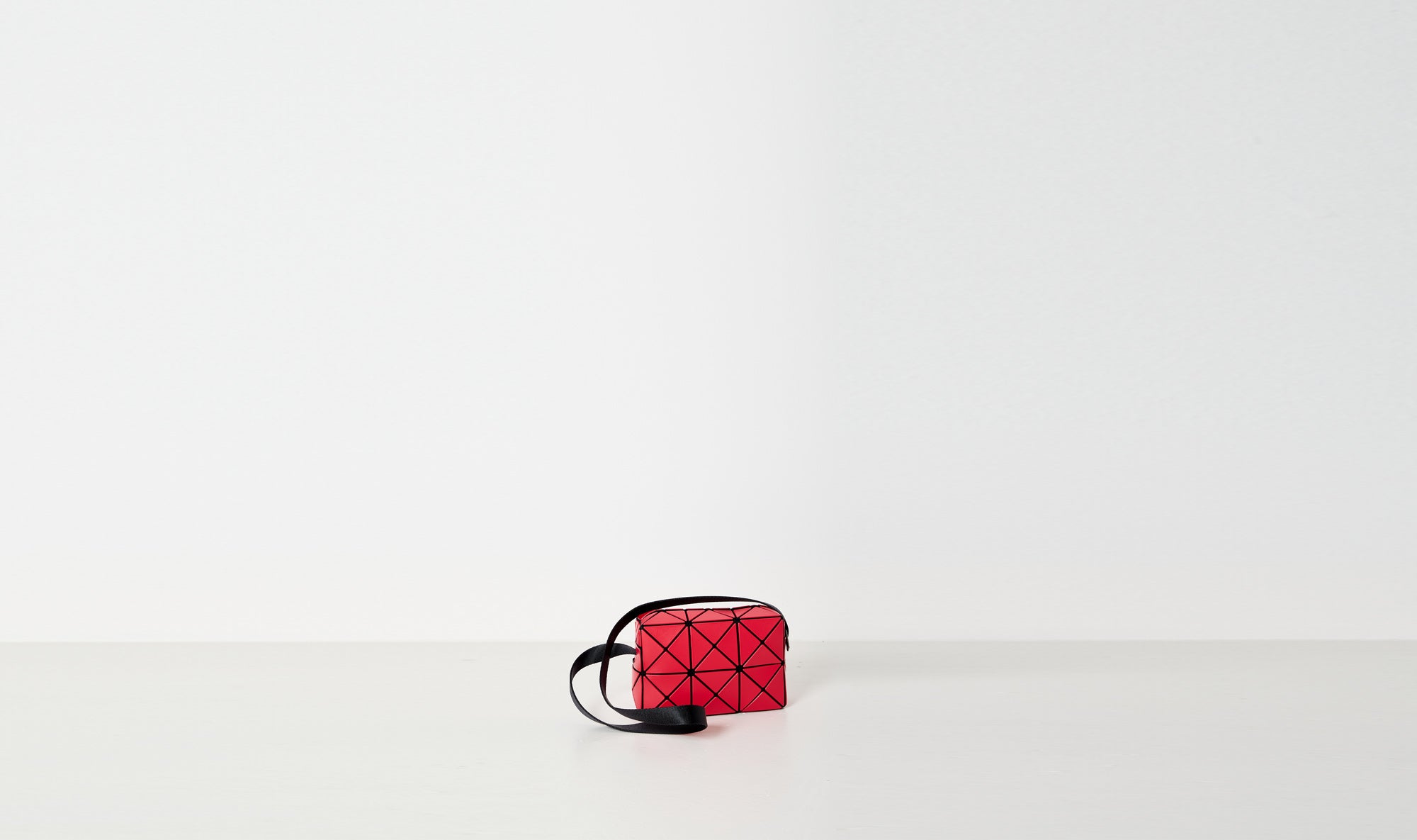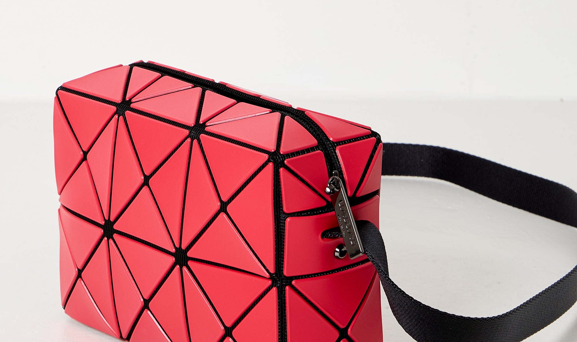 red, small, matt triangular panels set on a black mesh, zip fastening, internal logo, adjustable strap, internal small pocket