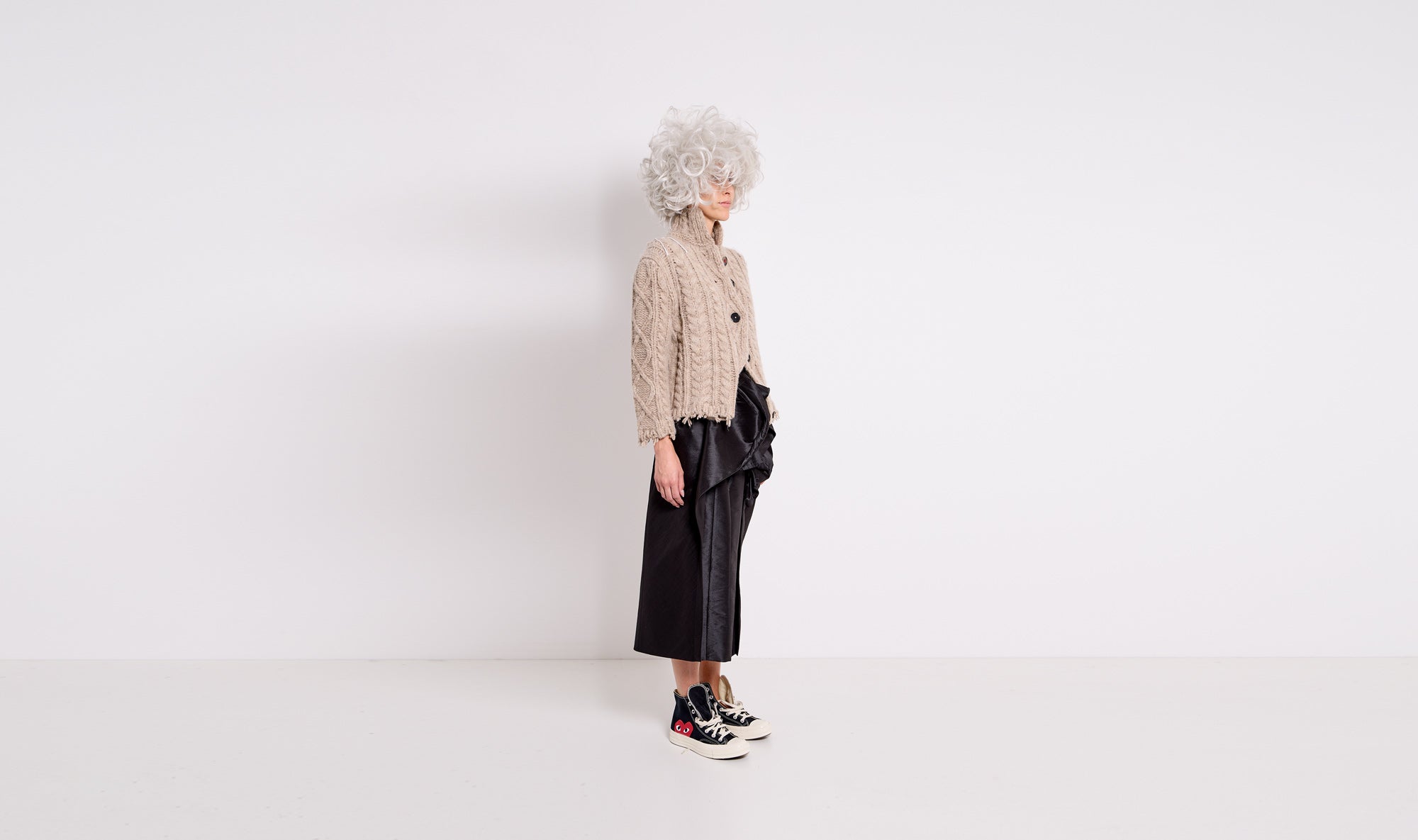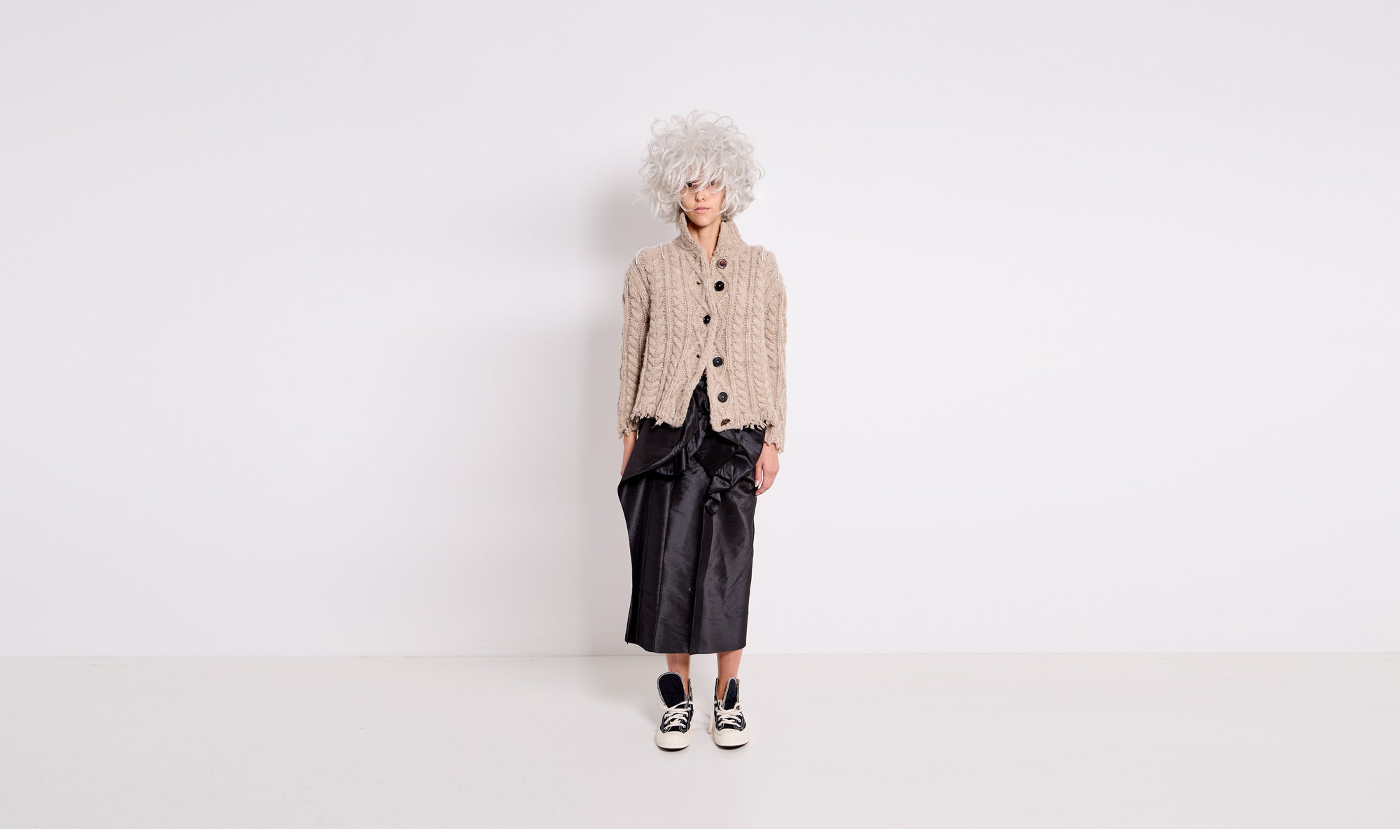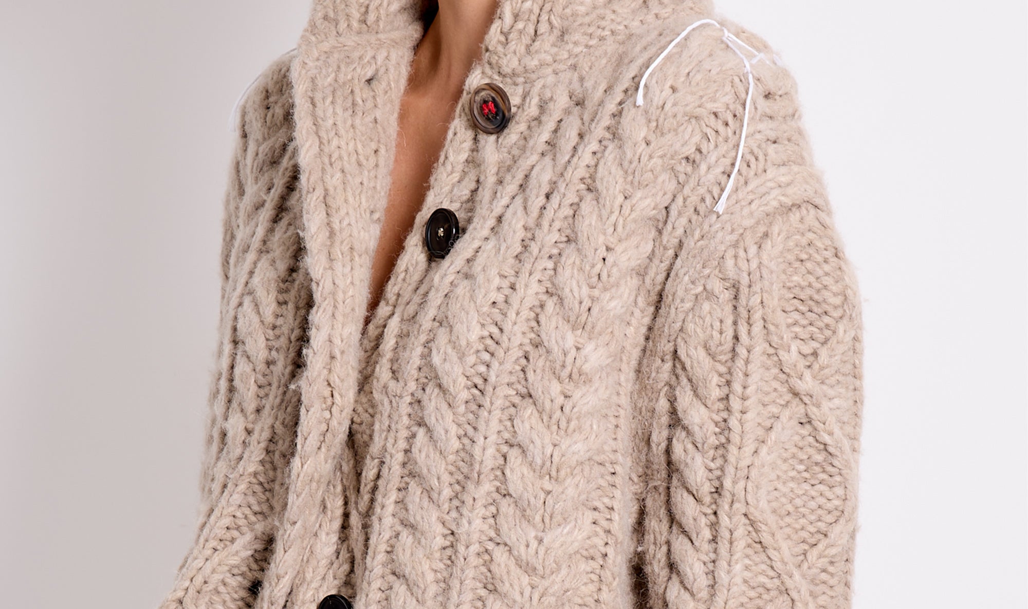 natural color cardigan, heavy thread, buttons fastening, high neck, stitching details