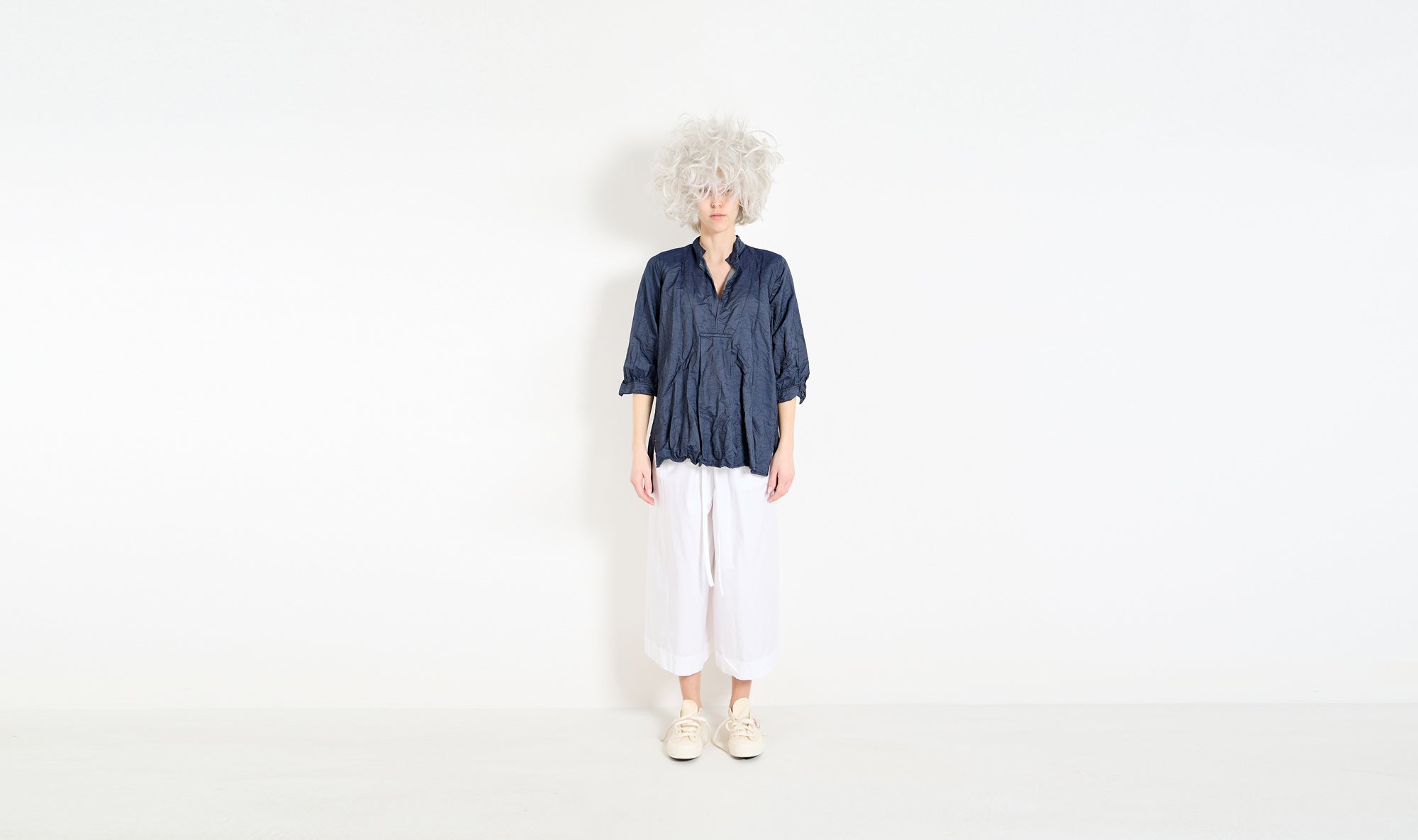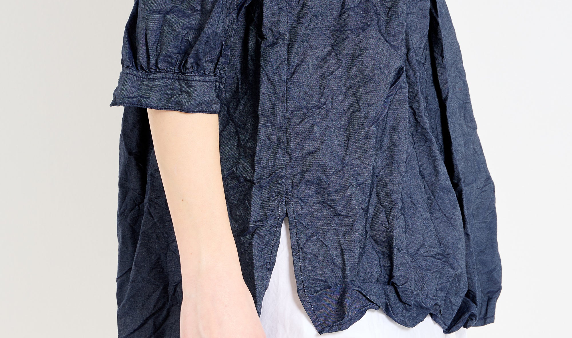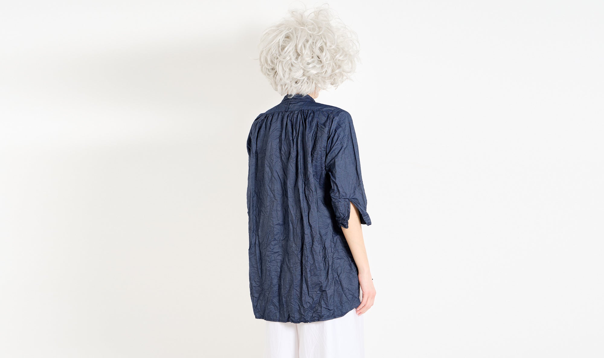 blue tunic, washed and wrinkled cotton, small collar, open v on the front with pleat, short sleeves with small slit, longer on the back, side pockets, bottom slits