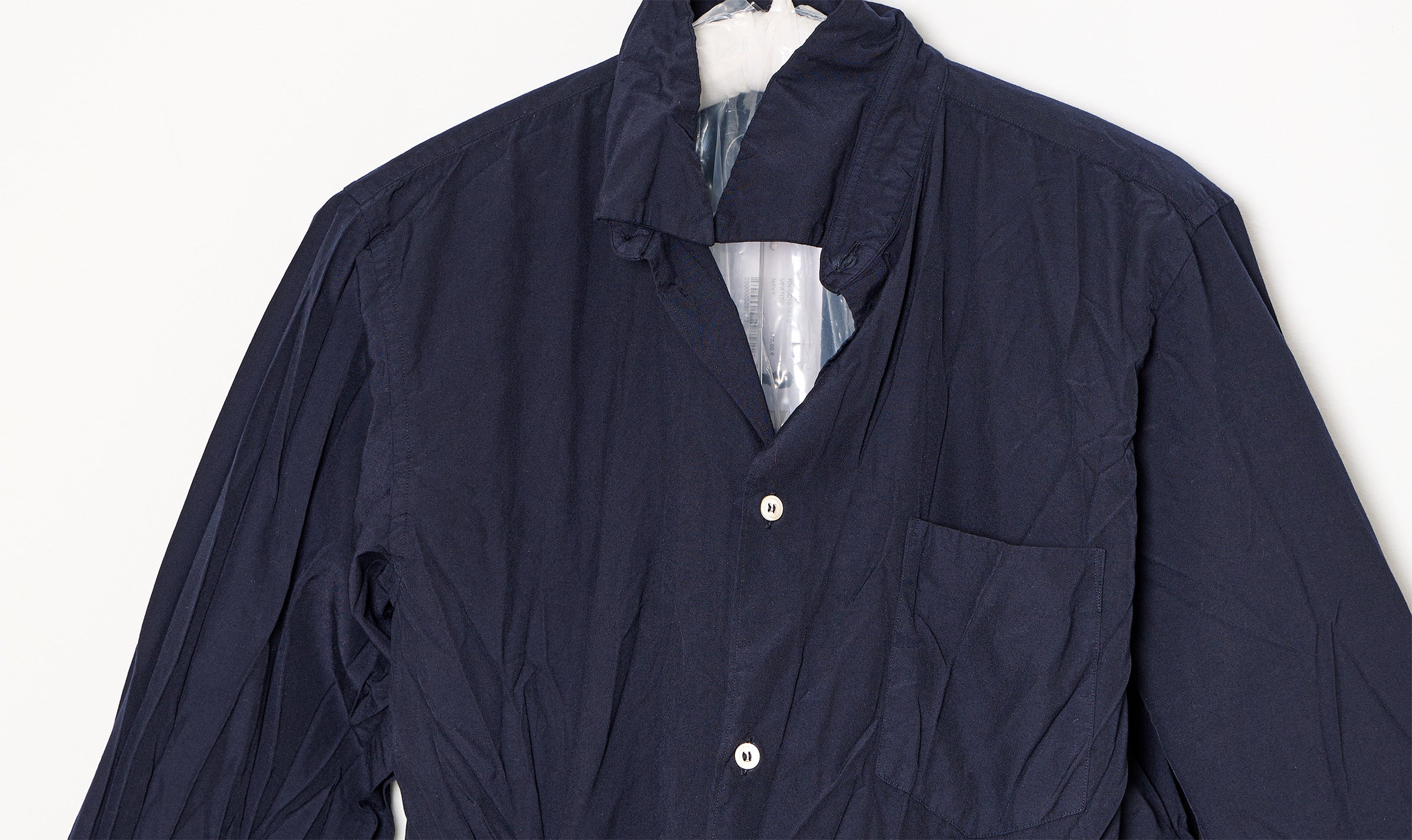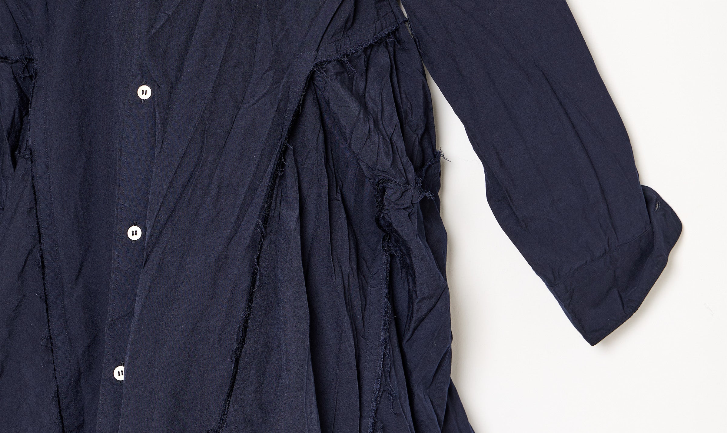navy shirt, crumpled polyester, long, buttons fastening, patch pocket at the chest, rawcut details