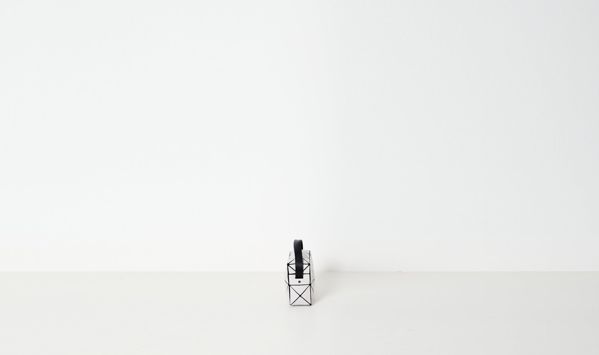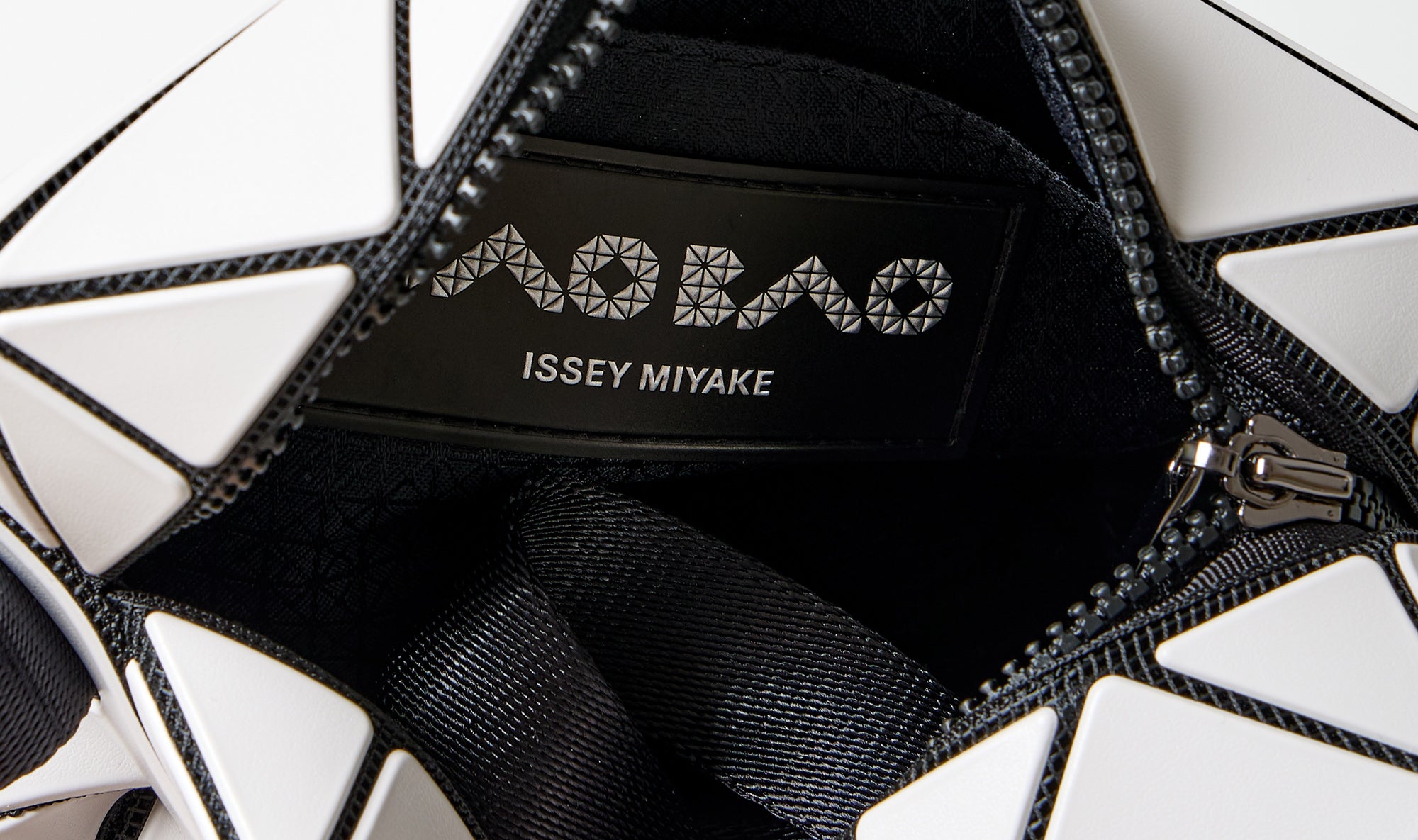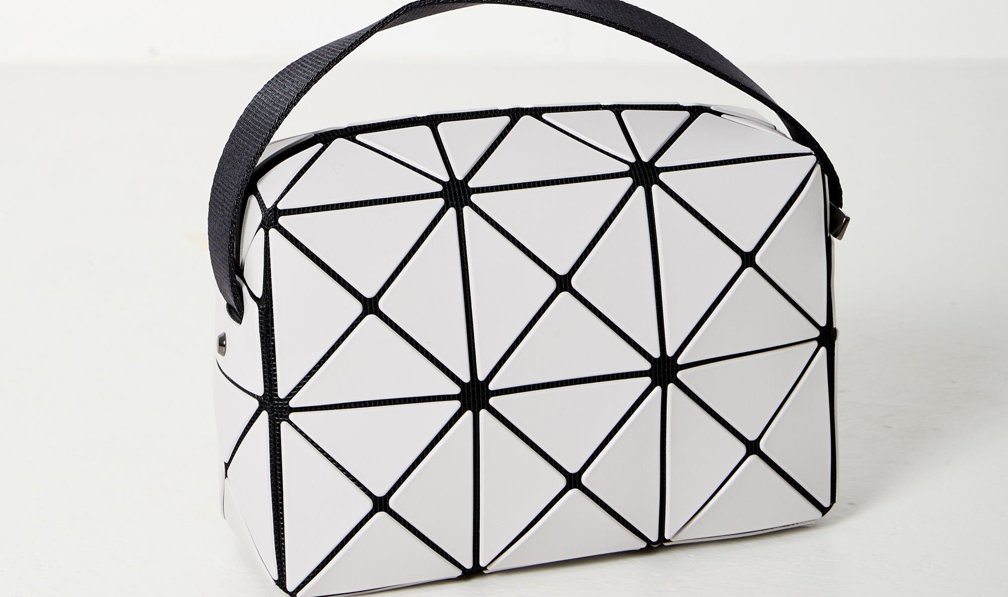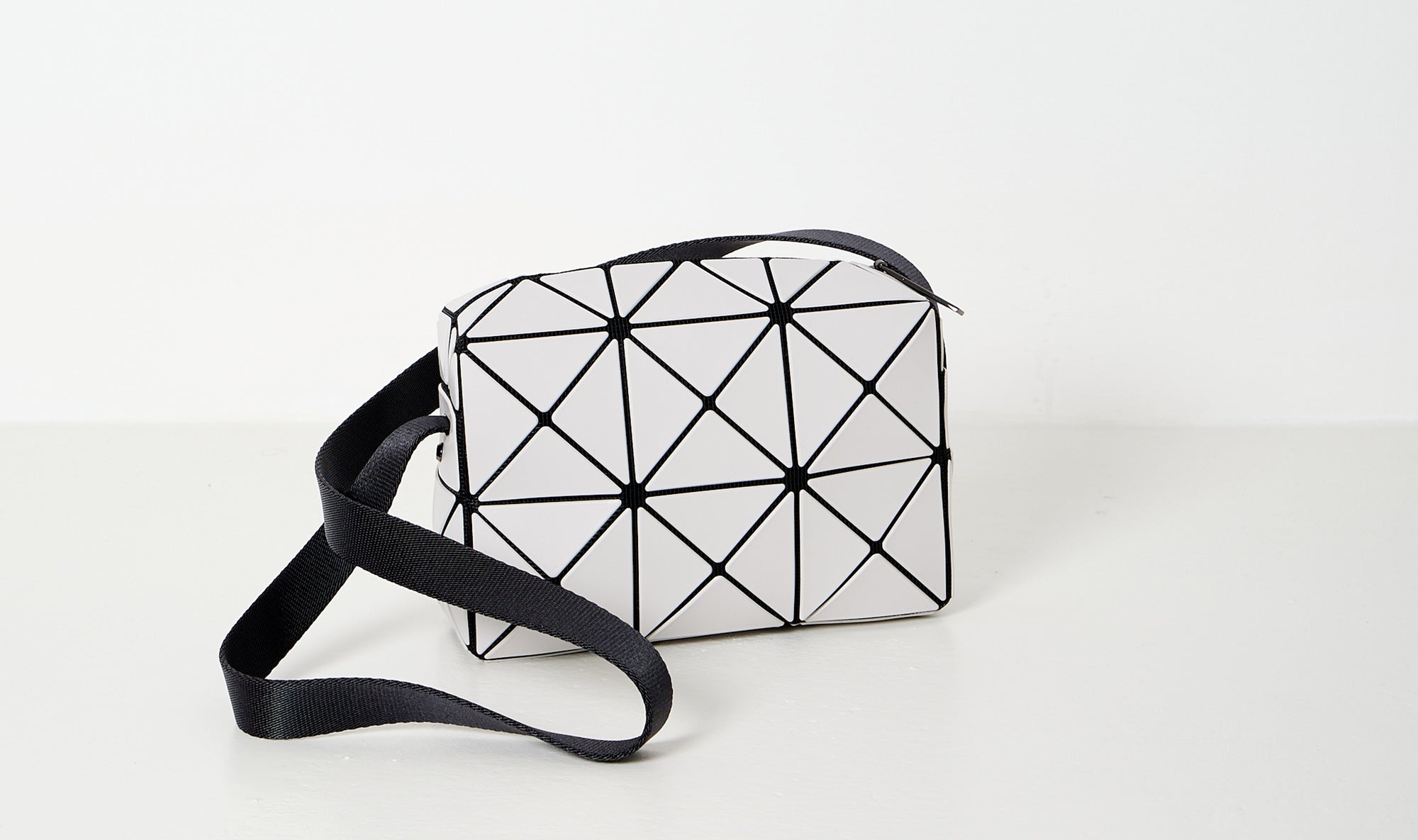 pale grey, small, matt triangular panels set on a black mesh, zip fastening, internal logo, adjustable strap, internal small pocket