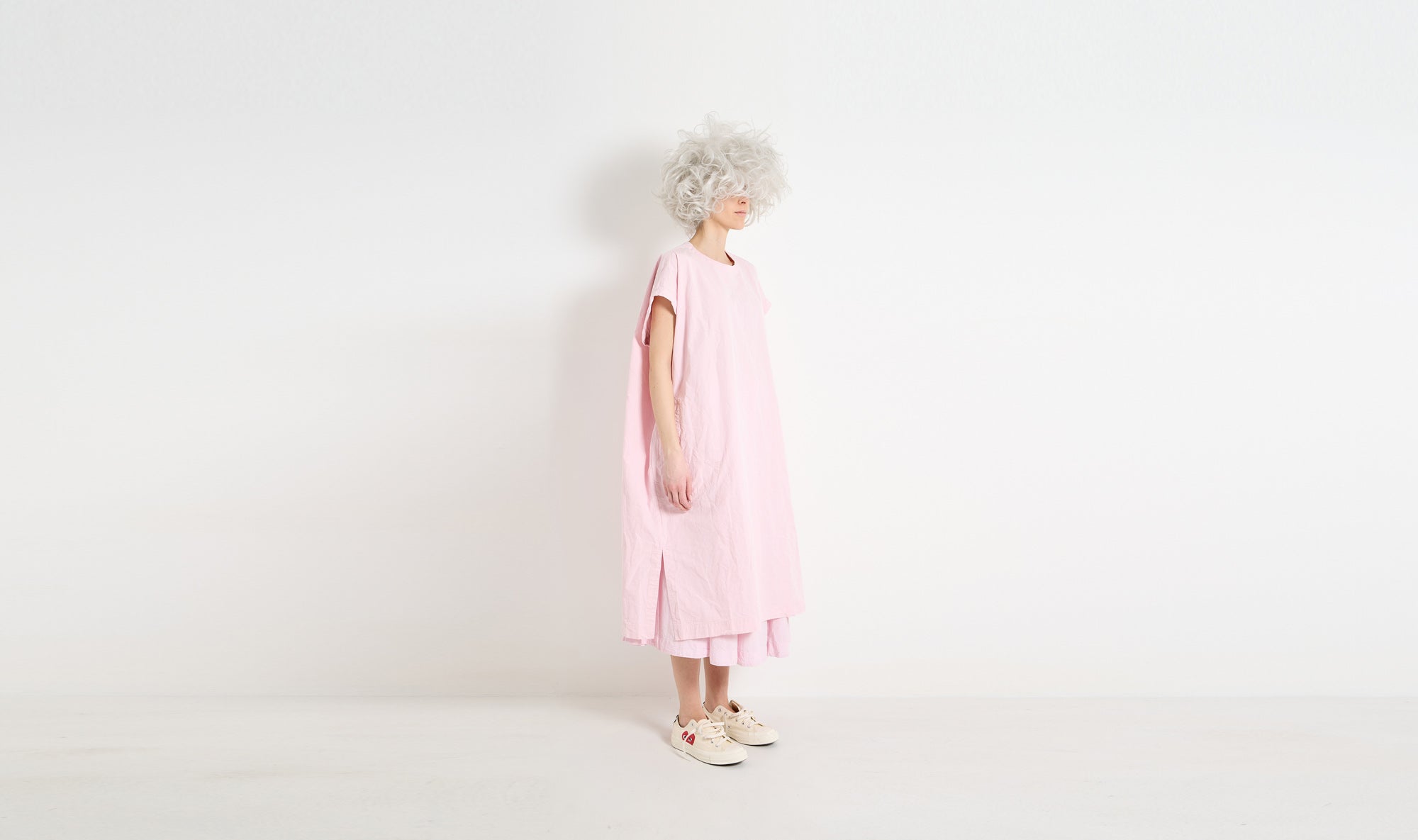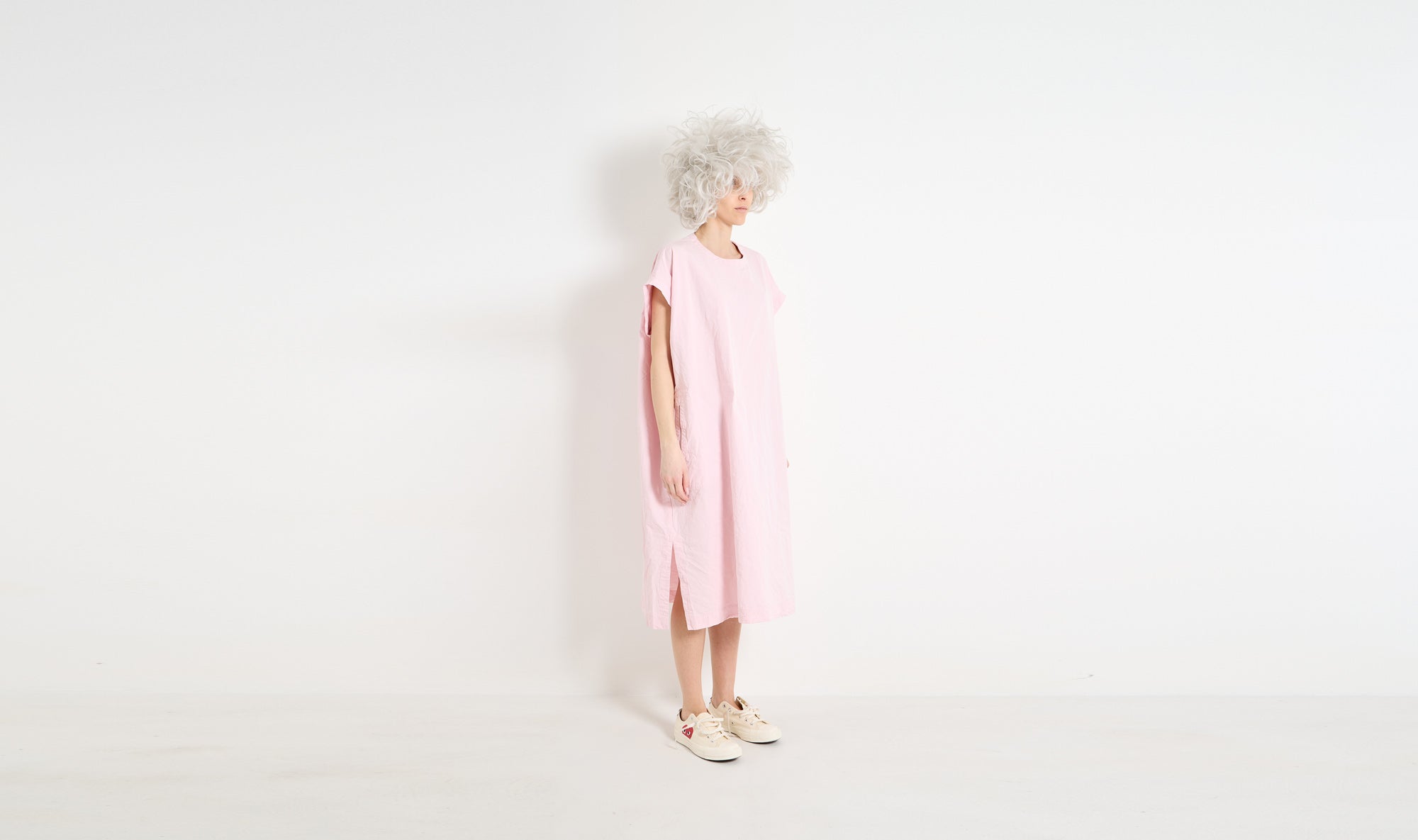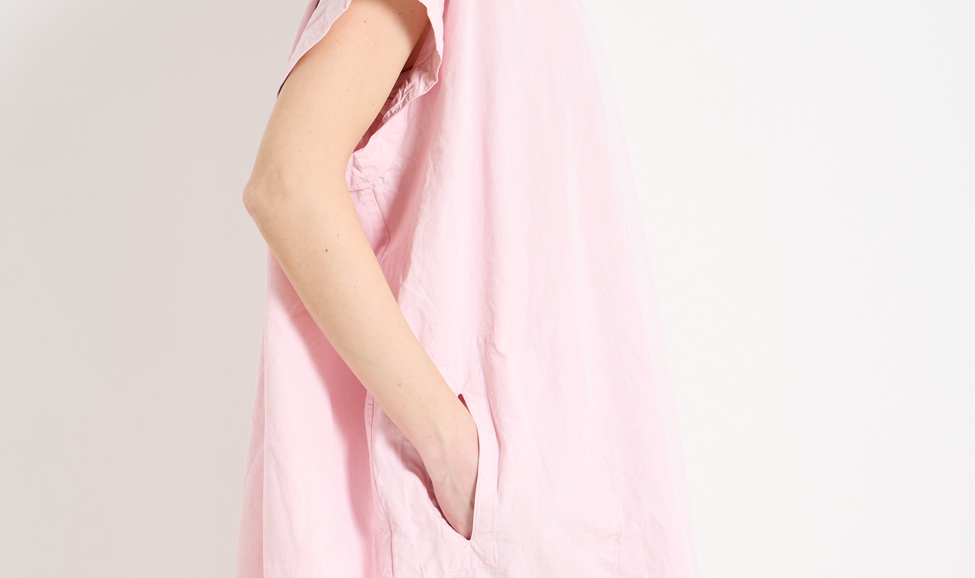 longuette dress, pink, round neckline, short sleeve, side pockets, side bottom slits