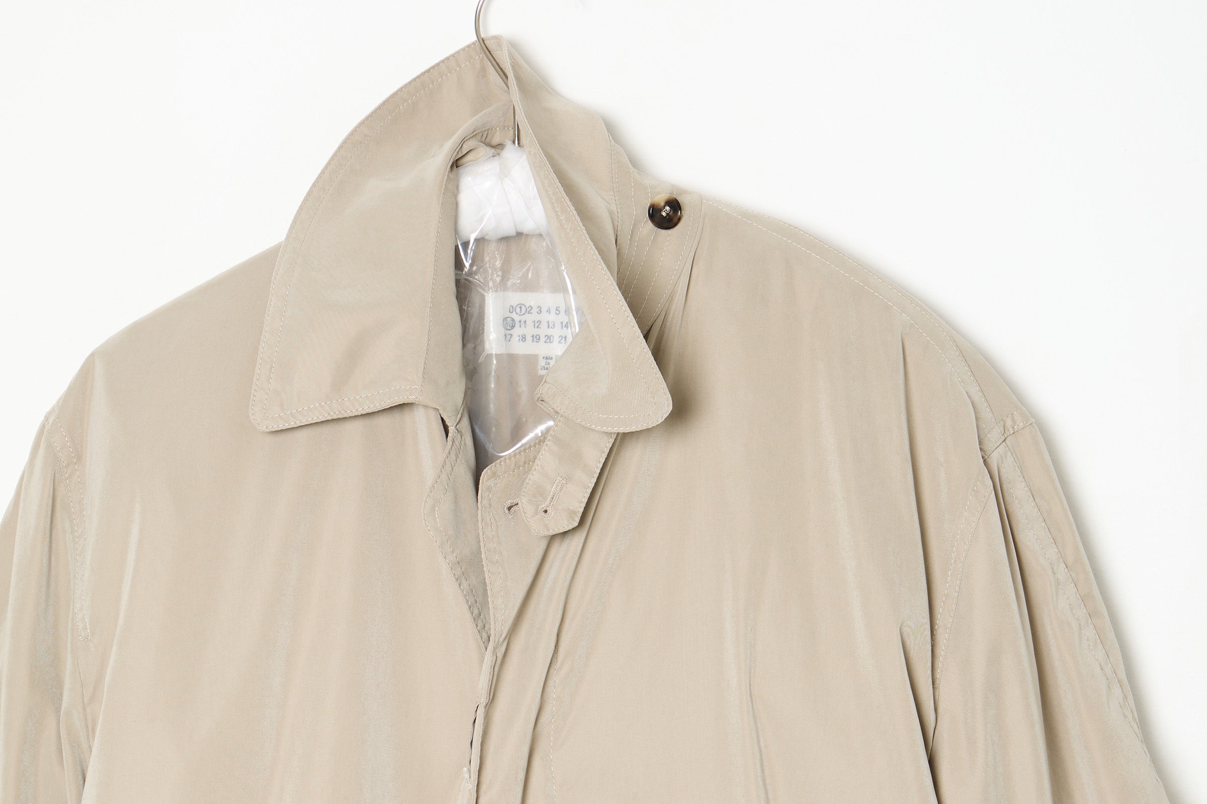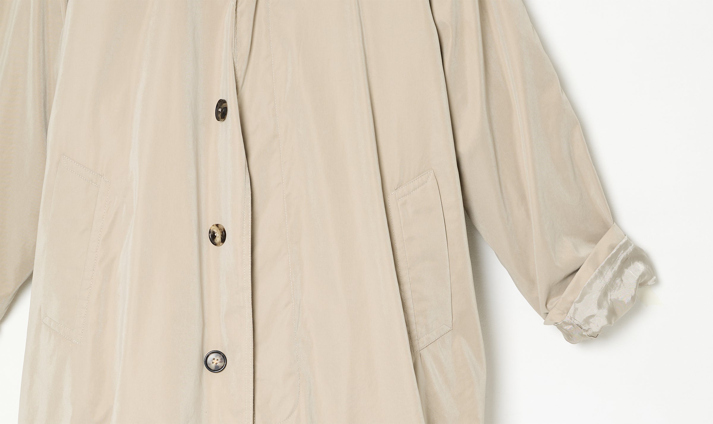 trench, sand color, mixed polyester, regular collar, buttons fastening, long sleeves with cuffs, oversized, lined in cotton