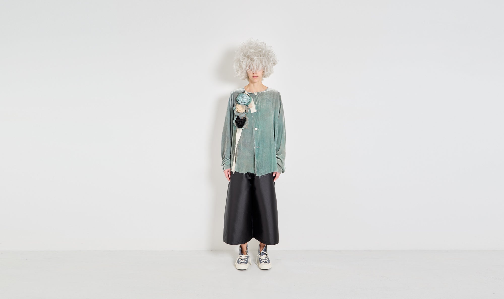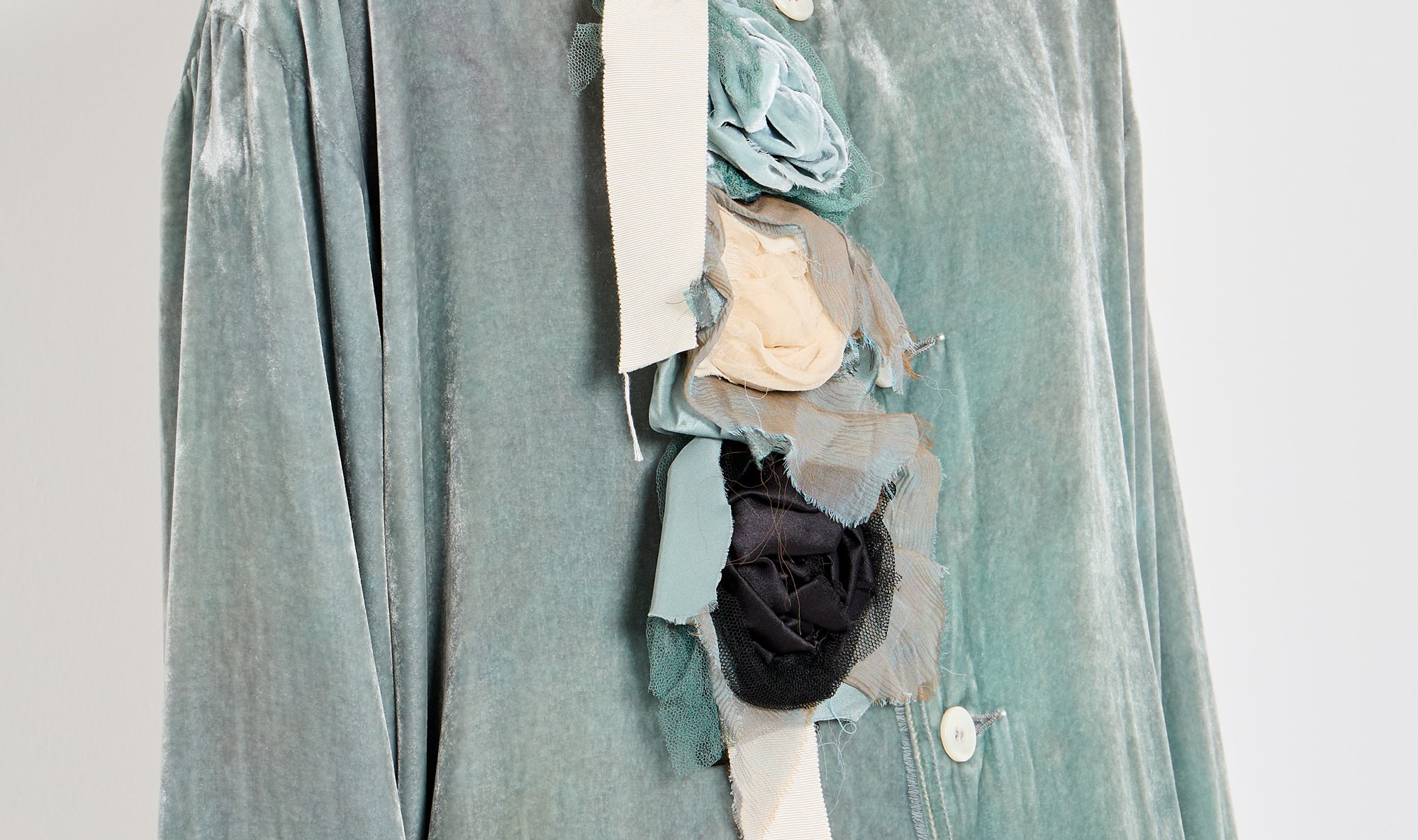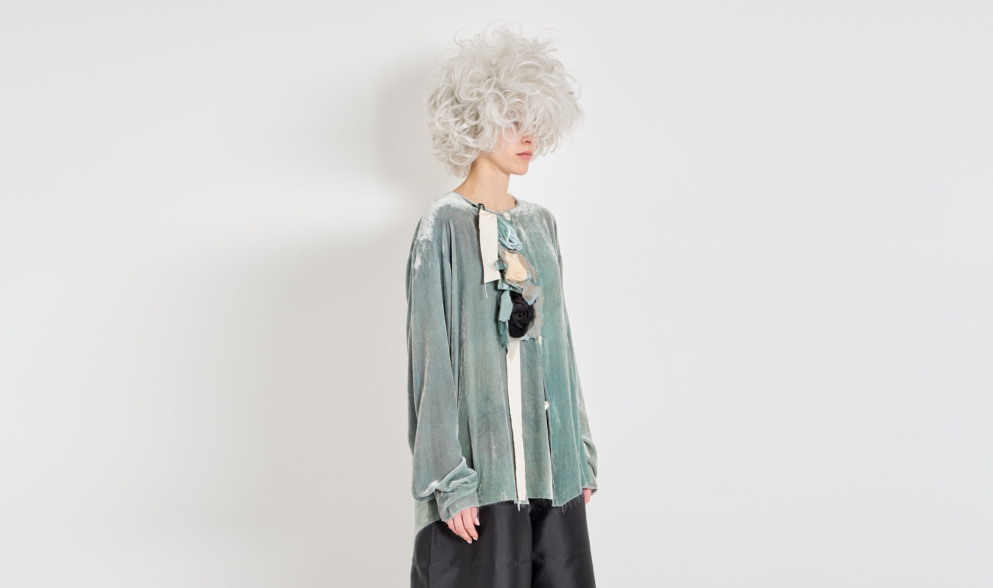 turquoise velvet shirt and brooch