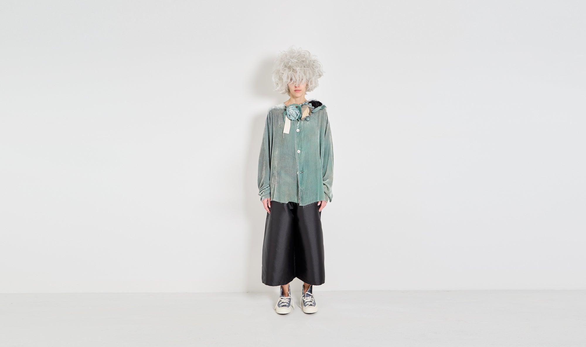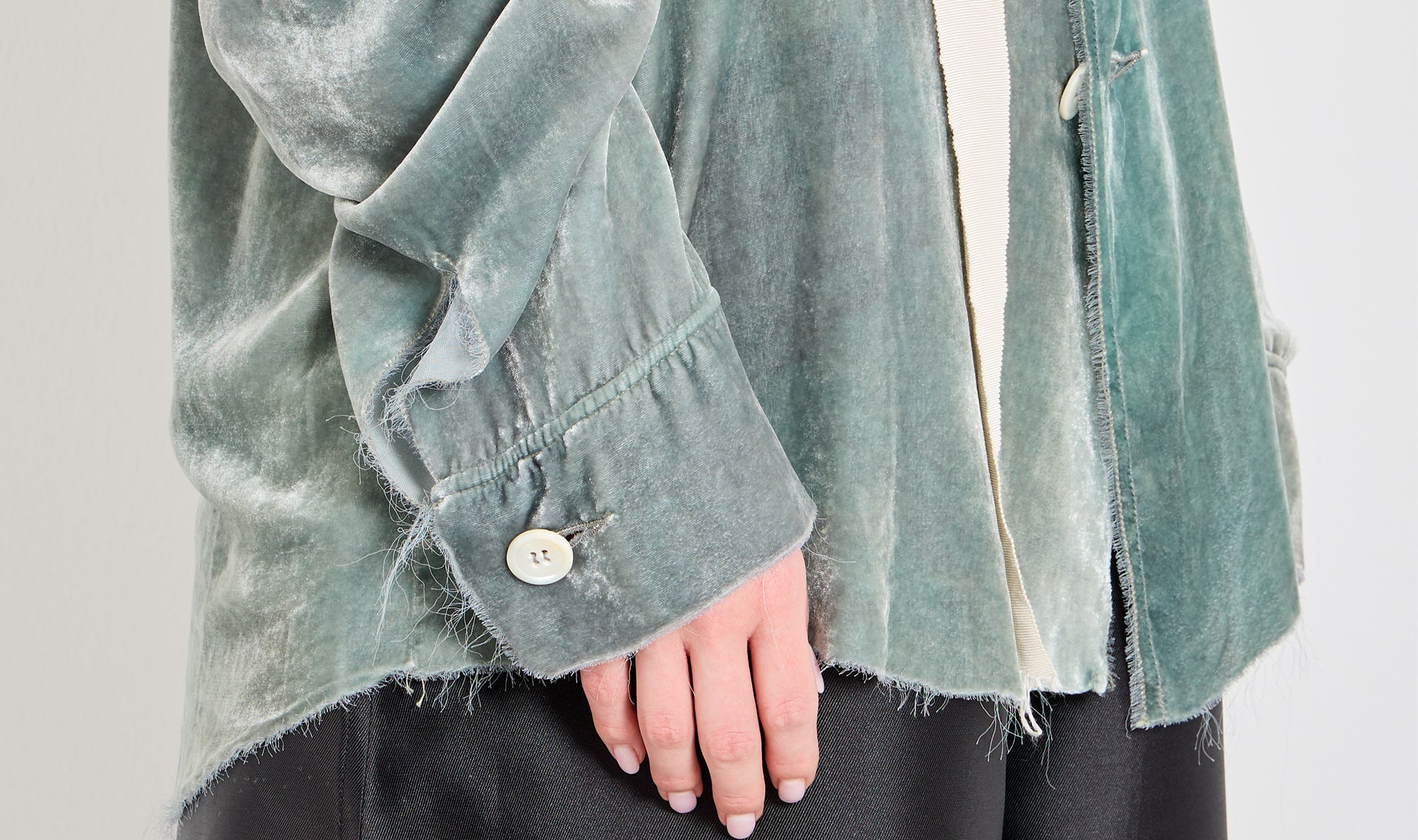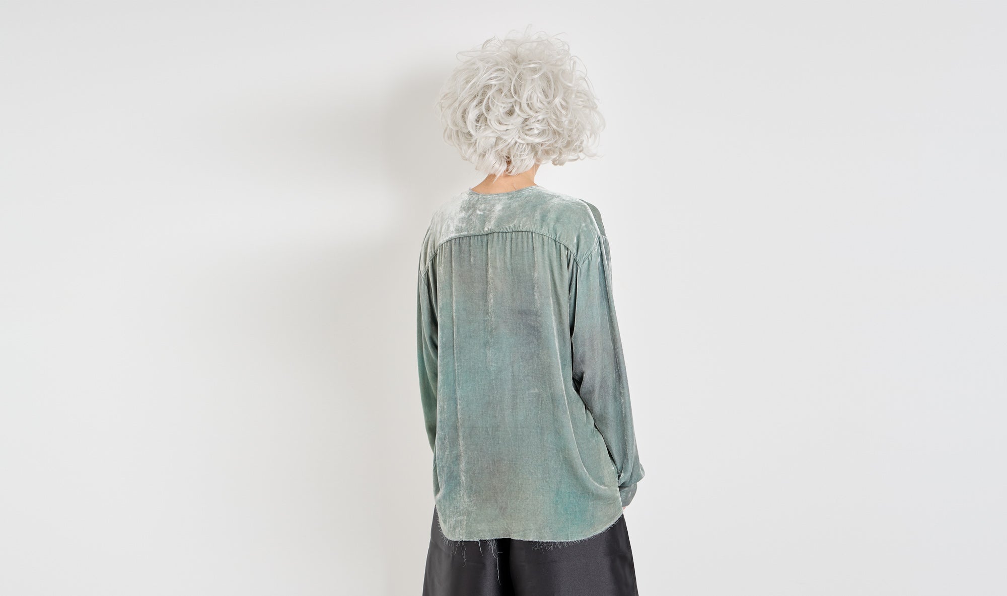 velvet shirt, washed fabric, round neckline, buttons fastening, long sleeves with cuffs