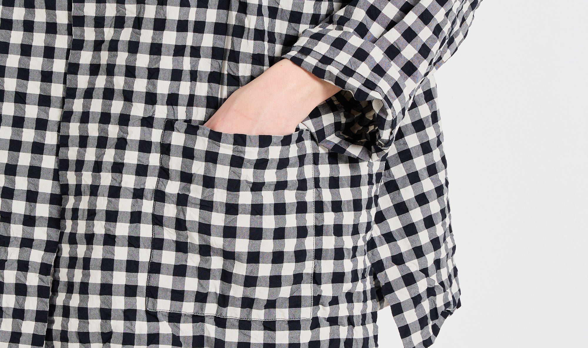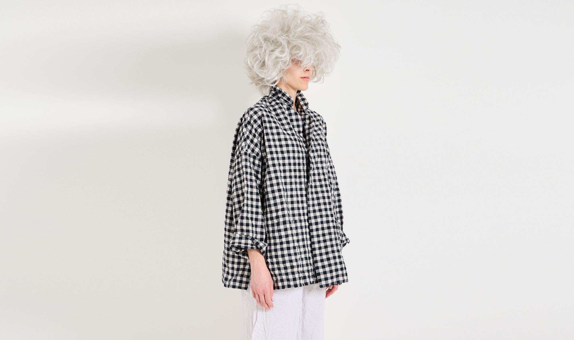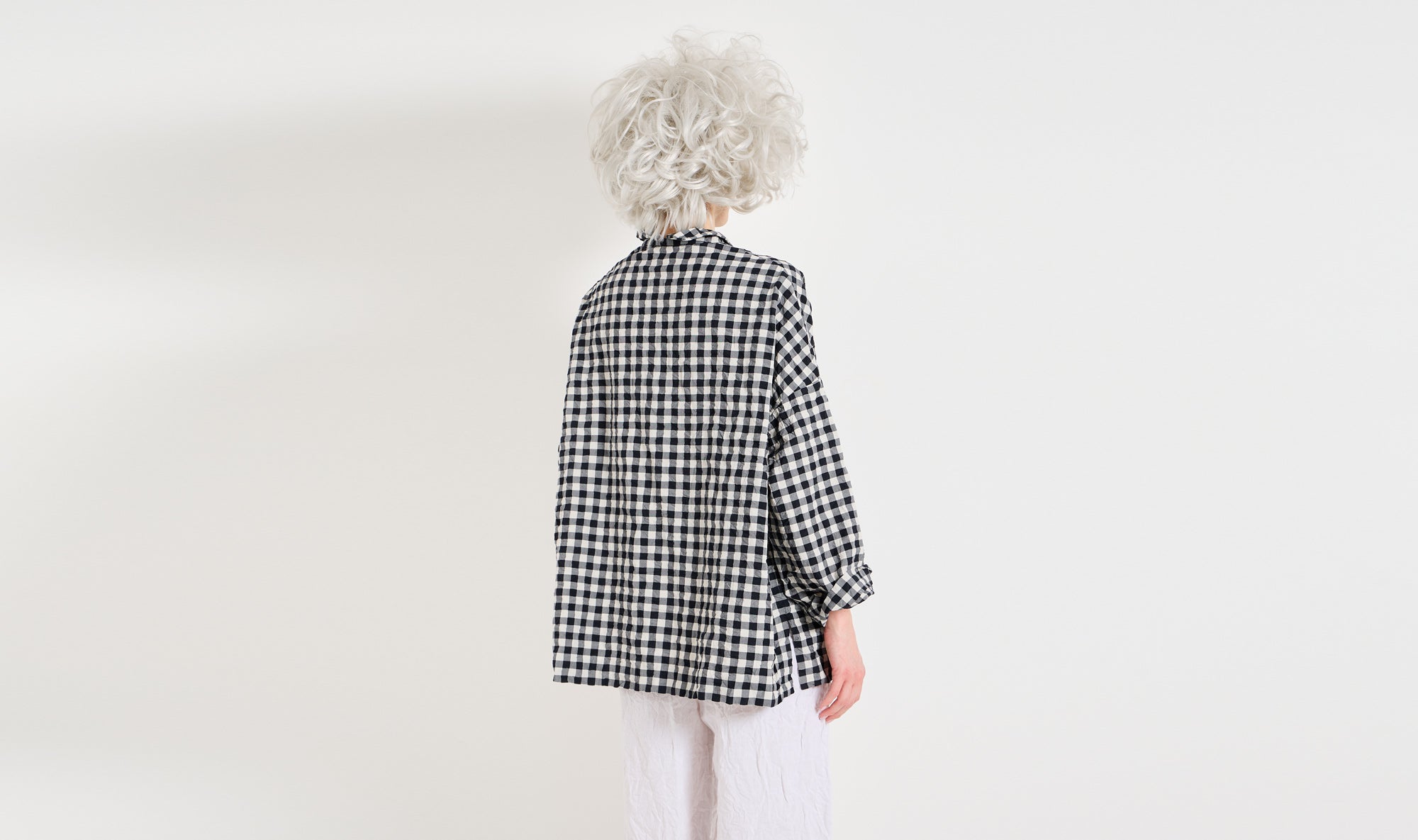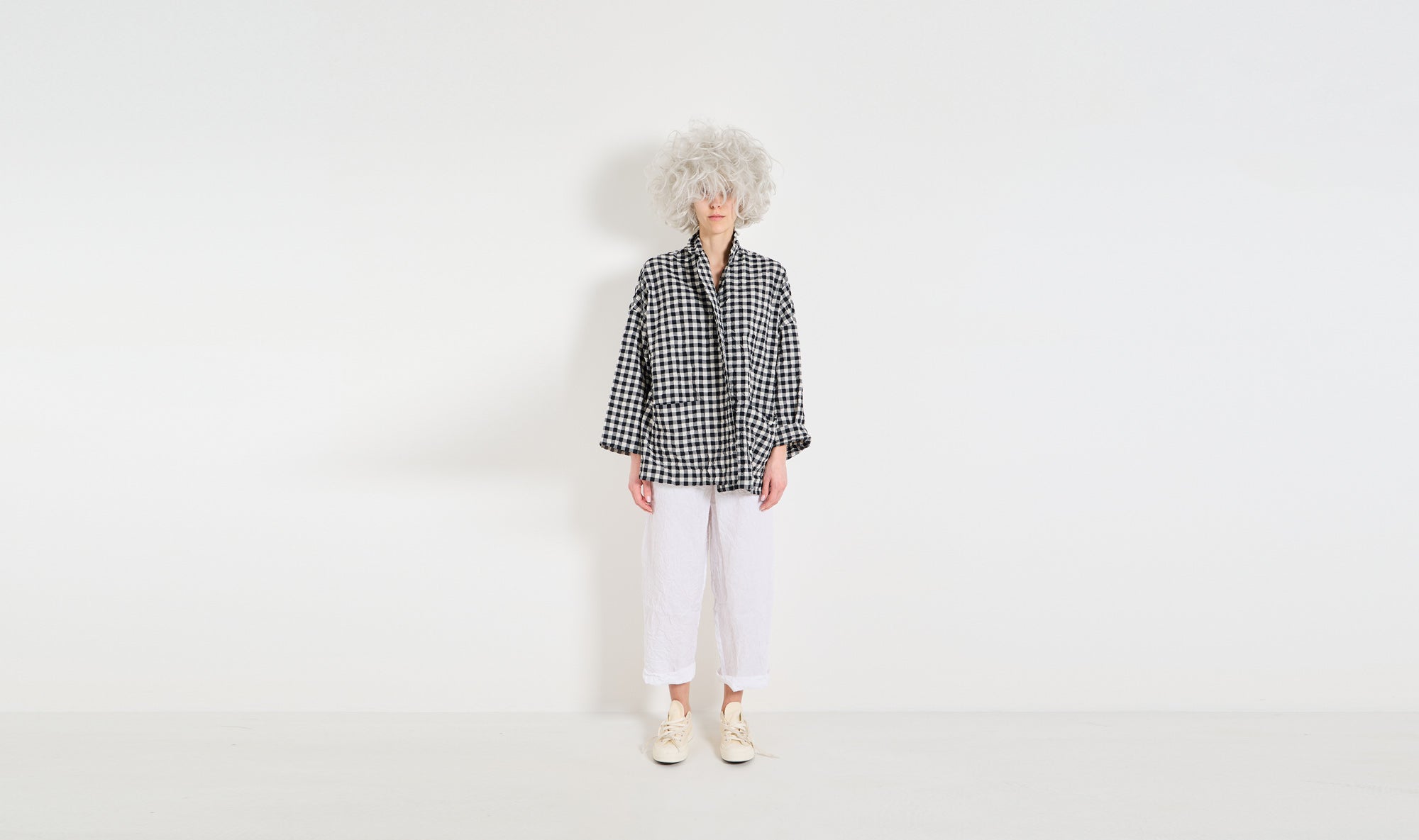 cotton jacket, white white check, open, patched pockets on the front, collar cut on the back, unlined