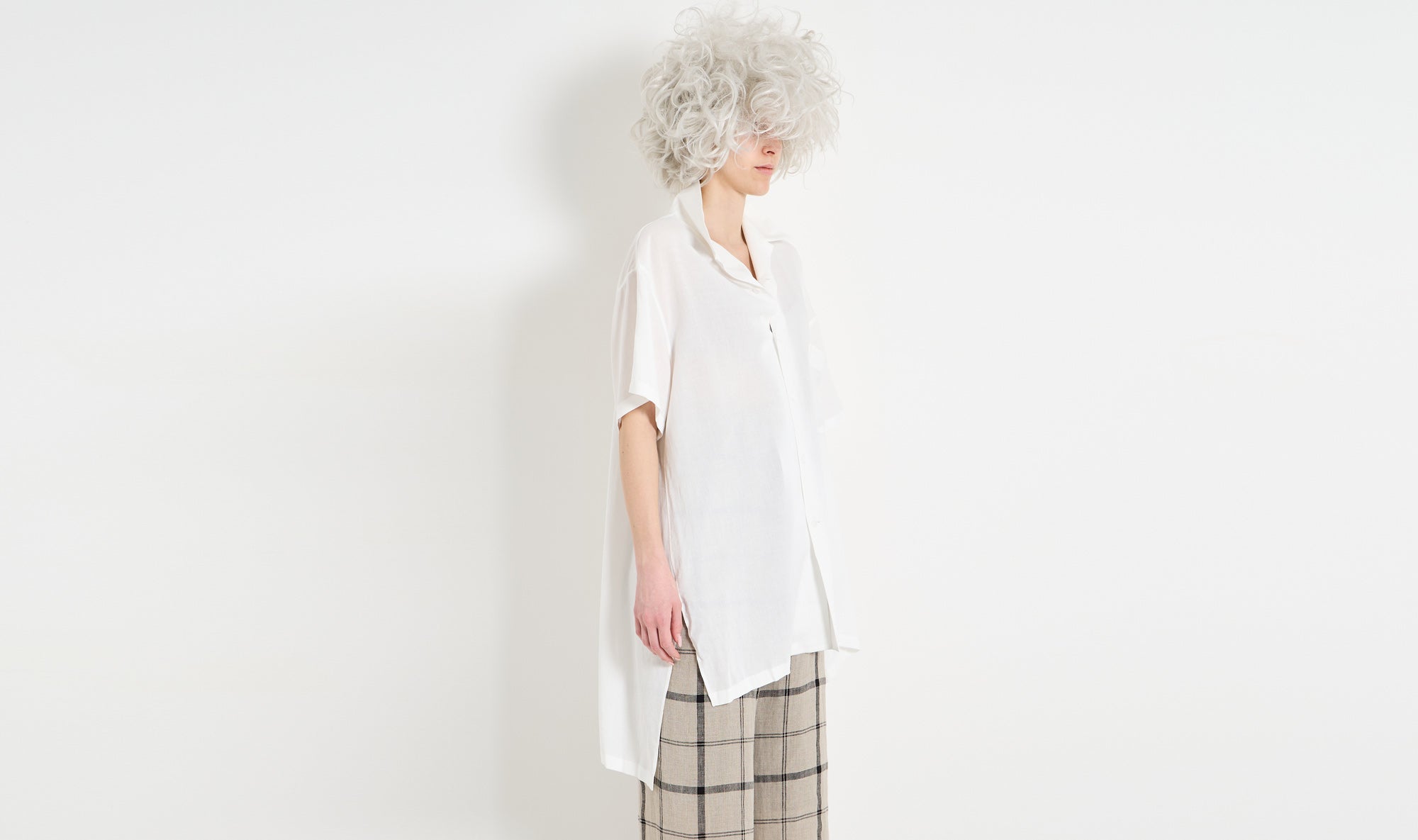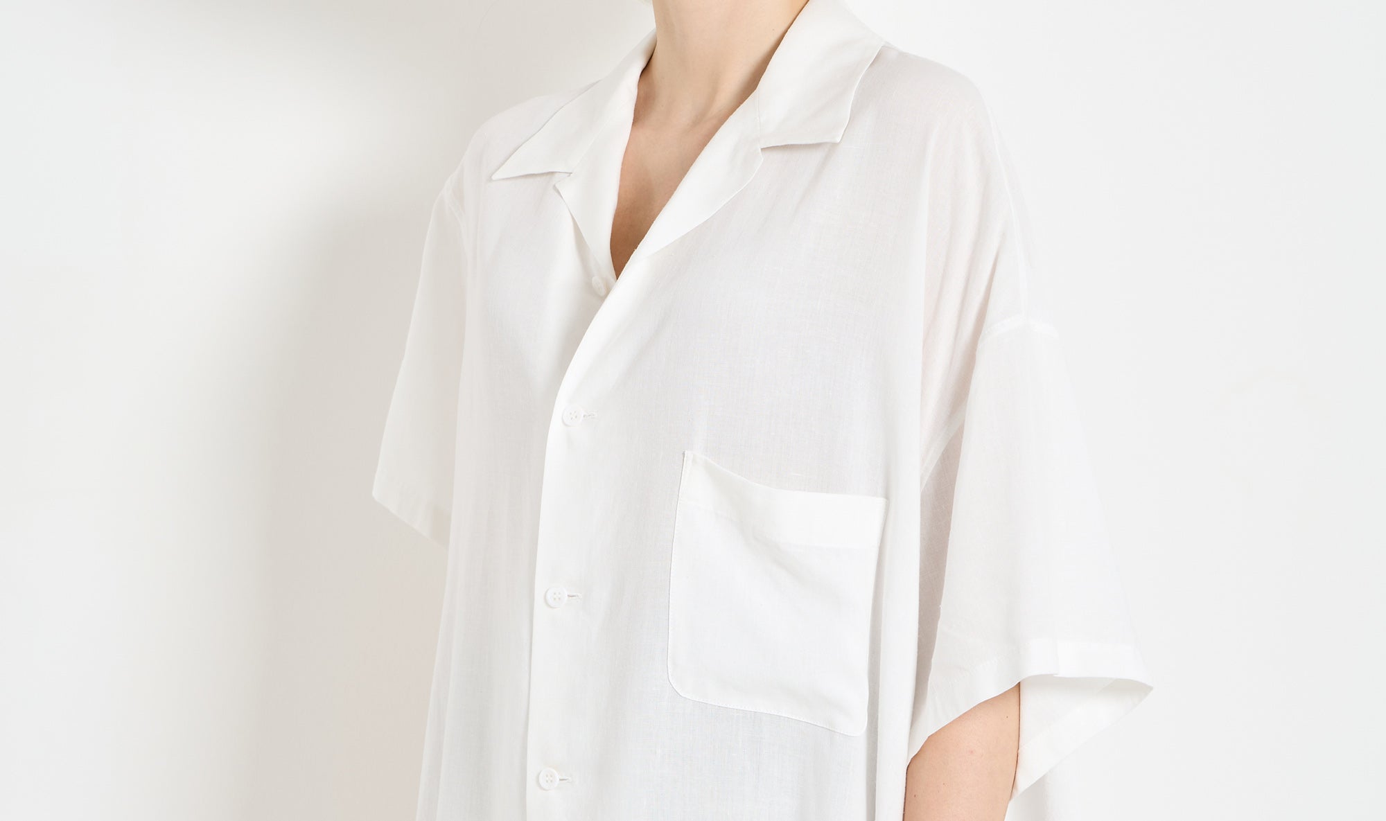 white shirt, regular collar, buttons fastening, side patched pocket, short sleeves, large