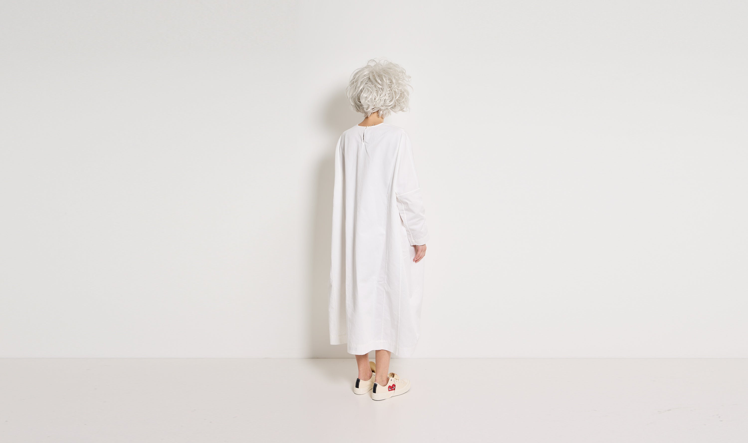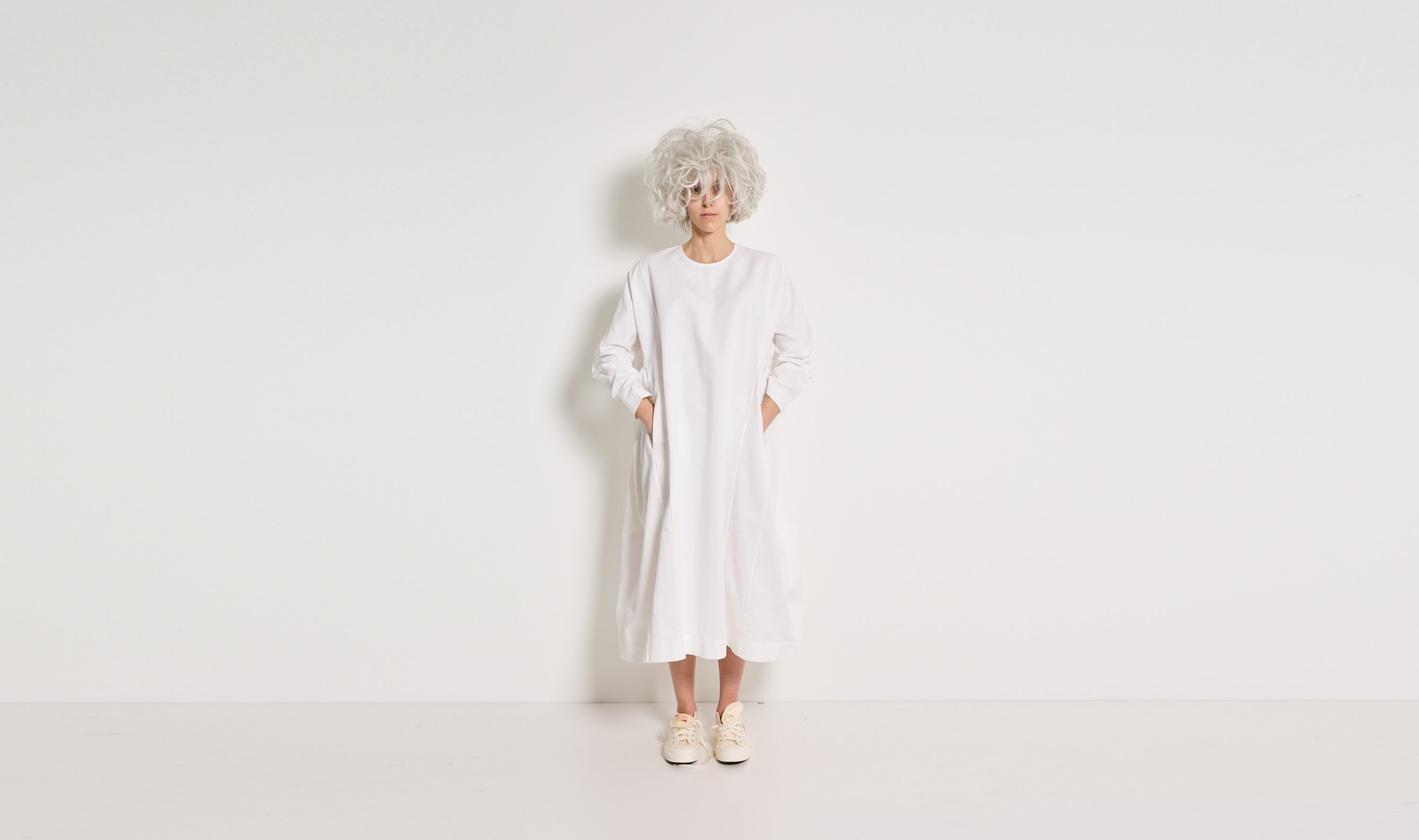 longuette dress, wrinkled heavy cotton, white, round neckline with button on the back, side curlings, side pockets, 3/4 sleeves, large