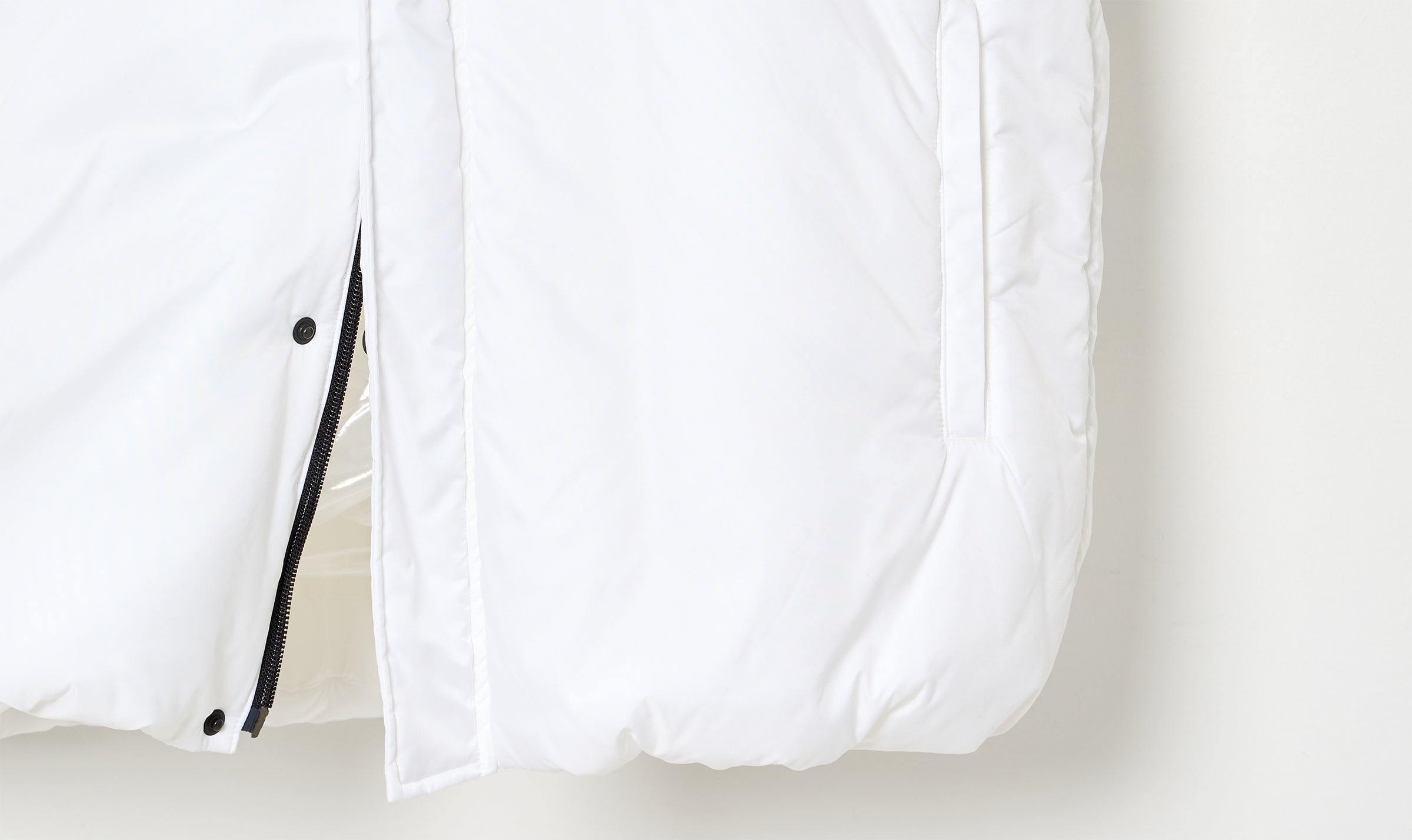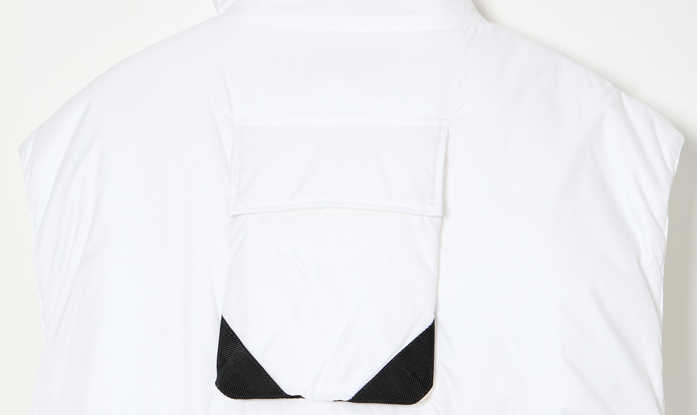 white padded waistcoat, polyester, high neck, zipper and snap buttons fastening, one patched pocket with flap on the front and one on back, side pockets on the front, black details