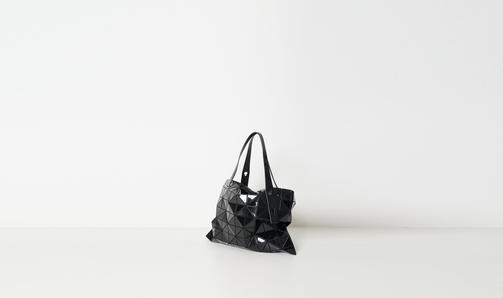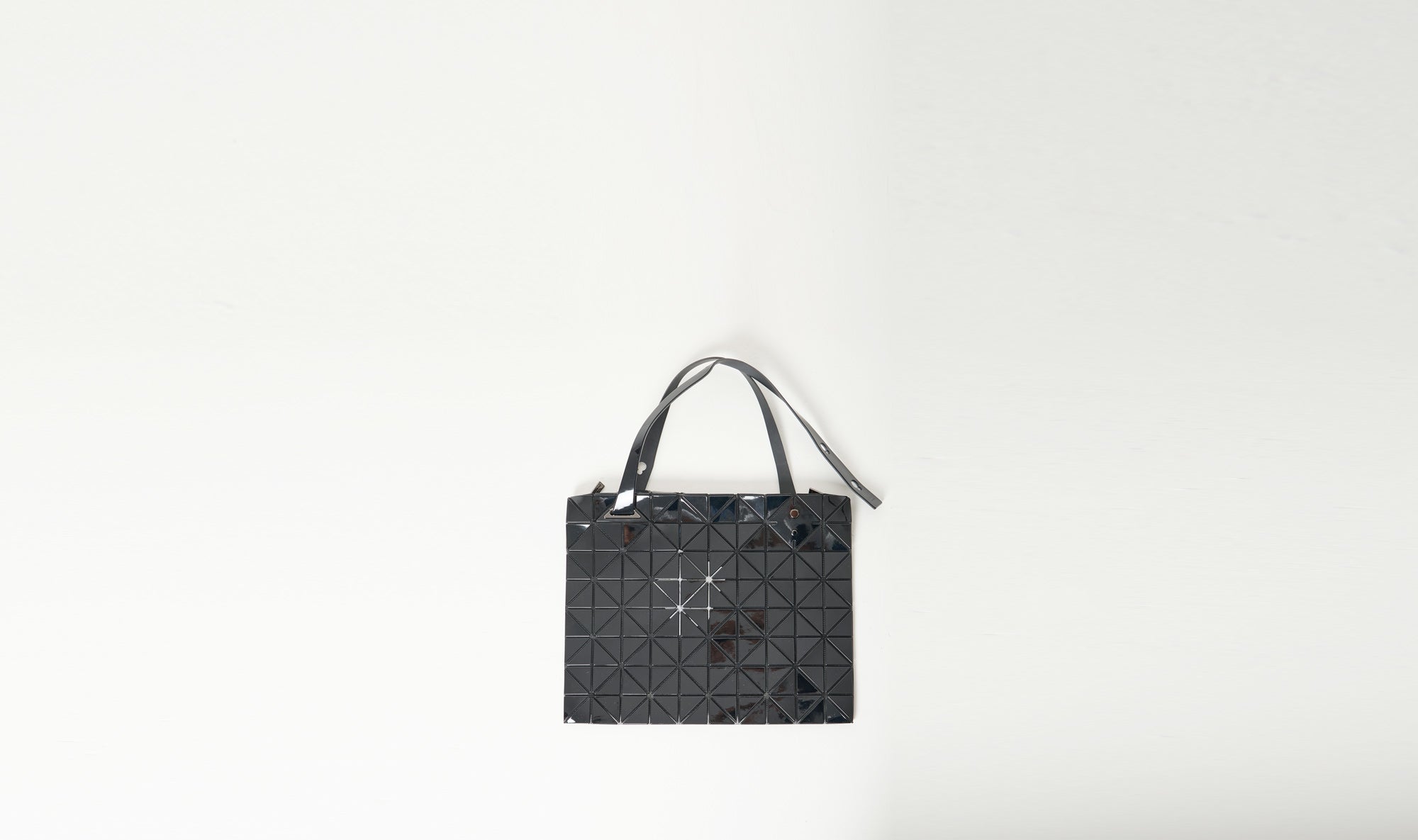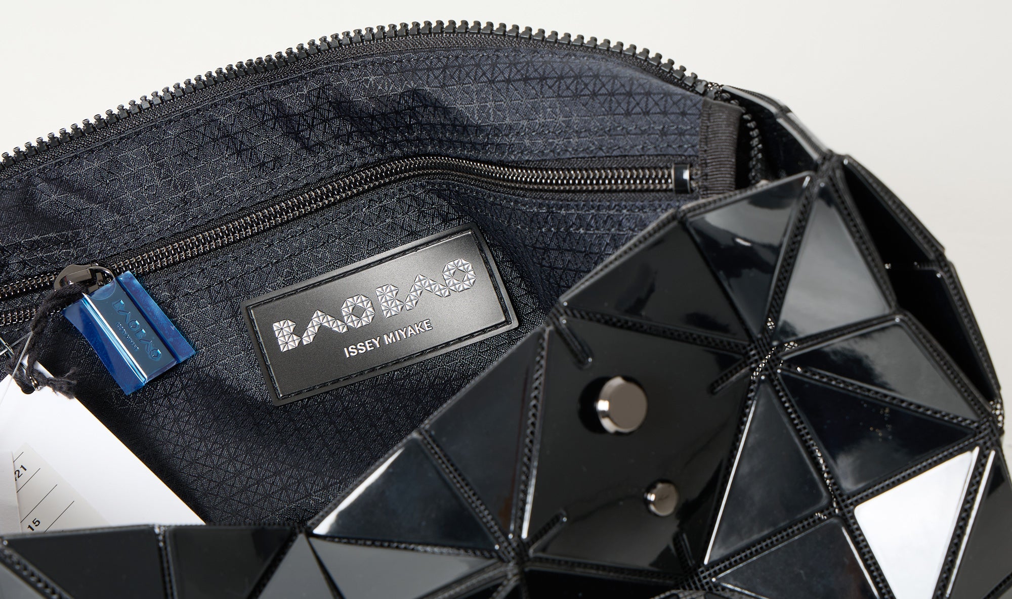 black bag, triangular panels set on a black mesh, zip fastening, internal logo, adjustable handles, internal pocket with zip