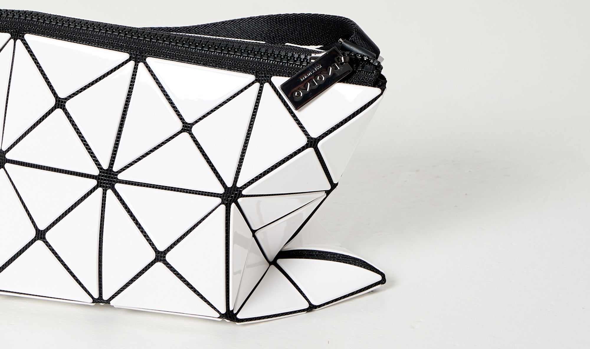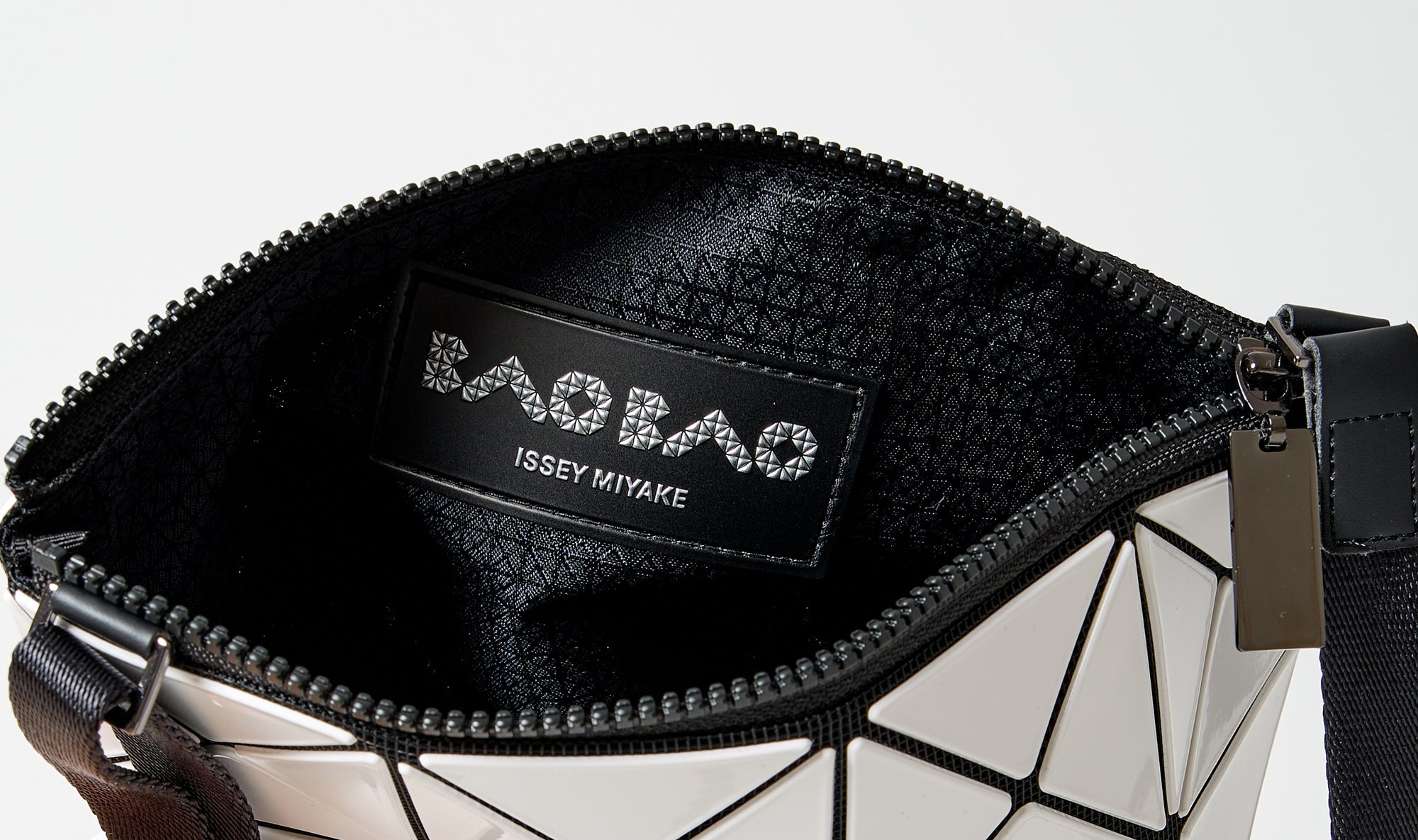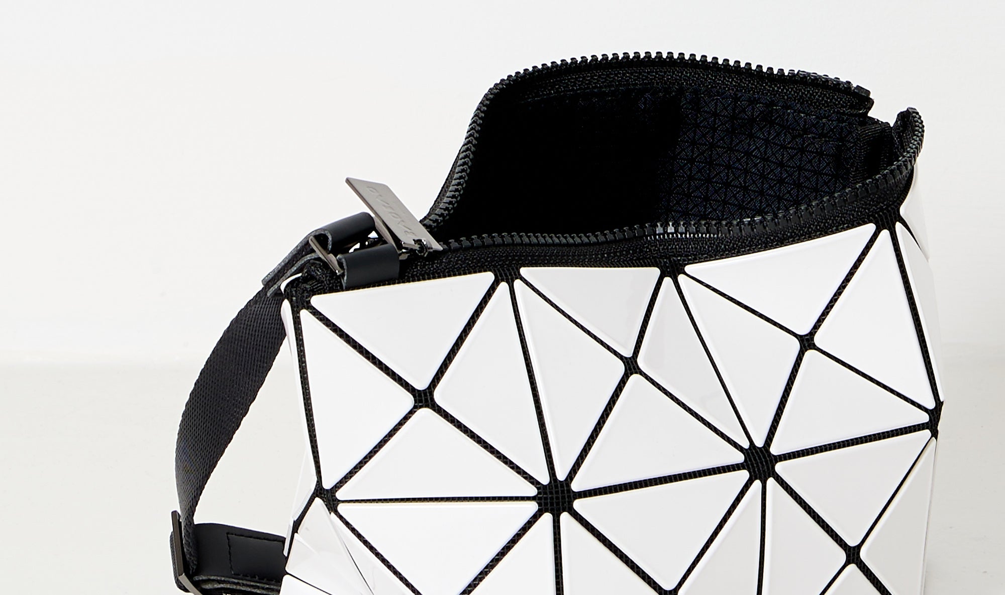 white crossbody bag, shiny triangular panels set on a black mesh, zipper fastening, internal logo, adjustable strap, internal pocket with zip